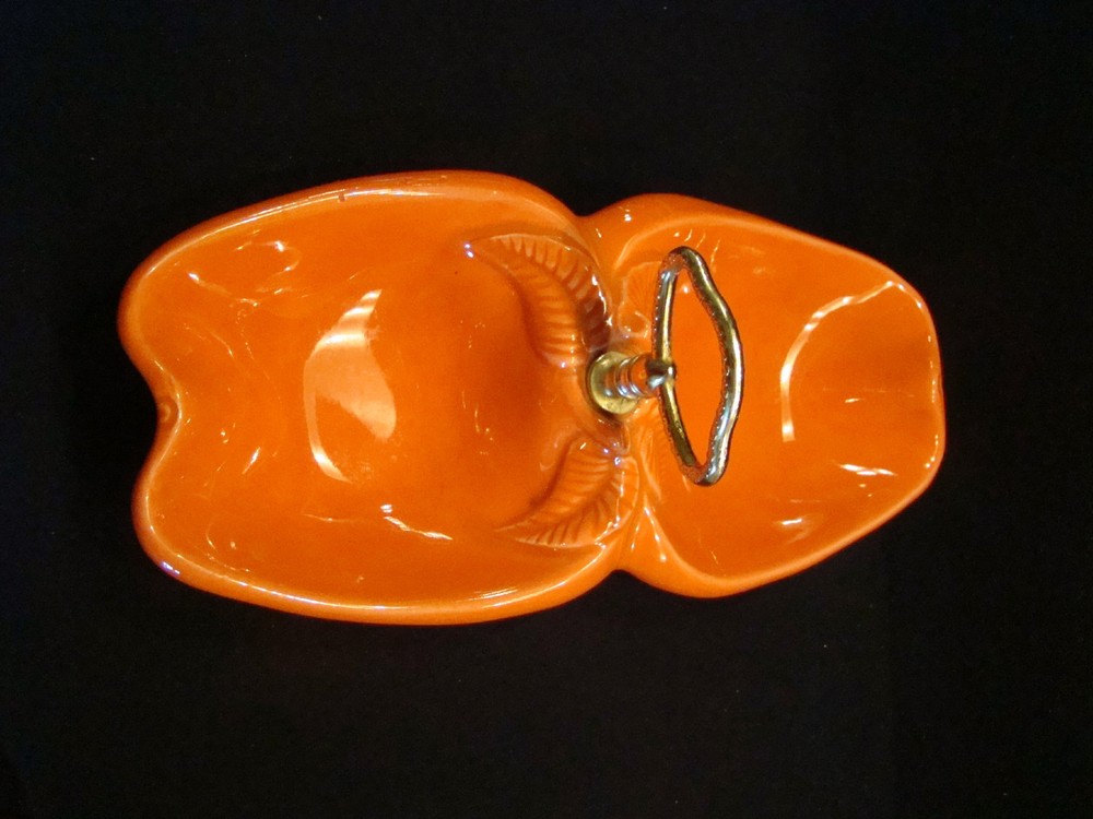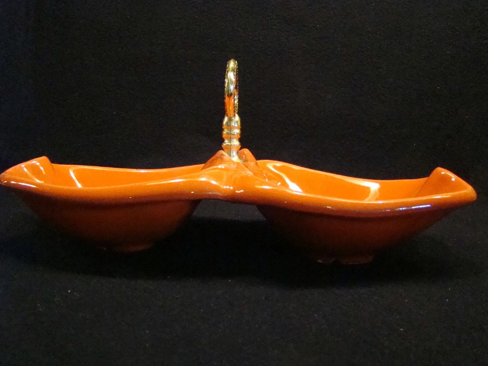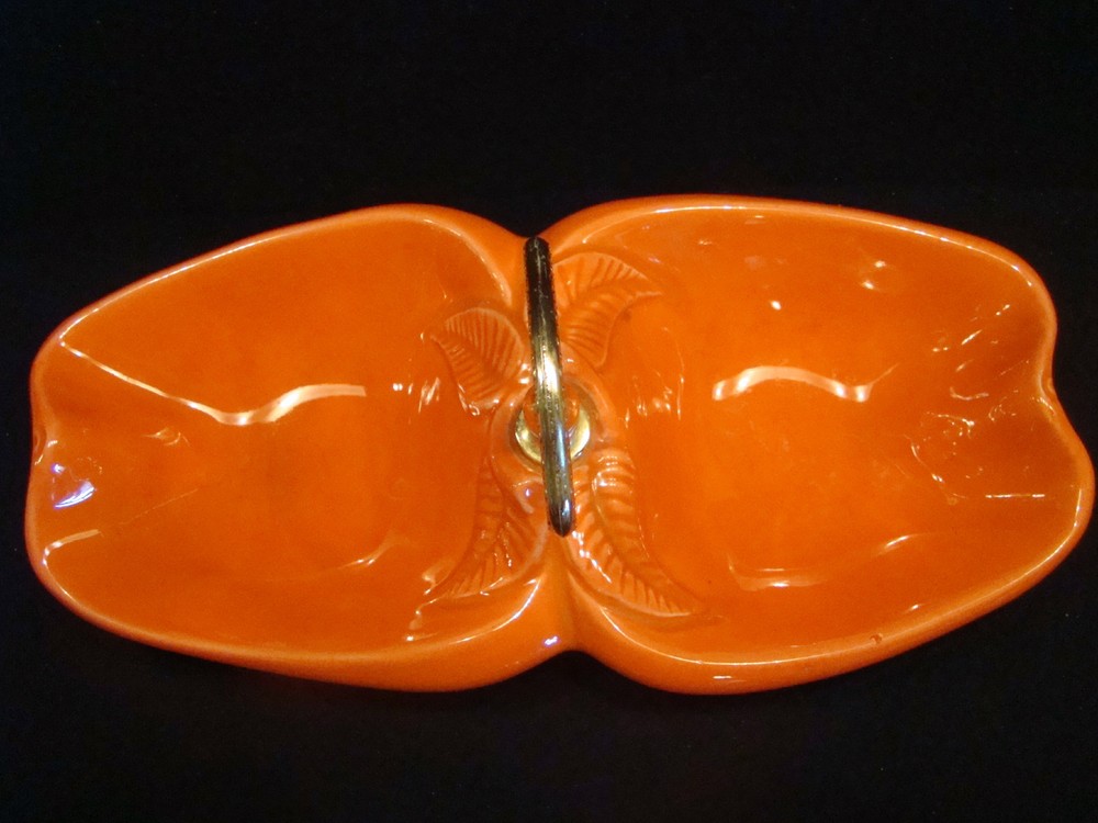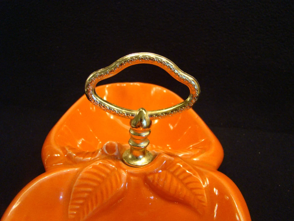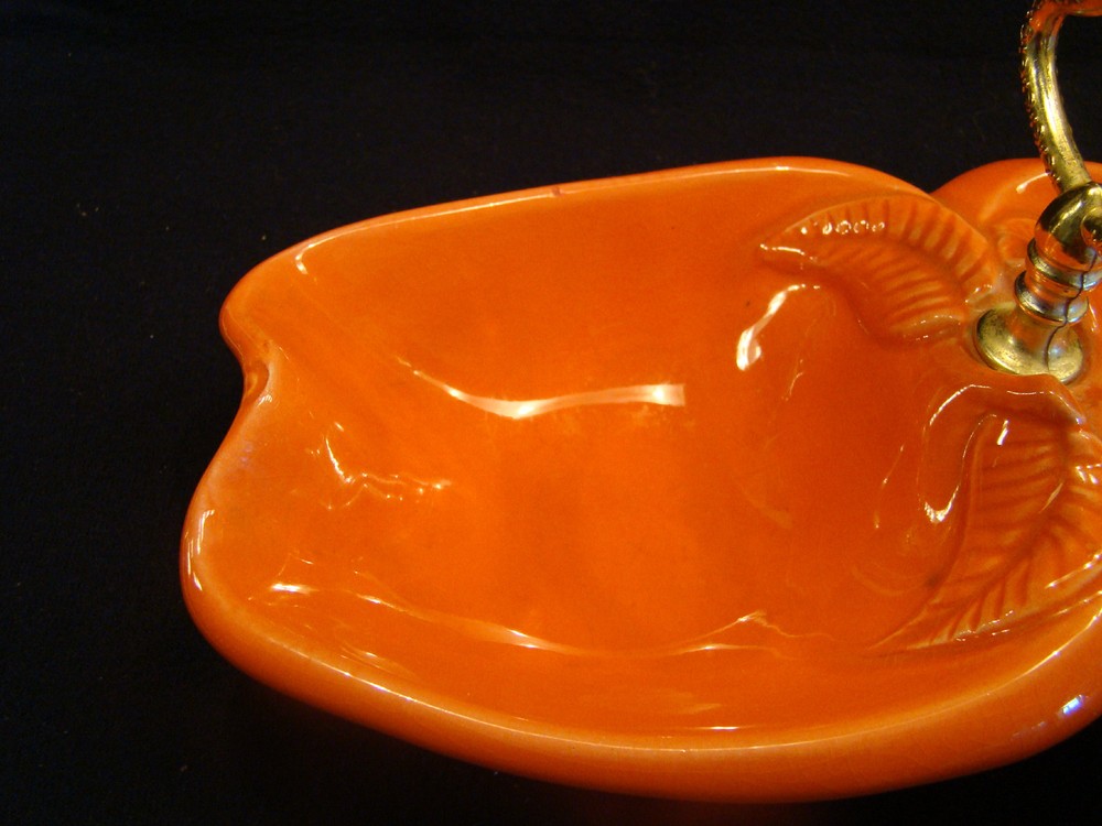 For your consideration is a Mid Century Art Deco Pottery Nut/Candy Dish with handle. It is bright orange and measures approximately 11" wide x 5" Tall with handle and 5" across. It is a Vintage dish in great condition with one tiny chip that is magnified in photo #2. Please see photos for details and don't hesitate to ask questions. Great Retro Look! California Original USA 716 Track Page Views With Auctiva's FREE Counter