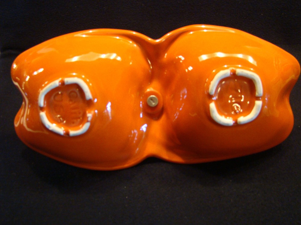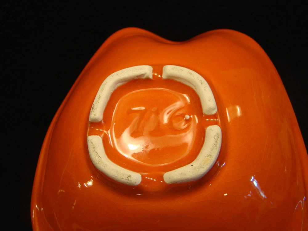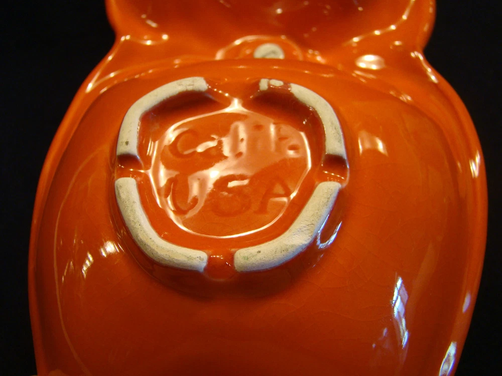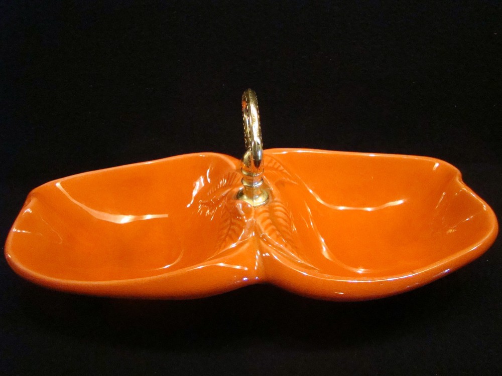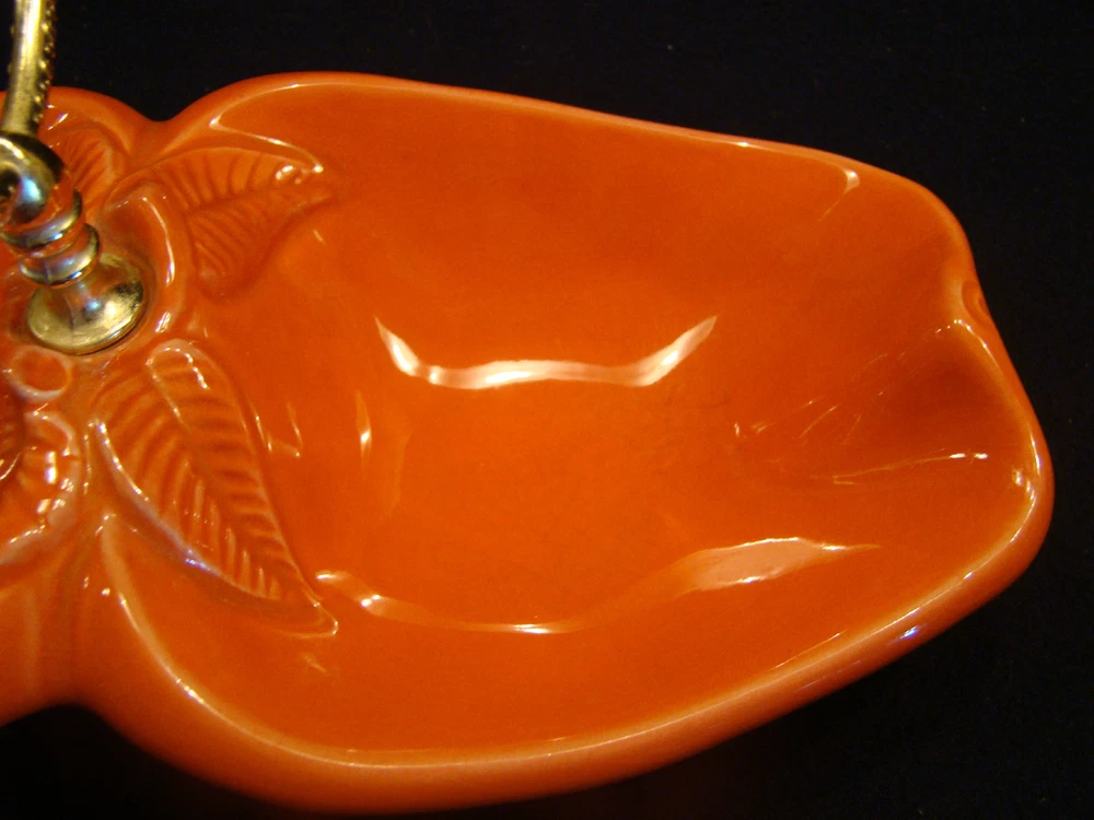 For your consideration is a Mid Century Art Deco Pottery Nut/Candy Dish with handle. It is bright orange and measures approximately 11" wide x 5" Tall with handle and 5" across. It is a Vintage dish in great condition with one tiny chip that is magnified in photo #2. Please see photos for details and don't hesitate to ask questions. Great Retro Look! California Original USA 716 Track Page Views With Auctiva's FREE Counter