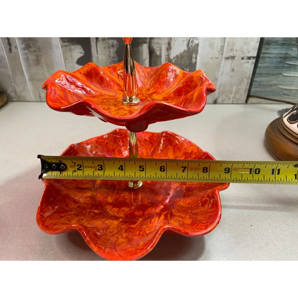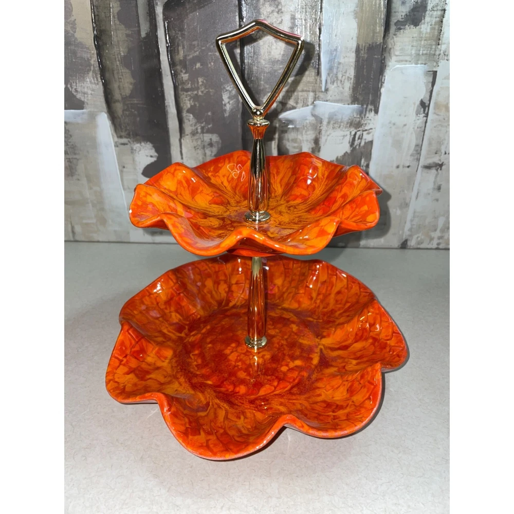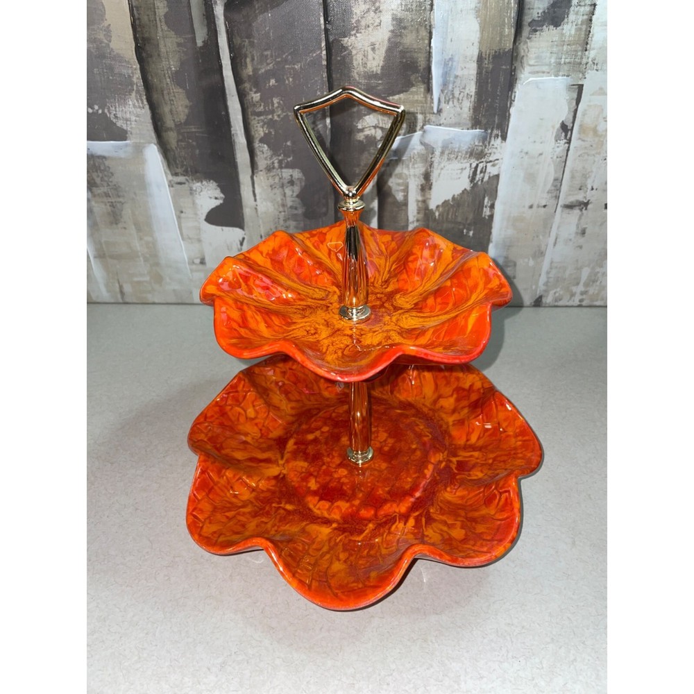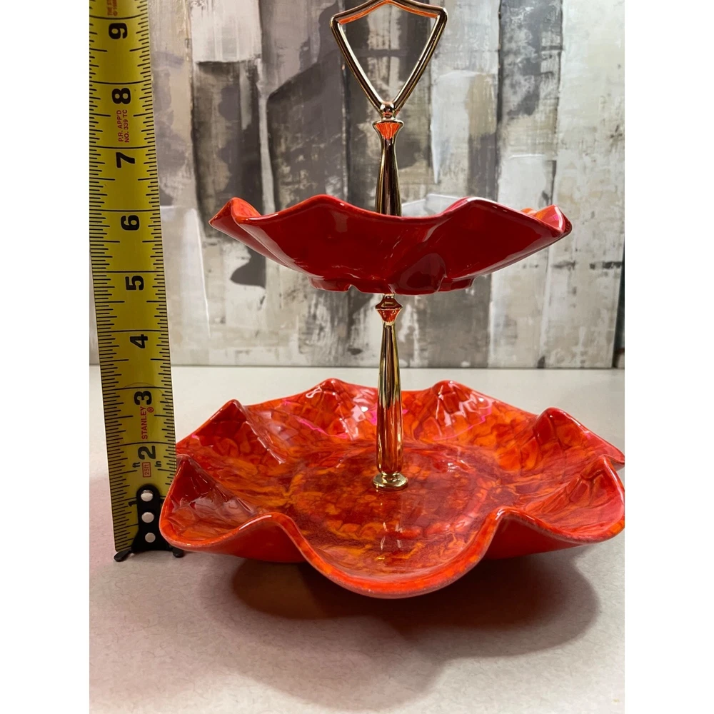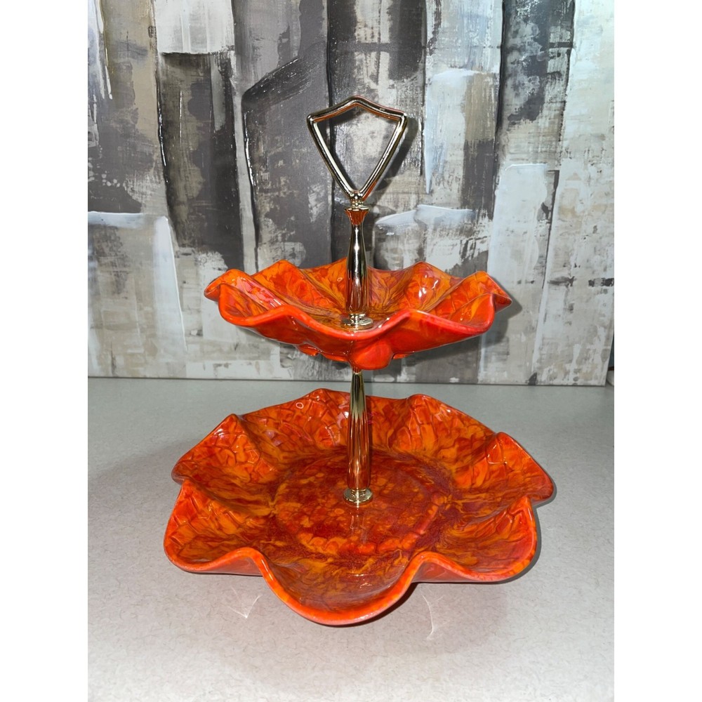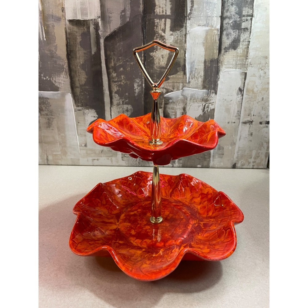 Description: Vintage California Pottery two tier tidbit server. Mid Century Modern. Red and orange drip glaze. Chip on underside of top plate, repaired. Not noticeable from above. See pics. Bottom plate diameter 9", top plate diameter 6.5". Approx 10" tall to top of handle. General Information: Photographs are part of the description. From a smoke free environment Buyer to pay actual shipping via USPS Priority Mail unless otherwise noted Payment is expected within three days Please visit my other listings for more unique items and vintage collectibles. Please save to favorites if you like what you see...new items added almost daily. Thank you for your patronage.