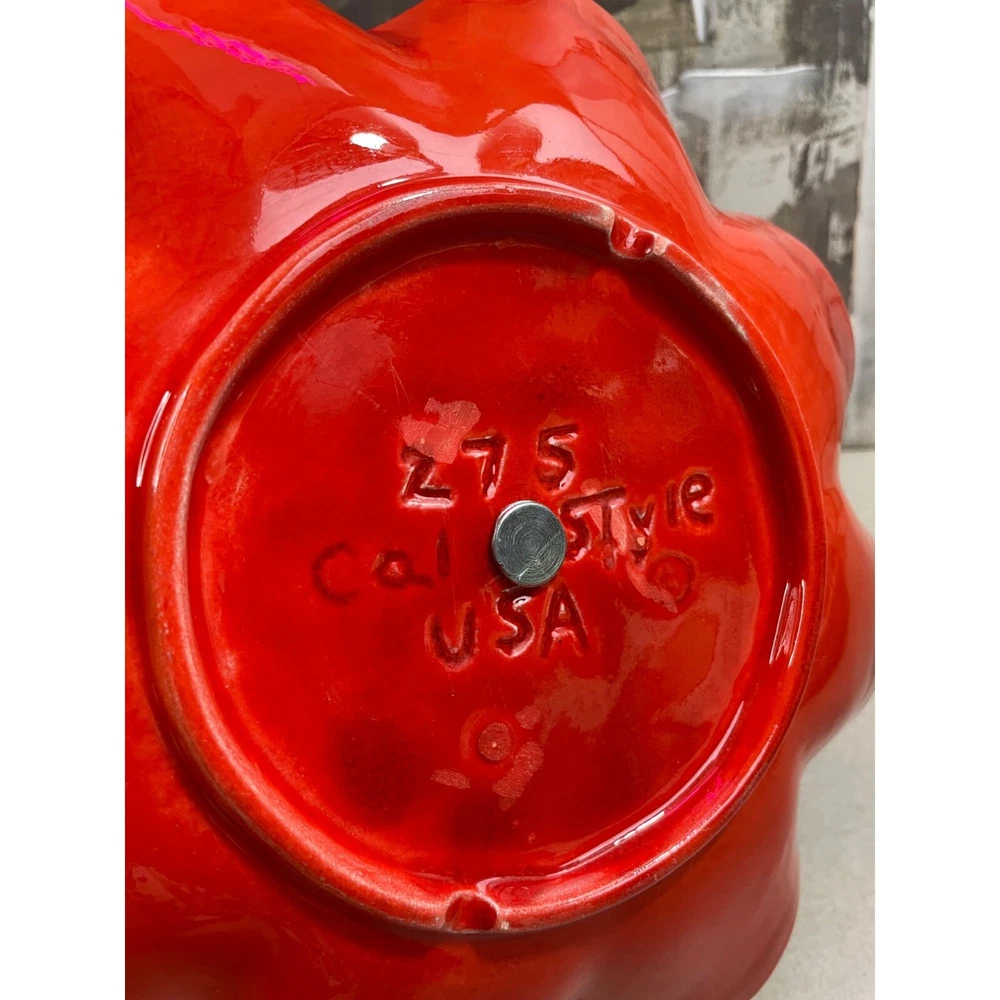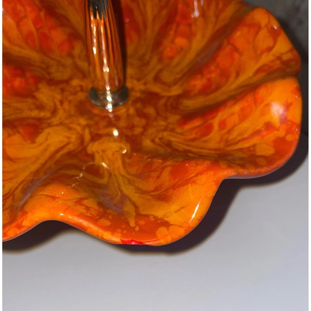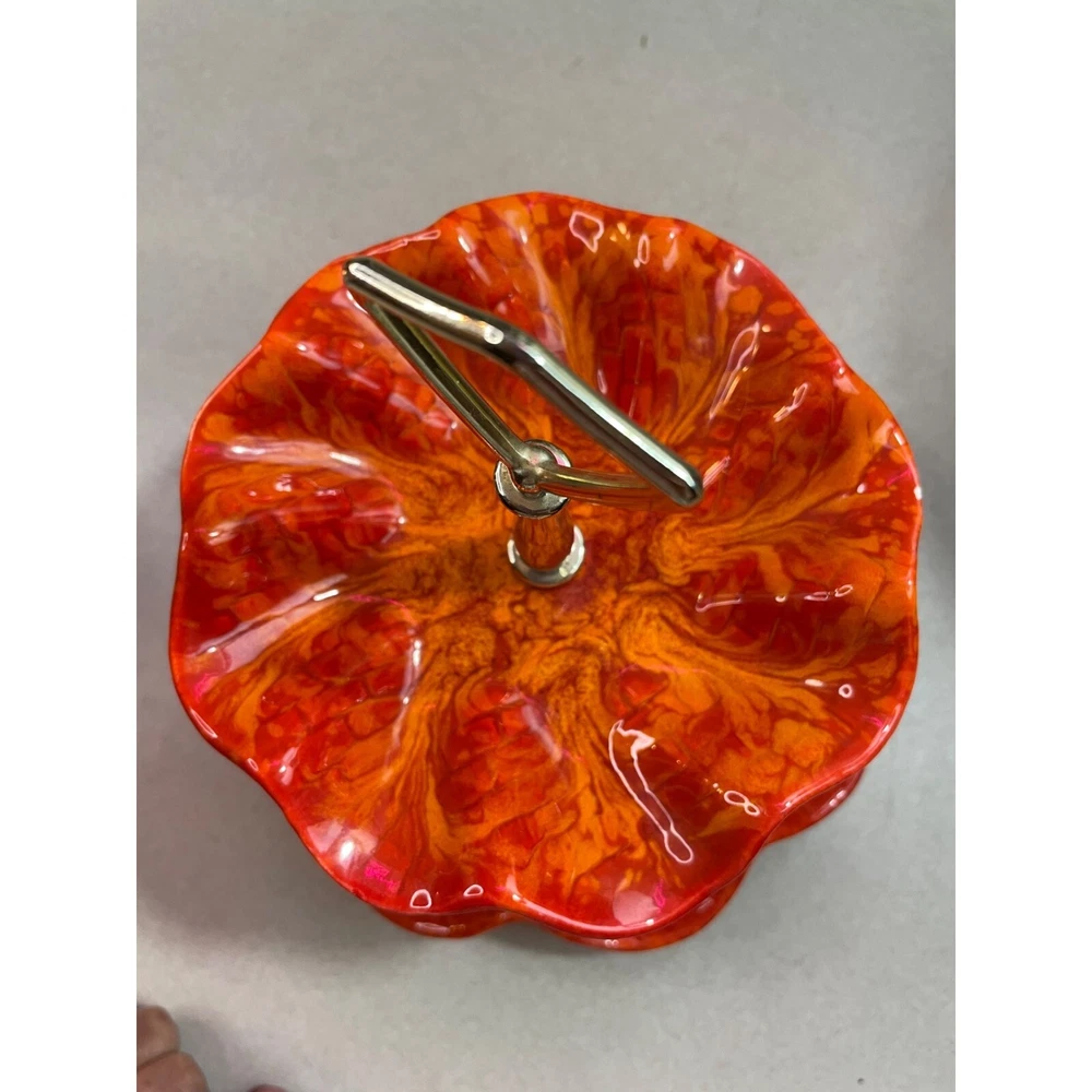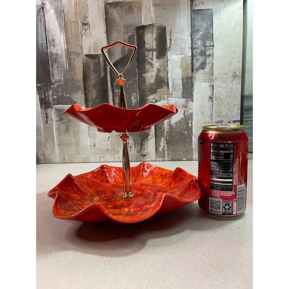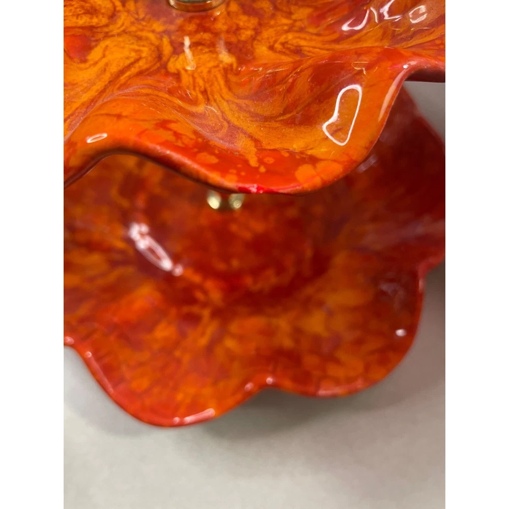 Description: Vintage California Pottery two tier tidbit server. Mid Century Modern. Red and orange drip glaze. Chip on underside of top plate, repaired. Not noticeable from above. See pics. Bottom plate diameter 9", top plate diameter 6.5". Approx 10" tall to top of handle. General Information: Photographs are part of the description. From a smoke free environment Buyer to pay actual shipping via USPS Priority Mail unless otherwise noted Payment is expected within three days Please visit my other listings for more unique items and vintage collectibles. Please save to favorites if you like what you see...new items added almost daily. Thank you for your patronage.