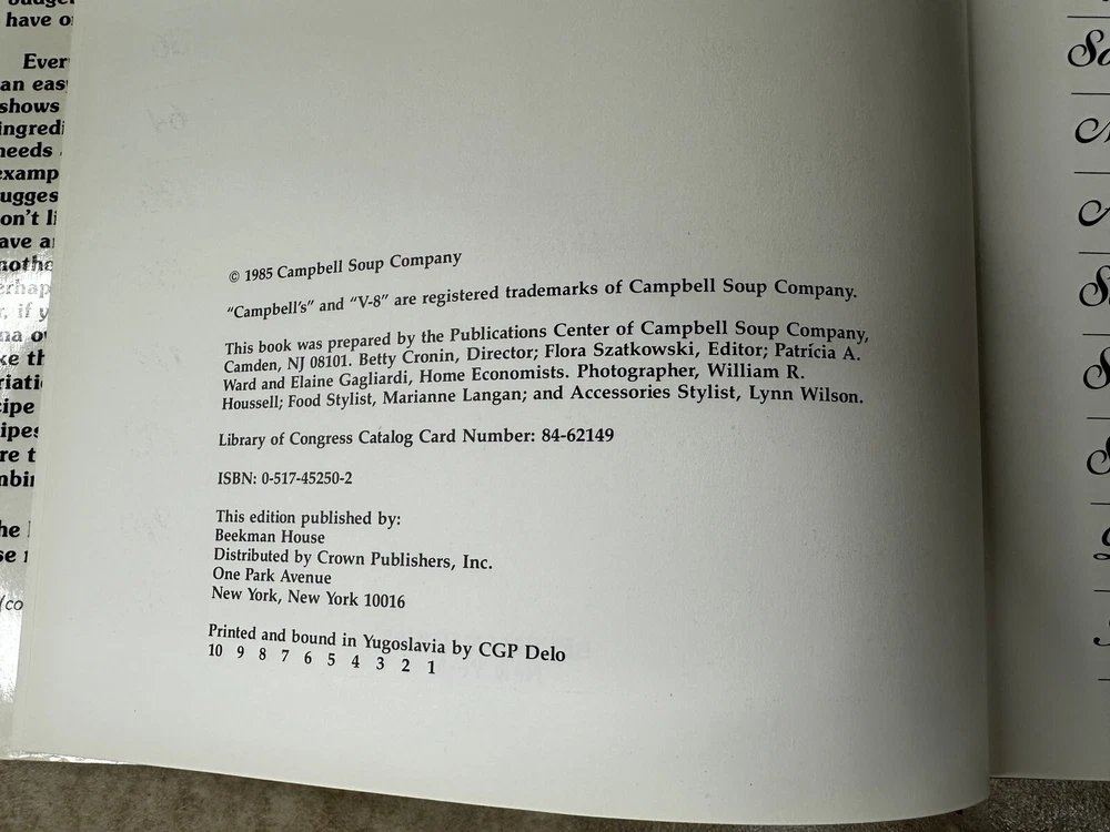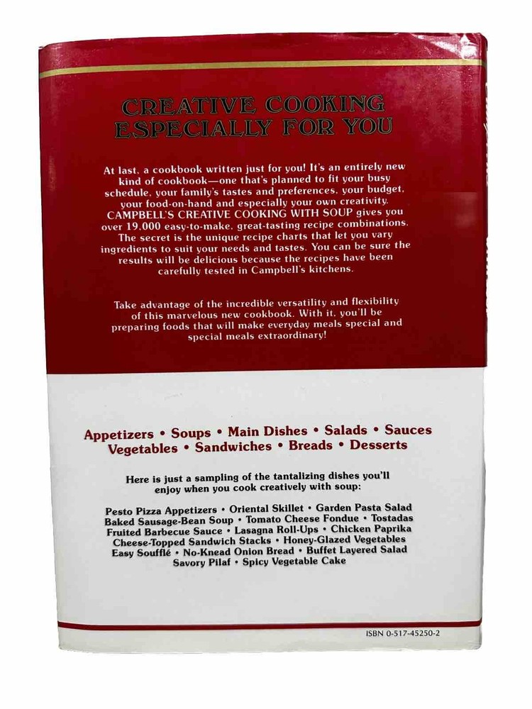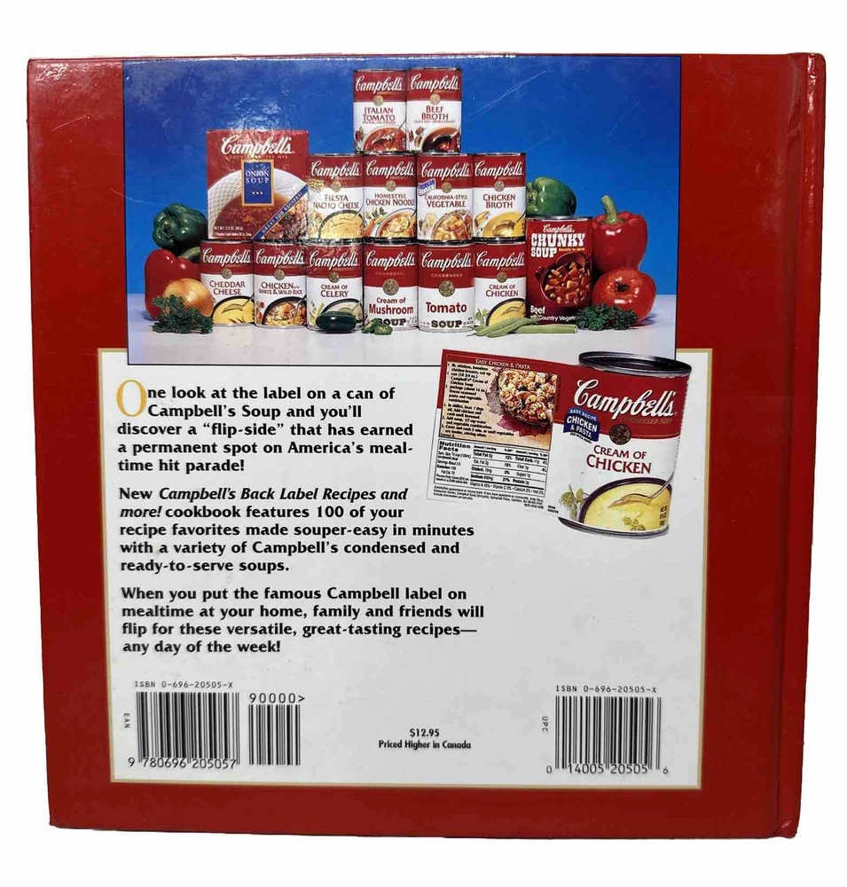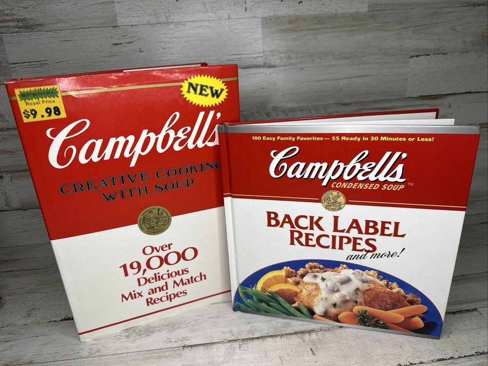 Very nice Campbell's Soup Recipes books, both hard cover. The first book is Campbell’s Creative Cooking with Soup. This is the first edition of the book made in 1985 and would be great for any collection. The book also has the original price still on the book from 1985. The book itself is in really good condition, all the pages are in the book and free of tears or rips. The second book is Back Label Recipes and More! This book is from 1995. Please see the photos for condition and details. Any questions, please reach out. Thank you!