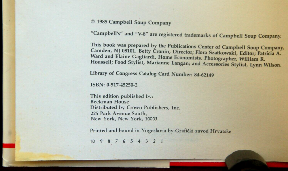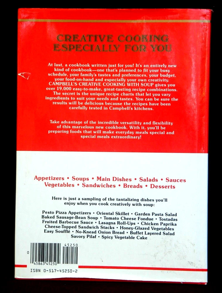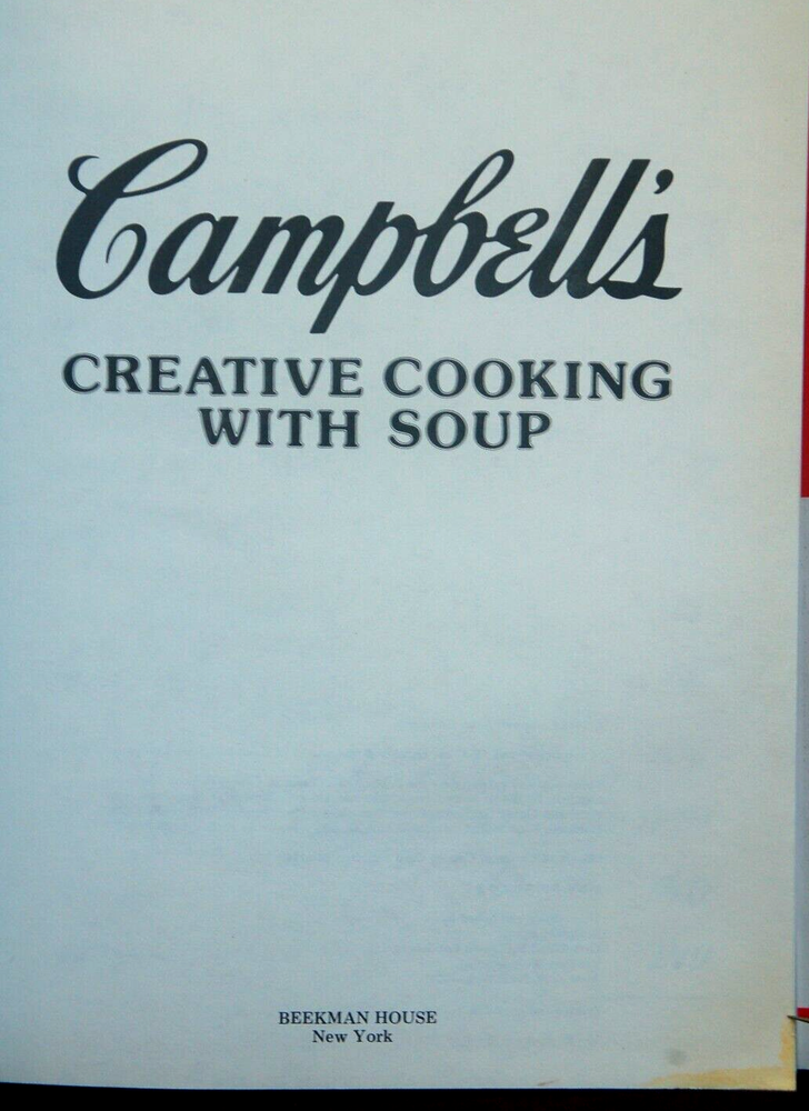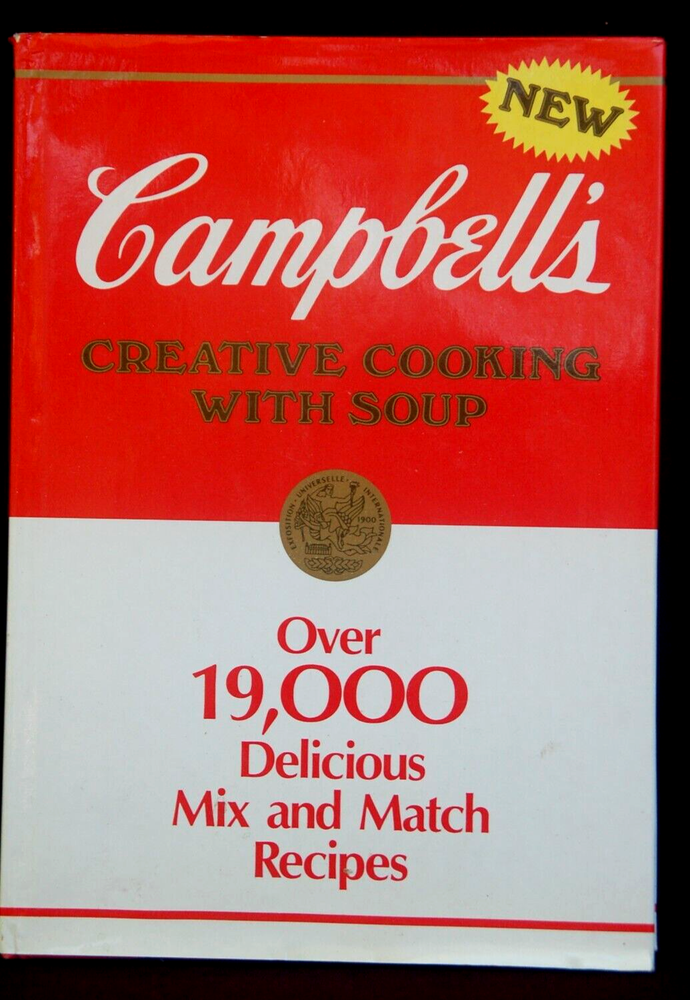 Campbell's Creative Cooking With Soup Over 19,000 Delicious Mix and Match Recipes Classic Cookbook Recipes Hardcover Good condition 1985 Hard Back Edition, Dust Jacket Low Right Corner Shows light yellow stain -- otherwise I would grade book LIKE NEW!! ESTATE SALE FIND: 224 pages of Tried and Tested Recipes. Book is in A+++ condition Minimal Signs of wear -- all consistent with age and use Please look at ALL photographs of actual item offered/described From Smoke & Pet Free home Happy to answer questions Thank you for looking Happy to combine shipping fees for savings -- please message me. Your Feedback is appreciated **Please remember to bookmark my eBay seller ID: 2usedstuff to your "favorite sellers list" to see future eBay offerings of: Books, New Orleans memorabilia, Pyrex, antique & semi antique Oriental rugs, runners, mats, and collector textile items. HURRY BACK -- NEW ITEMS LISTED WEEKLY!!!