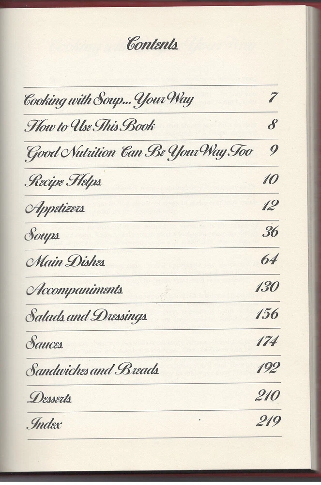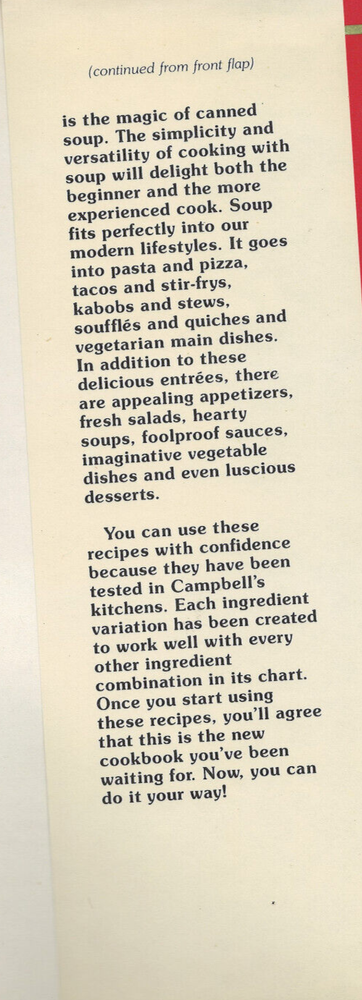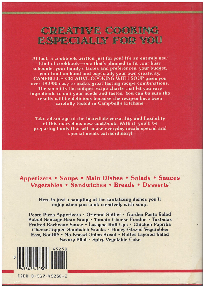 This vintage hardcover cookbook is in 'very good' condition. It features a dust jacket, color illustrations, an index and 206 pages. The book weighs 21 ounces and has dimensions of 10 inches by 7.5 inches by .6 inches. CAMPBELL'S CREATIVE COOKING WITH SOUP Over 19,000 Delicious Mix and Match Recipes by CAMPBELL'S SOUP COMPANY CREATIVE COOKING ESPECIALLY FOR YOU At last a cookbook written just for you! It's an entirely new kind of cookbook - one that's planned to fit your busy schedule, your family's tastes and preferences, your budget, your food-on-hand and especially your own creativity. CAMPBELL'S CREATIVE COOKING WITH SOUP gives you over 19,000 easy-to-make, great tasting recipe combinations. The secret is the unique recipe charts that let you vary ingredients to suit your needs and tastes. You can be sure the results will be delicious because the recipes have been carefully tested in Campbell's kitchens. Take advantage of the incredible versatility and flexibility of this marvelous new cookbook. With it, you'll be preparing foods that will make everyday meals special and special meals extraordinary! ISBN 0-88176-202-4 Copyright © 1985 by Campbell's Soup Company Published by Publications International, Ltd. Printed and bound in Yugoslavia by CGP Delo