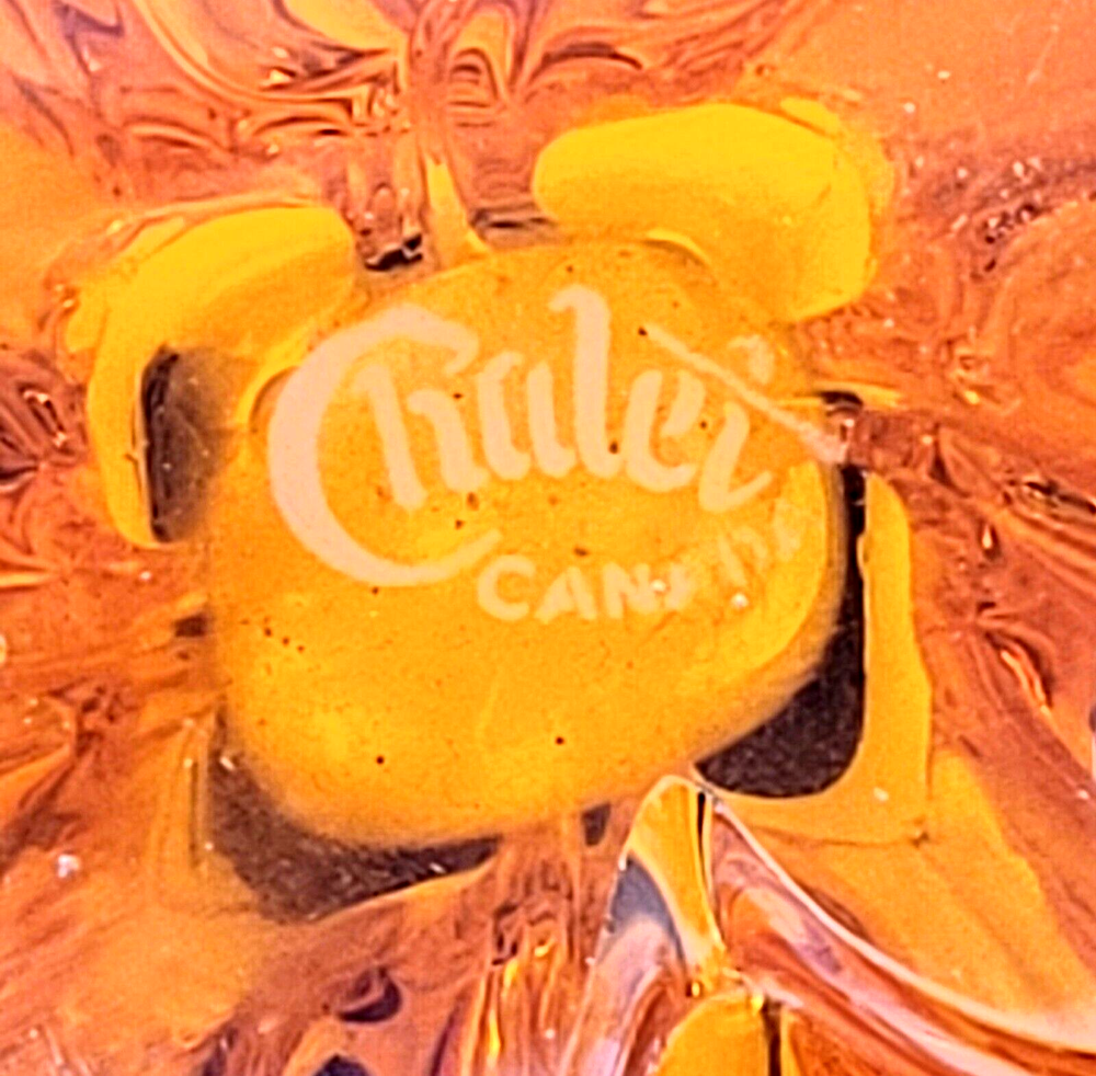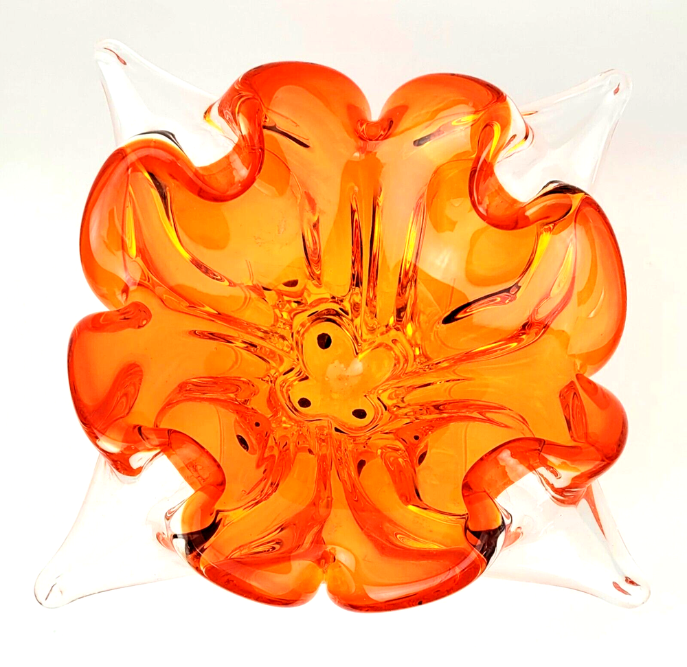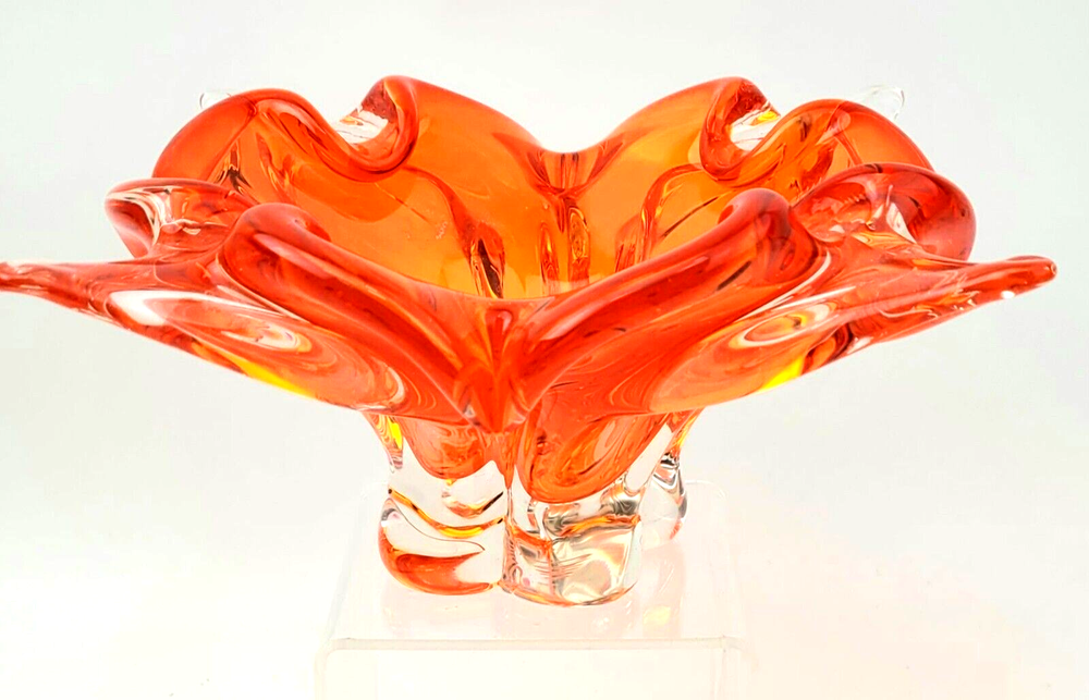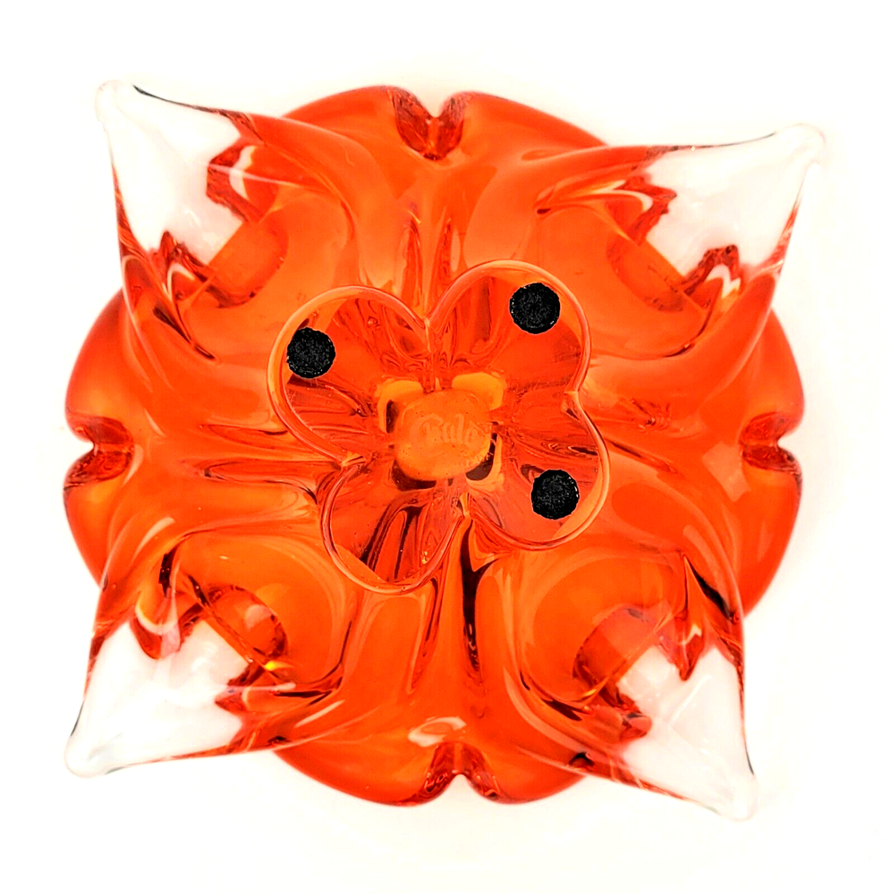 Canadian ART GLASS Chalet 4 points Vibrant Ashtray Orange and Clear Mid Century Bowl is a stunning piece of art glass from the 1960s. Hand-blown in Canada, this orange glass ashtray features a unique hand made design with four points, making it a perfect addition to any mid-century modern collection. Size: 8" wide by 4 1/8" tall. This decorative piece is not only functional as an ashtray for cigarettes or cigars but also serves as a beautiful display item for any room. Add a touch of vintage charm to your home with this exquisite Canadian art glass ashtray, suitable for cigarette use. Made with high-quality glass material and showcasing the craftsmanship of the era, this original piece captures the essence of 1960s art glass production. Perfect for collectors or those looking to elevate their decor with a touch of retro sophistication. Check my other listings for more Chalet and other treasures.