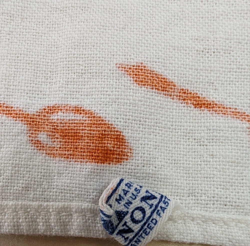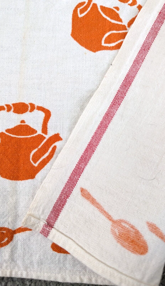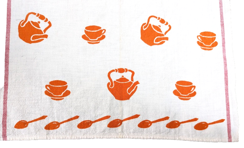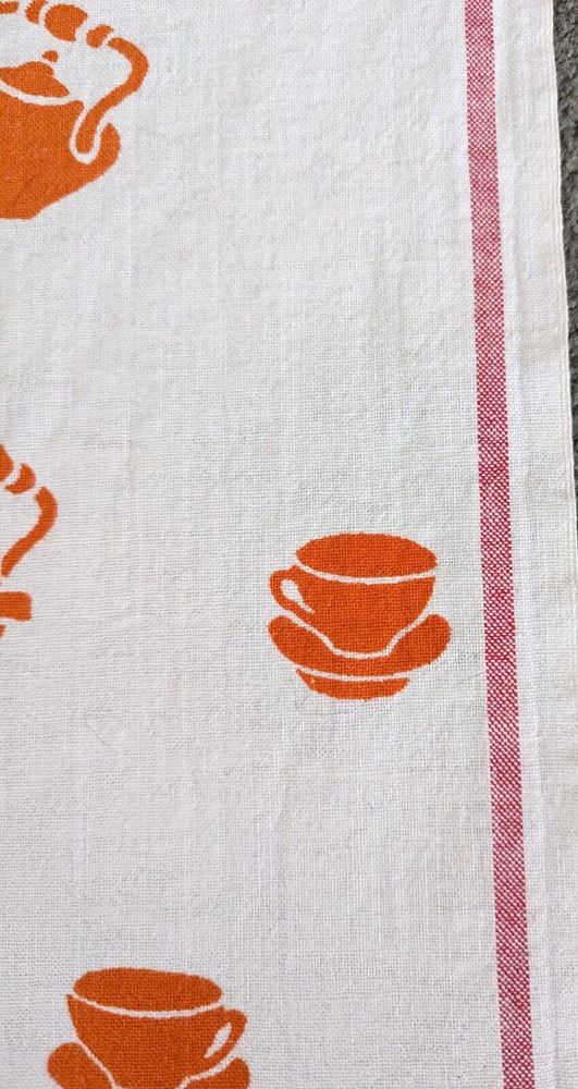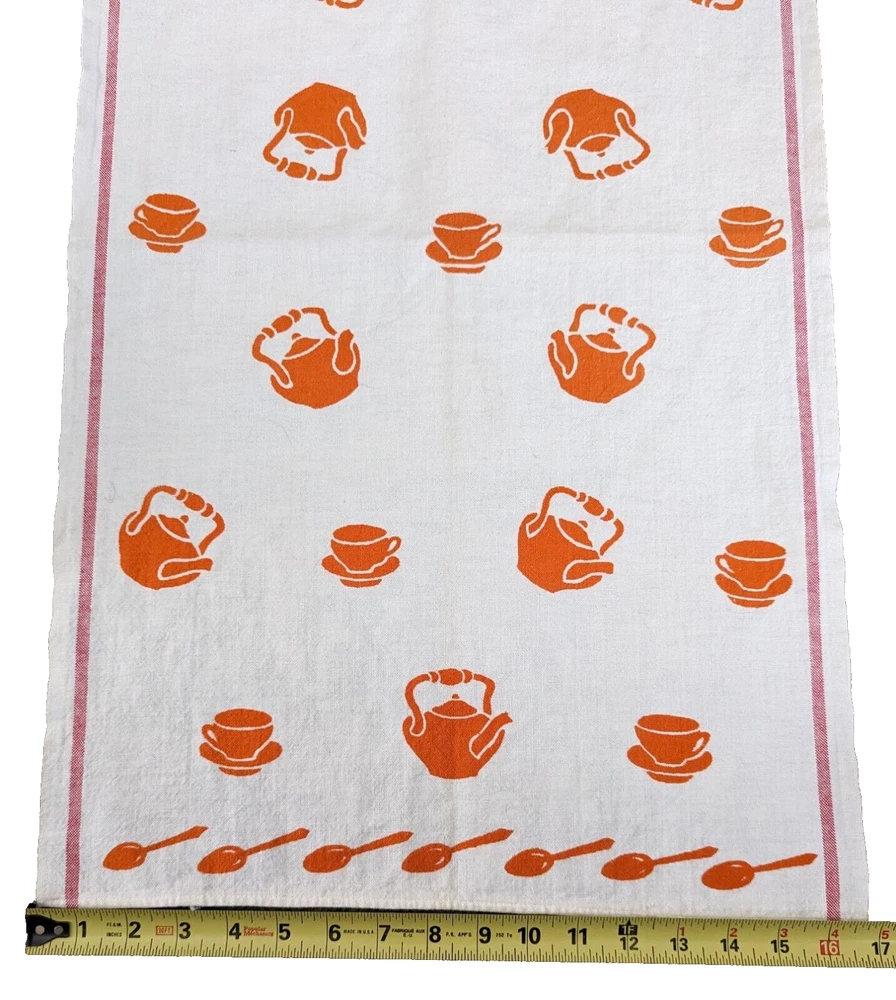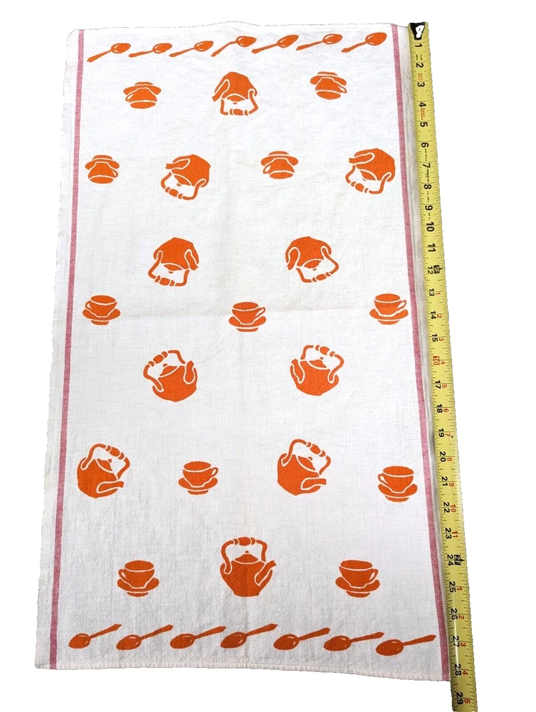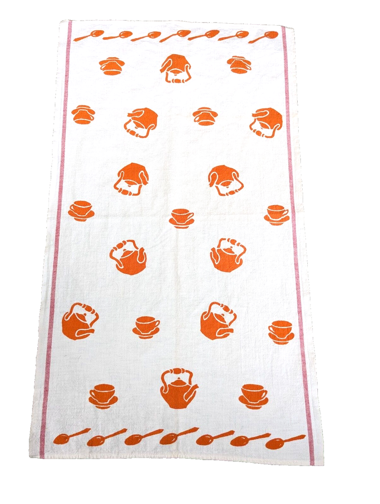 The is a vintage Cannon mid century modern, grannycore, kitchen tea towel. It has orange spoons, cups, and tea kettles on a white background. Measuring approximately 29" long x 17" wide it is in good vintage pre-owned condition with no stains, rips, holes, or tears. Please view all photos carefully (including using zoom) as they are part of the description and show additional details. I pack all items with love and care and ship no later than next business day.