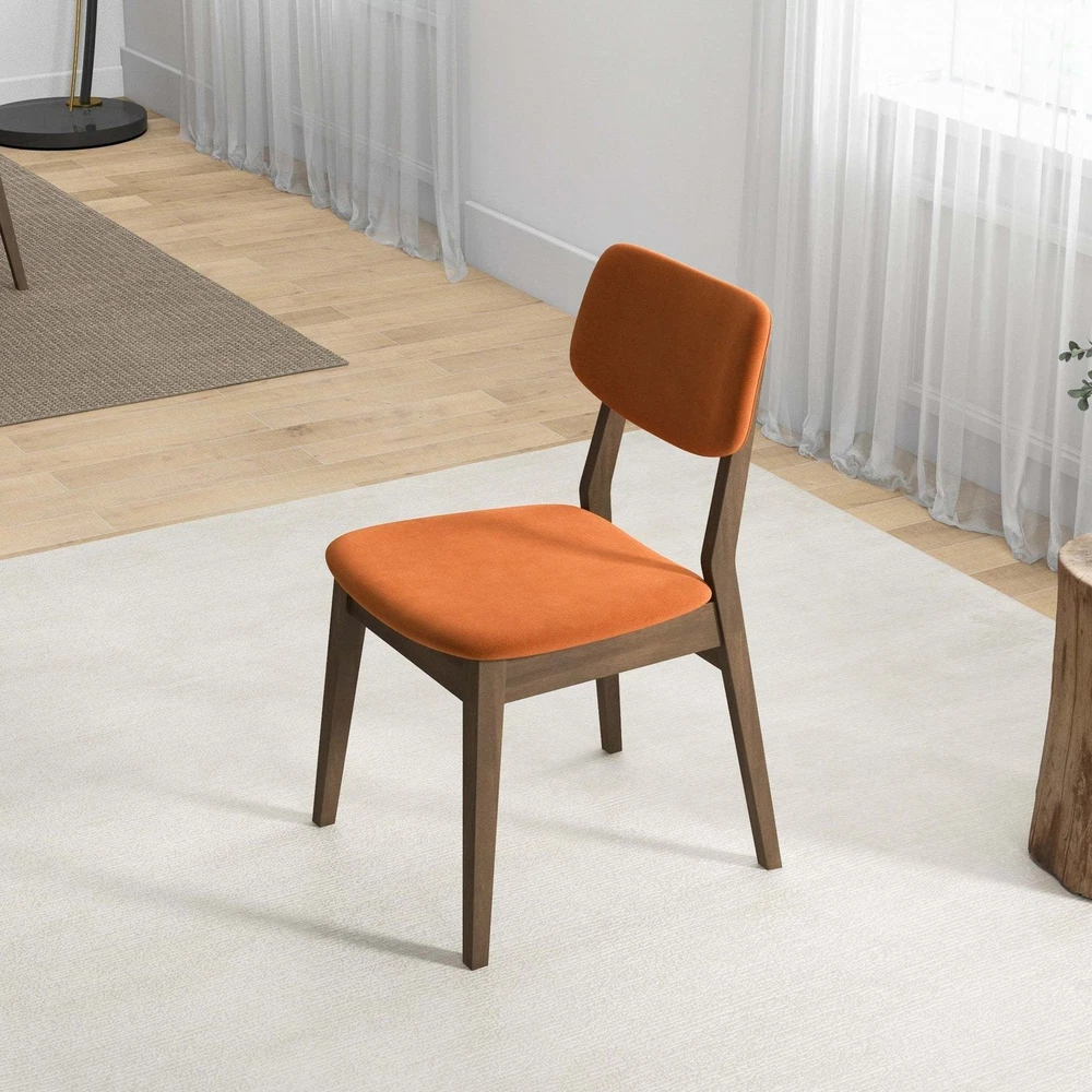 Specifications Place of Origin #originPlace# Main Color Brown,Burnt Orange Main Material Solid Wood,Velvet Filler Foam Product Style Mid-Century Modern Use Case Dining Room Wood Tone Brown Chair Type Dining Chairs Pattern Solid Chair Fill Material Foam Chair Care Instructions Wipe Clean Seating Quantity Set of 2 Dangerous Goods #dangerFlag# Dimensions & Weights Assembled Length (in.) 20.90 Assembled Width (in.) 19.30 Assembled Height (in.) 32.30 Weight (lbs) 26.30 Product Features Carlos Burnt Orange Velvet Solid Back Side Chair (Set Of 2) Introducing a touch of mid-century modern elegance to your dining space is effortless with this exquisite pair of dining chairs. These chairs boast a sleek armless design, ensuring effortless tucking beneath your dining table or breakfast nook. Crafted with the utmost attention to quality, they are constructed from solid wood, with their foundations supported by splayed and tapered legs that embody the classic mid-century aesthetic. The chairs' split backs exude a captivating retro-inspired charm that sets them apart. Offering both style and comfort. These chairs feature contoured seats and back panels, expertly upholstered in sumptuous velvet that covers a plush foam filling. Description