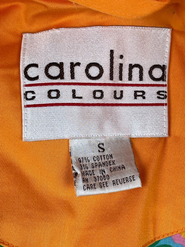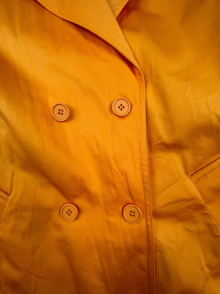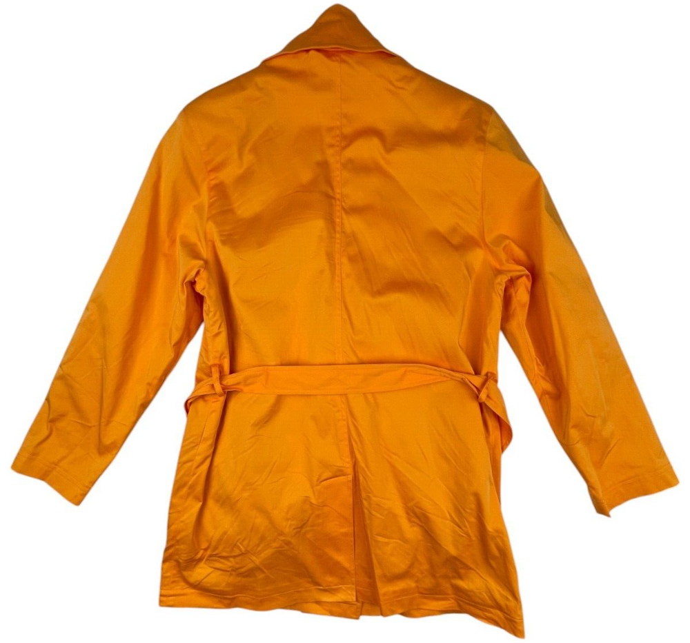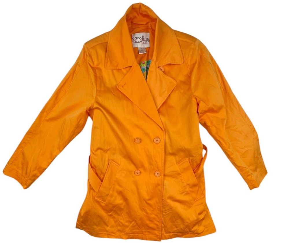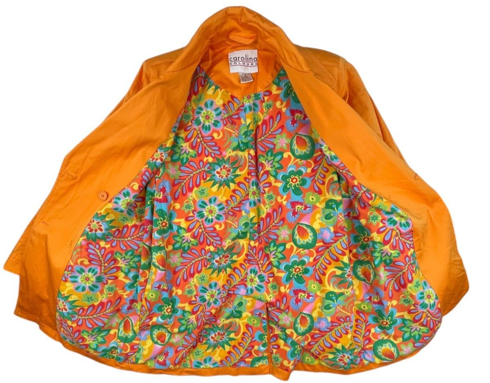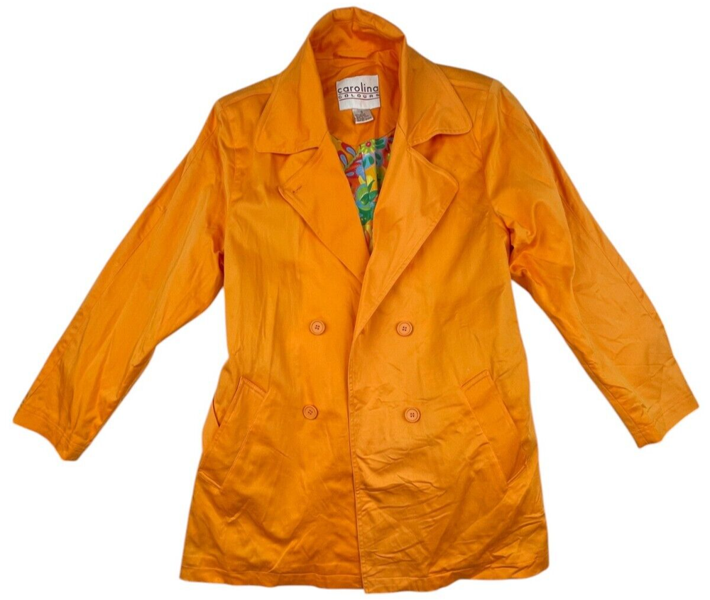 Carolina Colours Orange Double Breasted Overcoat, Floral Pattern Lining 97% cotton / 3% Spandex Machine washable Size Small . Approximate measurements: Armpit to armpit: 19" Length: 32" Great condition. Please see all photos as they are part of the description