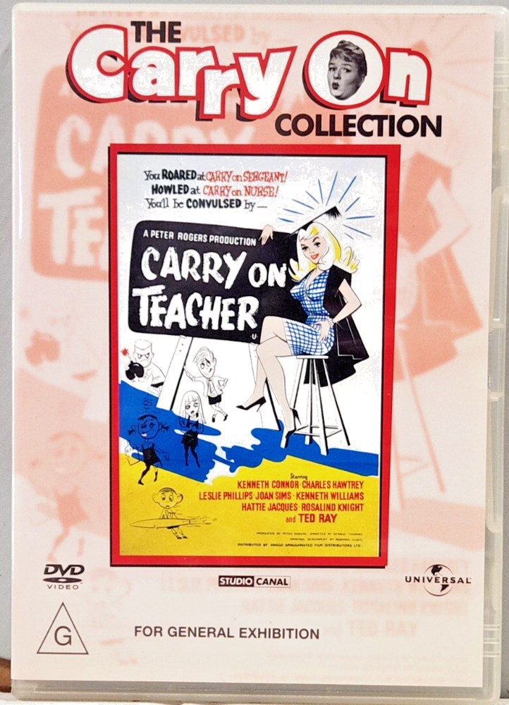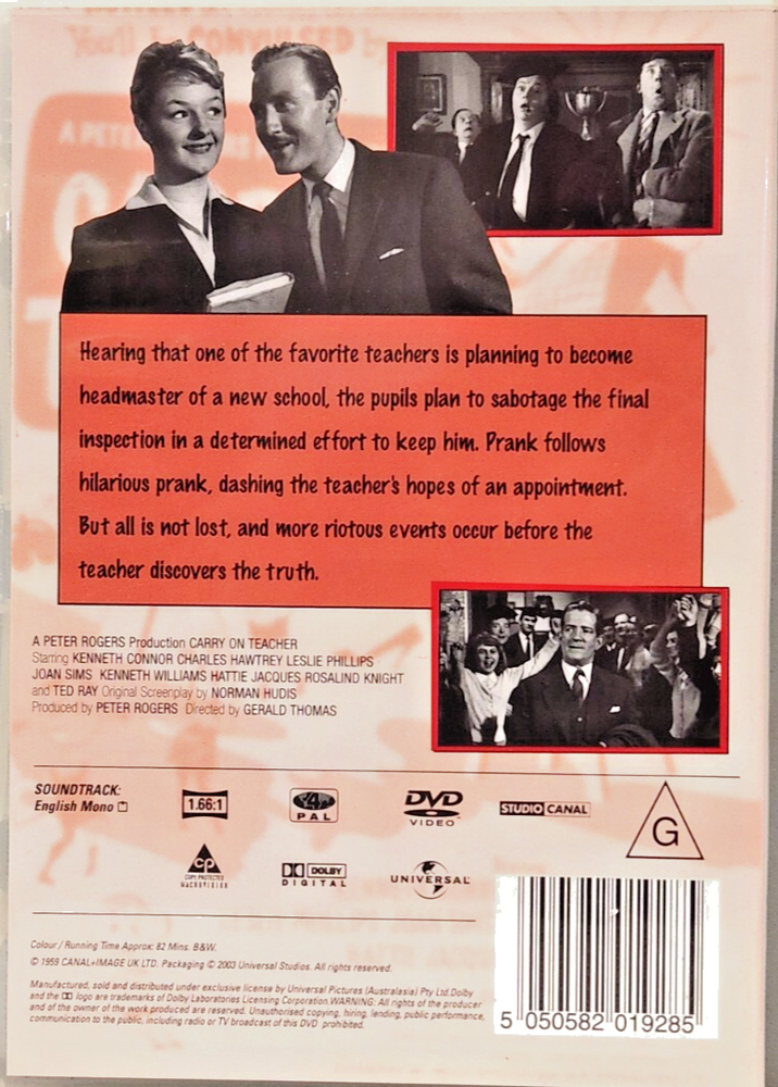 The beginning of a British comedy tradition, 1958 marked the birth of Carry On, a classic genre of British parody, double entendre and slapstick unto itself. Prepare for 'Six Of The Best' as the Carry On team cause chaos in both the school yard and the classroom - ensuring there's no time for learning! Pupils run amok at Maudin Street School in a desperate attempt to hang on to their beloved headmaster who has applied for a new job elsewhere. But with a little ingenuity and a whole lot of mischief these kids are likely to go to the head of the class, or at least fall on their faces trying! Featuring KENNETH CONNOR, CHARLES HAWTREE, KENNETH WILLIAMS, HATTIE JACQUES, LESLIE PHILLIPS and more, Carry On Teacheris a high spirited lesson of laughs, puting fun and frivolity back into the classroom - where it belongs!