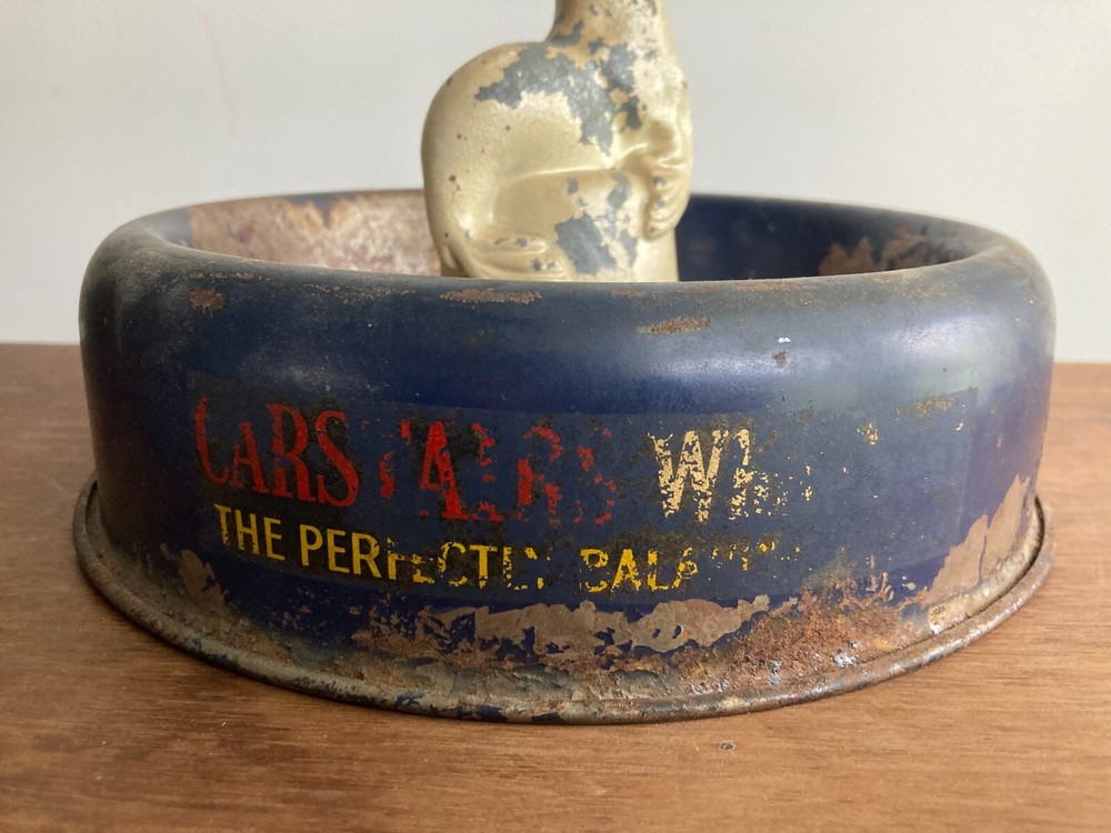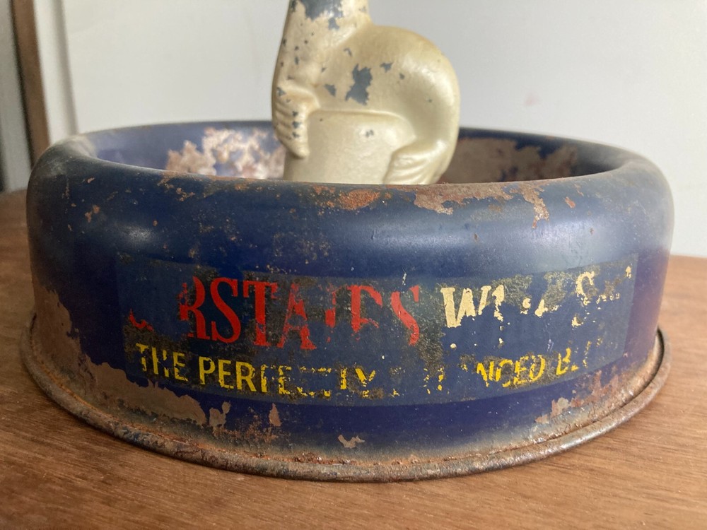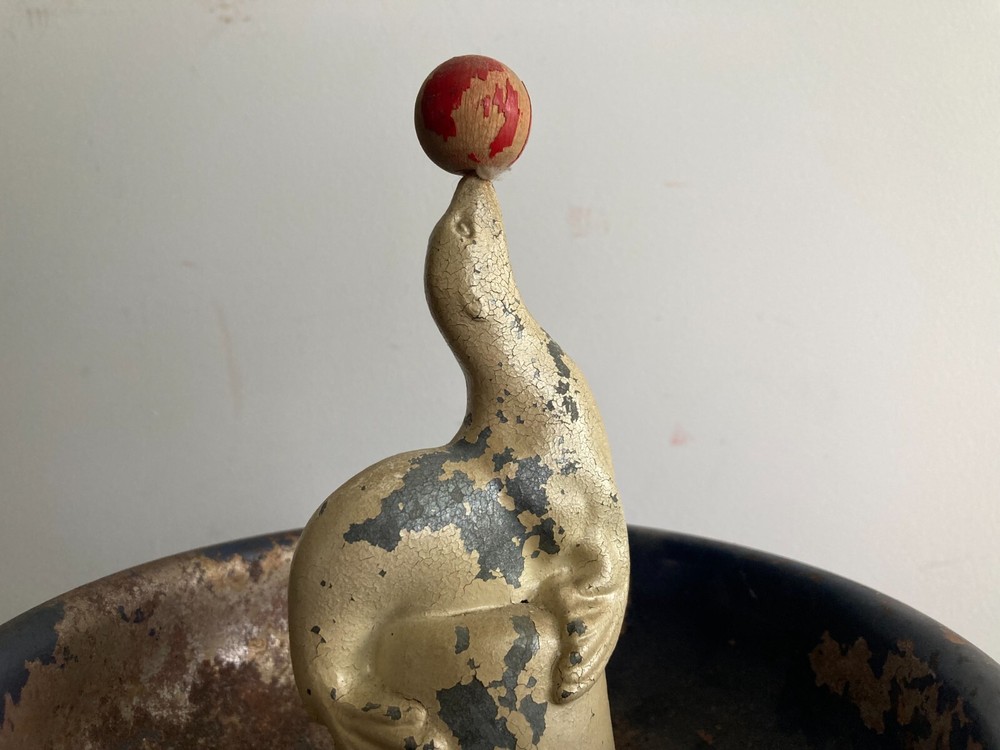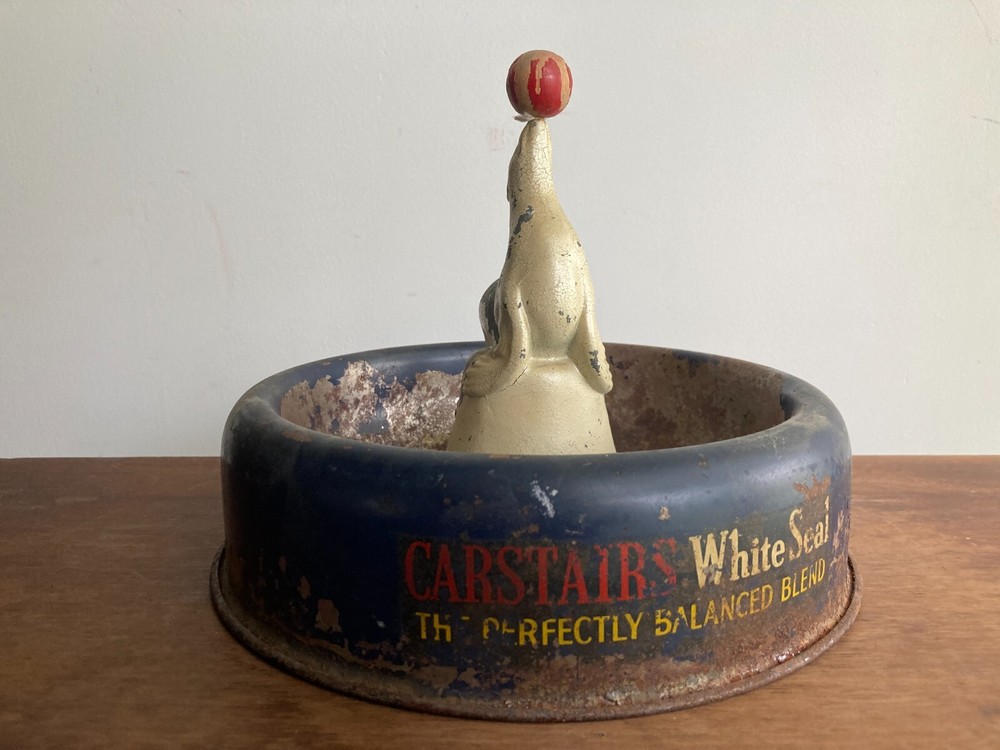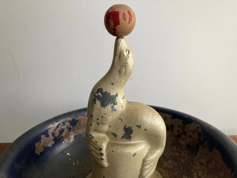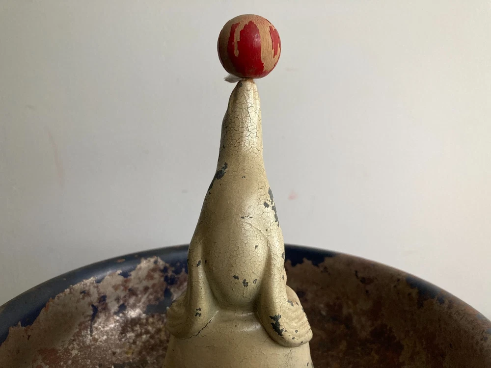 ARF ARF! I cannot find a similar instance of this ANYWHERE - if you are able to, and it's cheaper, I'll lower the price - THAT'S A GUARANTEE! Otherwise, this is an extremely cool and very rare seal balancing a red ball on his nose, surrounded by... peanuts? Pretzels? One can only imagine what types of bar food ensconced this little guy at one point. Perhaps he was even the provider of snacks to someone famous, perhaps even P.F. Sullivan himself, in some smoky, dusty old watering hole... somewhere, someplace, and sometime, lost long ago... Anywho, he's adorable! Could use a little TLC, but looks great as a memory of a bygone era.