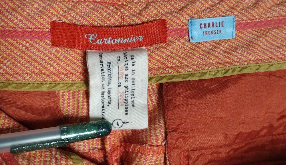 I am selling one pair of Cartonnier pants in size 4 The material is 98% Cotton & 2% Spandex Approximate Measurements: Waist (around the top): 29" Front Rise: 8.5" Inseam: 22.5" They come from a clean, smoke-free home Feel free to contact me if you have any questions!