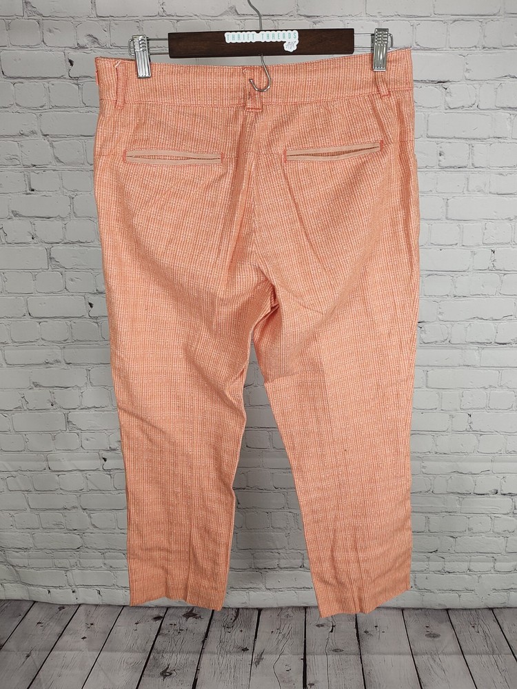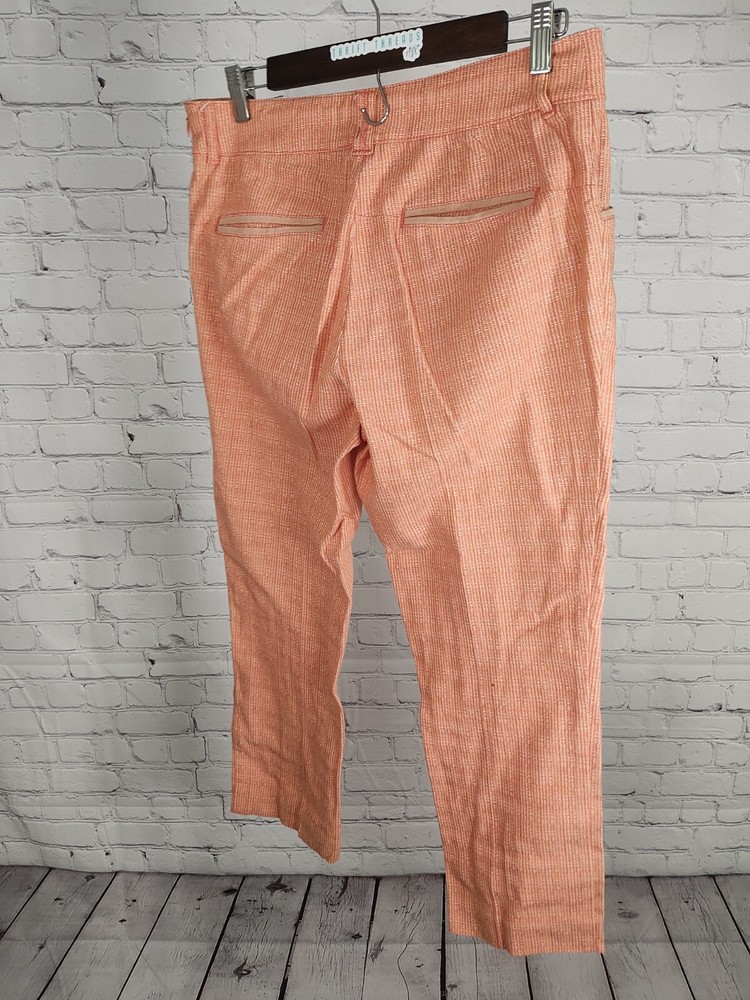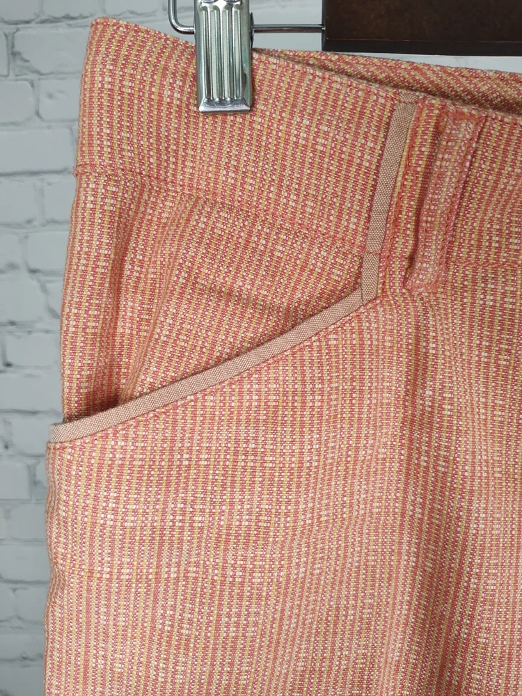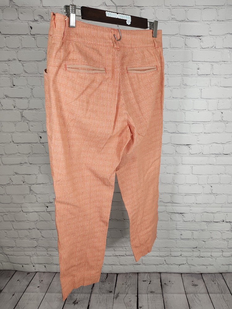 Elevate your wardrobe with these stylish Cartonnier Charlie Trousers from Anthropologie. These mid-rise pants in a vibrant orange and yellow striped pattern are perfect for any occasion, whether it's casual, workwear, or business. The pants are made of a comfortable cotton blend material and feature a flat front with tapered legs and belt loops. Other great features include easy care and pockets. They are pull on style with a zipper and hook and eye closure. These pants are machine washable and come in a regular size fit. Add a pop of color and modern style to your wardrobe with these amazing pants. Recently dry cleaned Waist 31" Rise 10" Inseam 24"