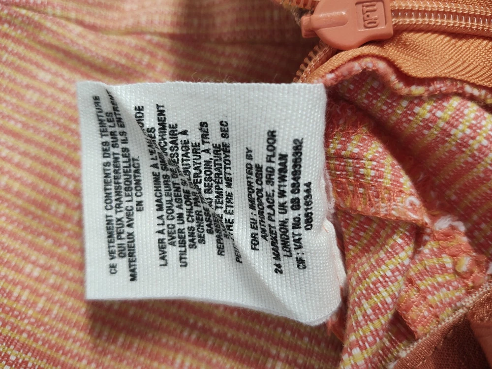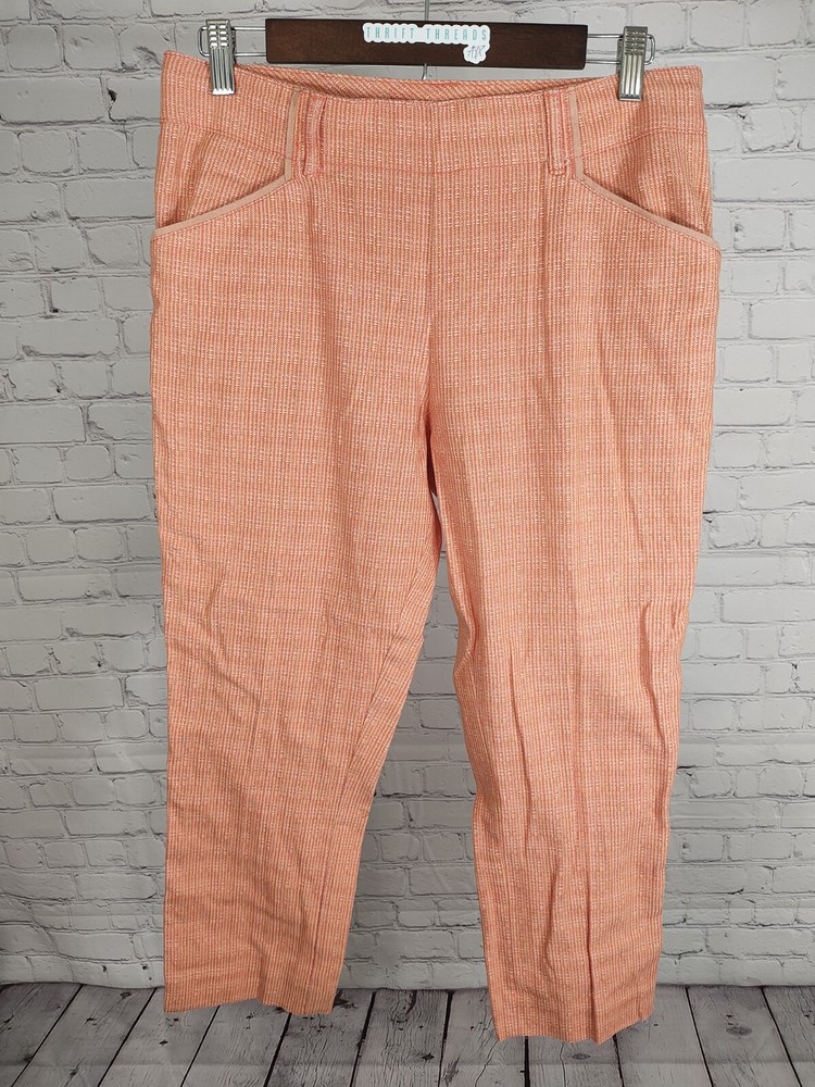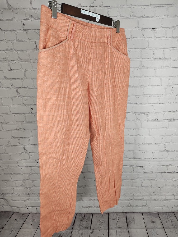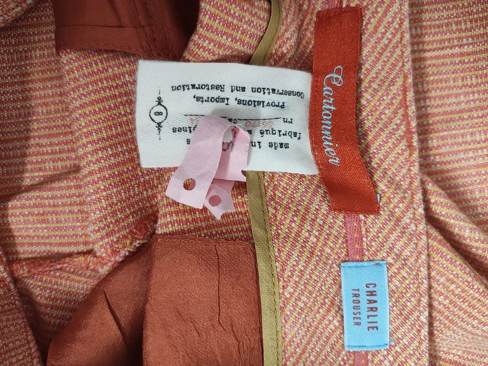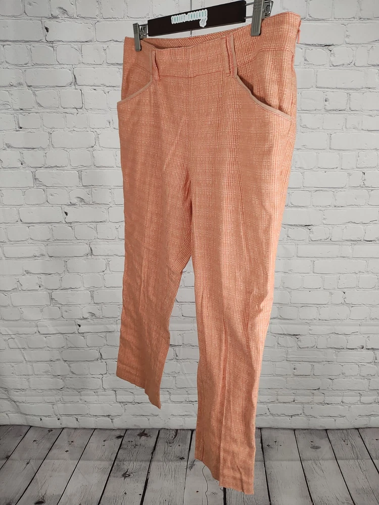 Elevate your wardrobe with these stylish Cartonnier Charlie Trousers from Anthropologie. These mid-rise pants in a vibrant orange and yellow striped pattern are perfect for any occasion, whether it's casual, workwear, or business. The pants are made of a comfortable cotton blend material and feature a flat front with tapered legs and belt loops. Other great features include easy care and pockets. They are pull on style with a zipper and hook and eye closure. These pants are machine washable and come in a regular size fit. Add a pop of color and modern style to your wardrobe with these amazing pants. Recently dry cleaned Waist 31" Rise 10" Inseam 24"