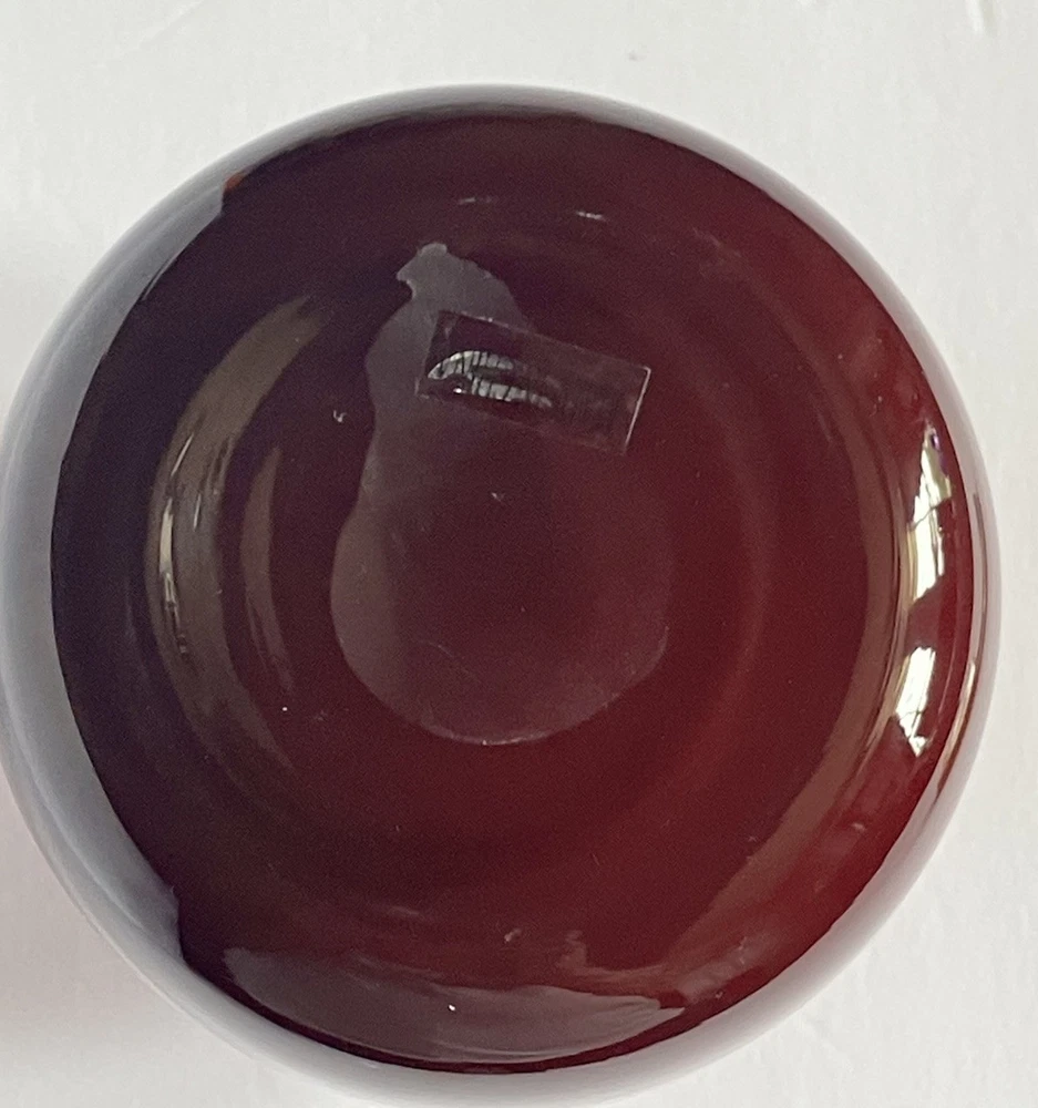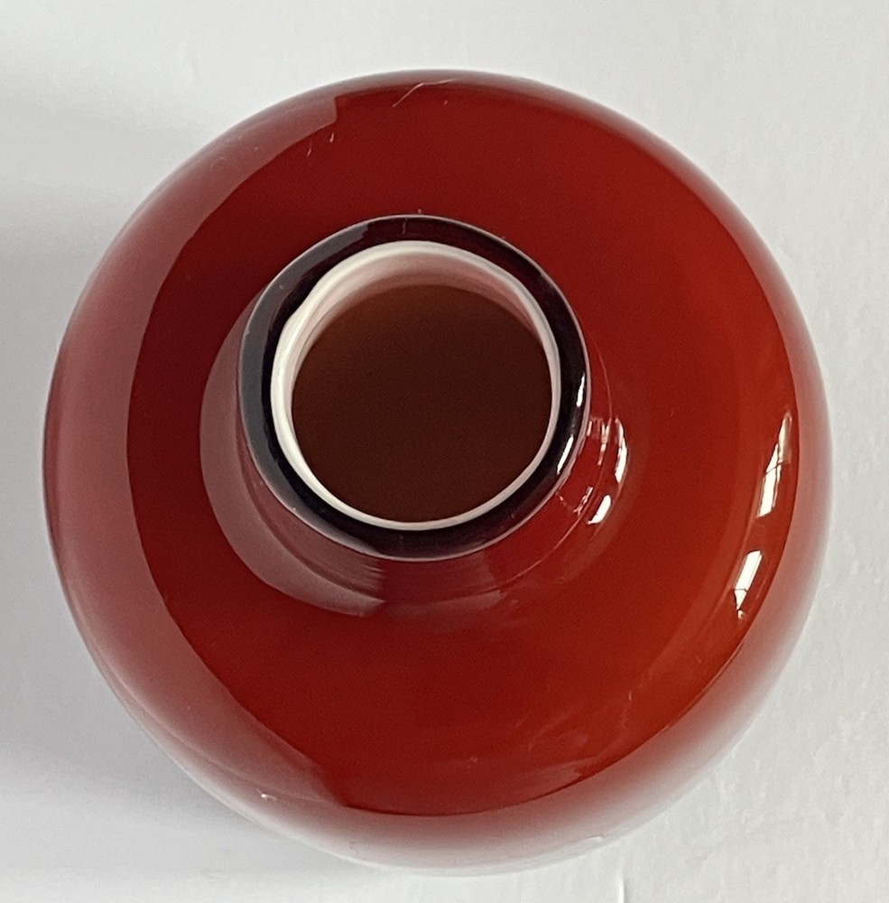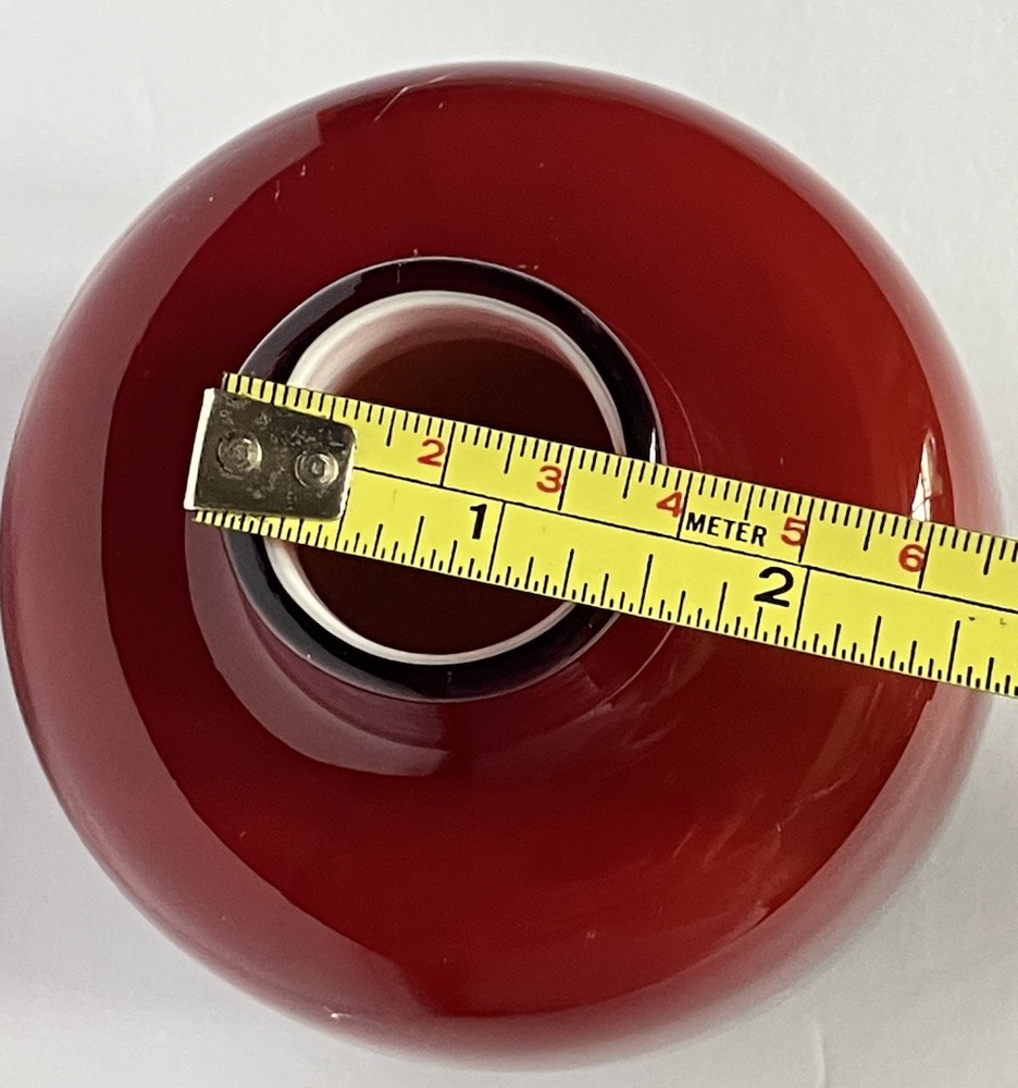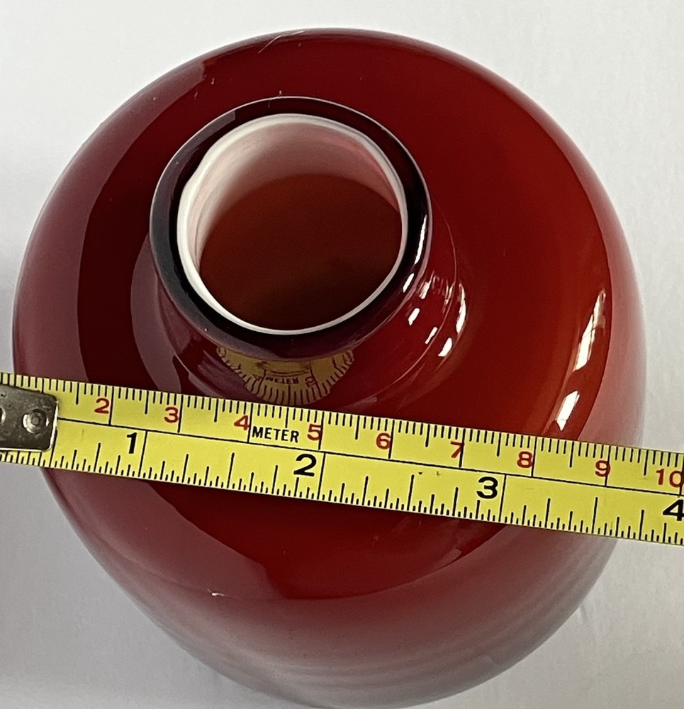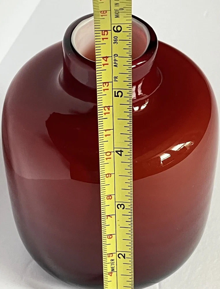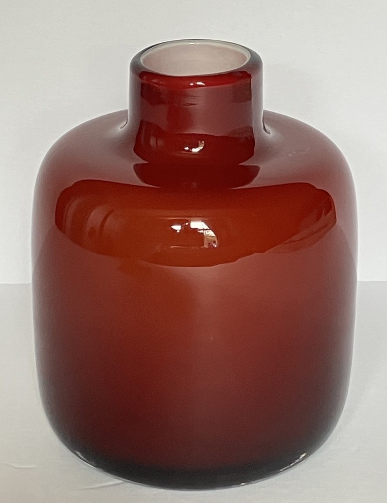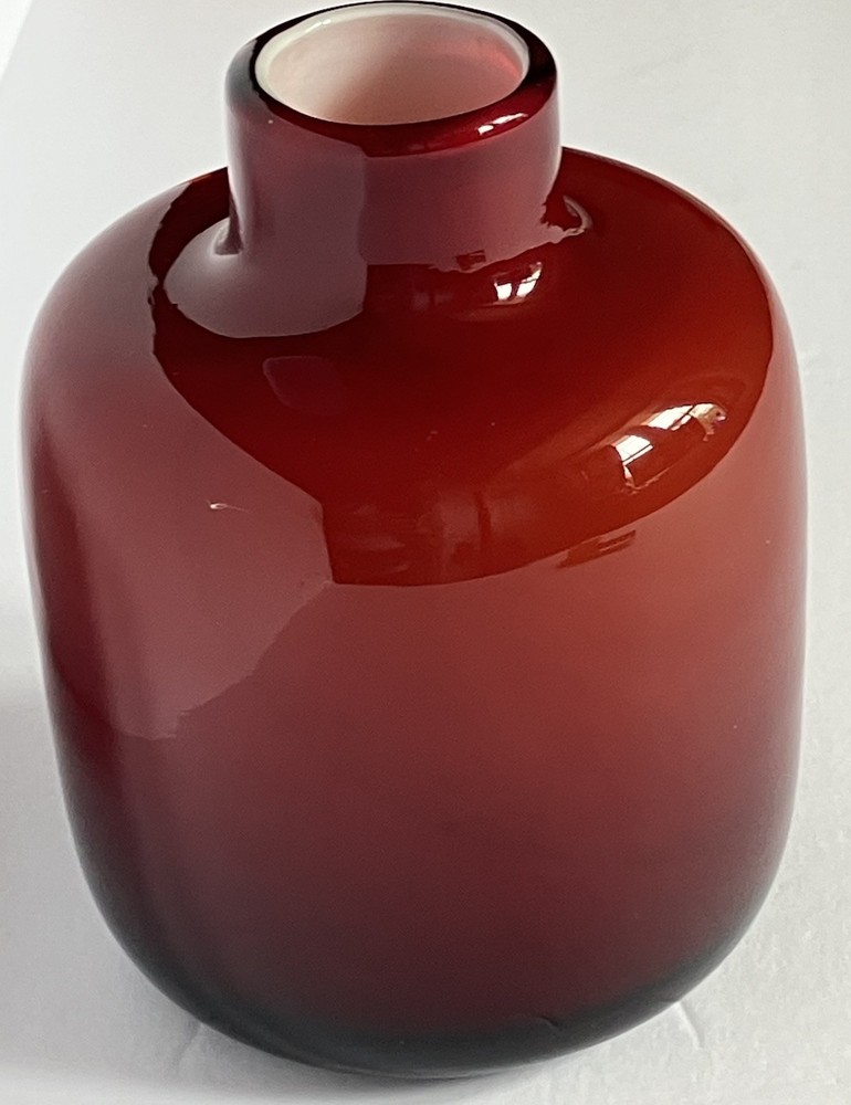 This cased blown glass vase features a vibrant red and orange color with a solid pattern, standing at 5.25 inches tall and 3.5 inches wide. Handmade, this mid-century modern piece has a glossy finish and is unmarked as to brand. The vase is original and crafted using art glass production style, making it a decorative and unique addition to any art-themed setting. No chips or cracks.