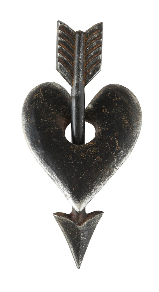 Cupid has done it again! This metal heart and arrow is a great accent piece and weighs a sturdy 3 lbs. The pieces do not separate but are also not connected. That makes it easy to find the perfect way to arrange it for display. Cast iron construction Heart is 4.75"R x 6.5"H Arrow is 10.25"L x .25"W x 1.75"H 10"L x 4.75"W x 3"H Distressed brown finish