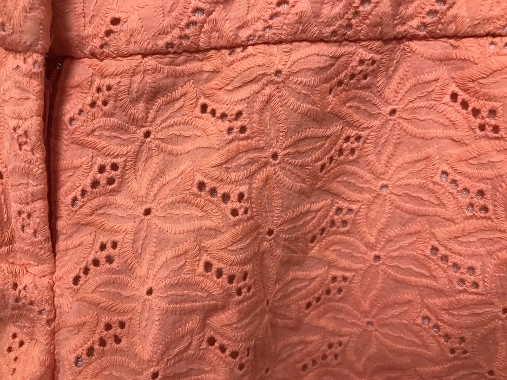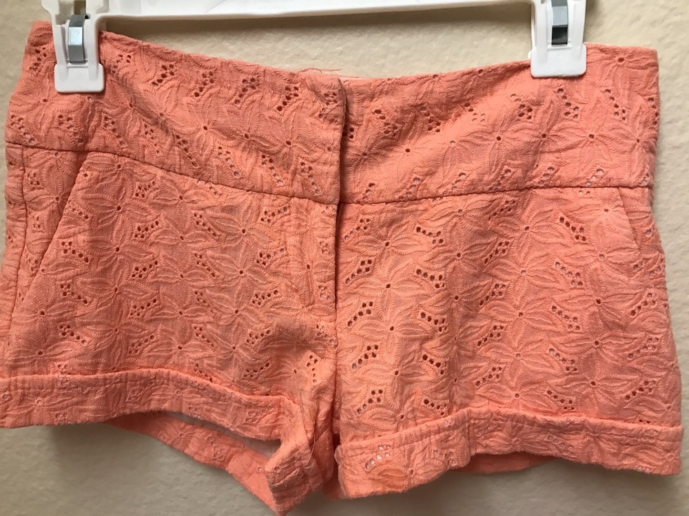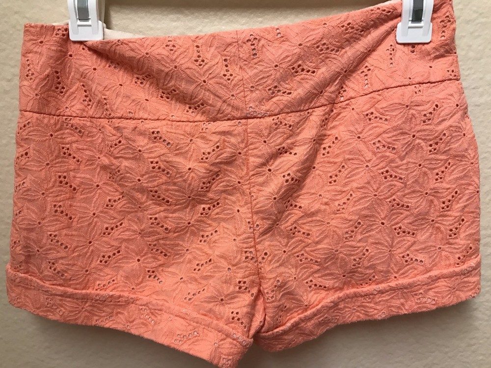This is a Charlotte Russe floral lace coral shorts. The shorts are an orange/pinkish color. Perfect for the spring and summer. Can fit xs/s. Color: Coral Size: 2 Shell: 100% Cotton Lining: 100% Polyester