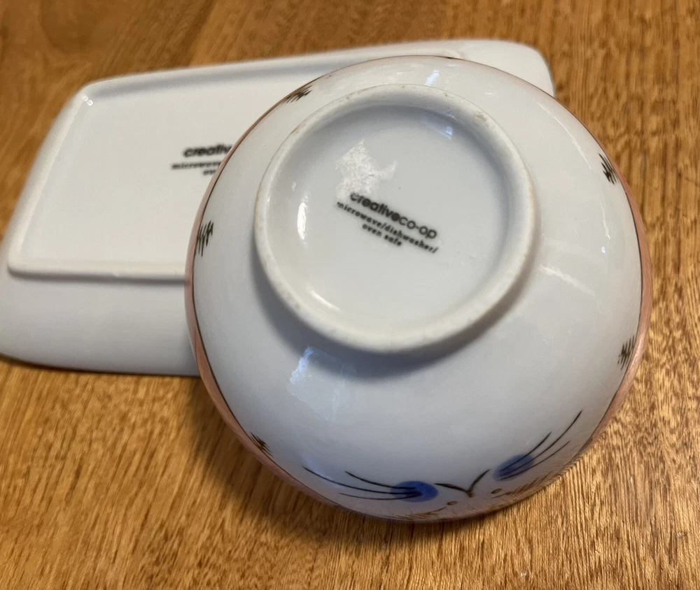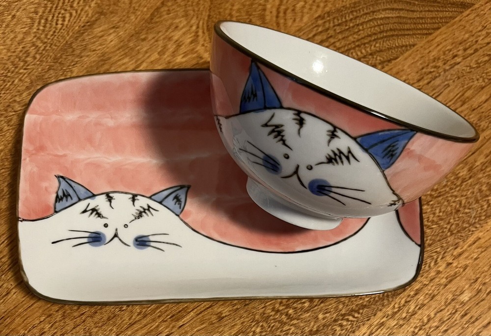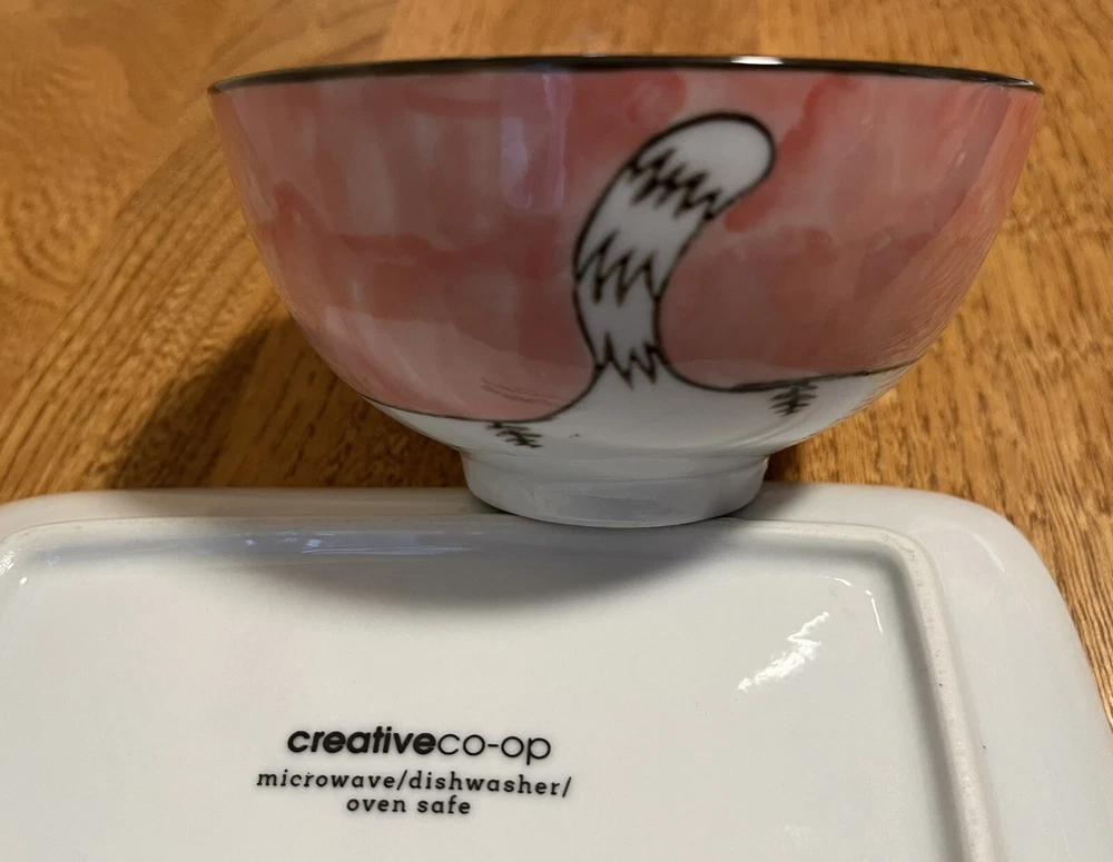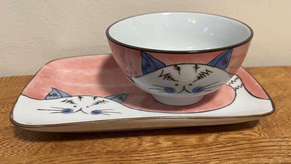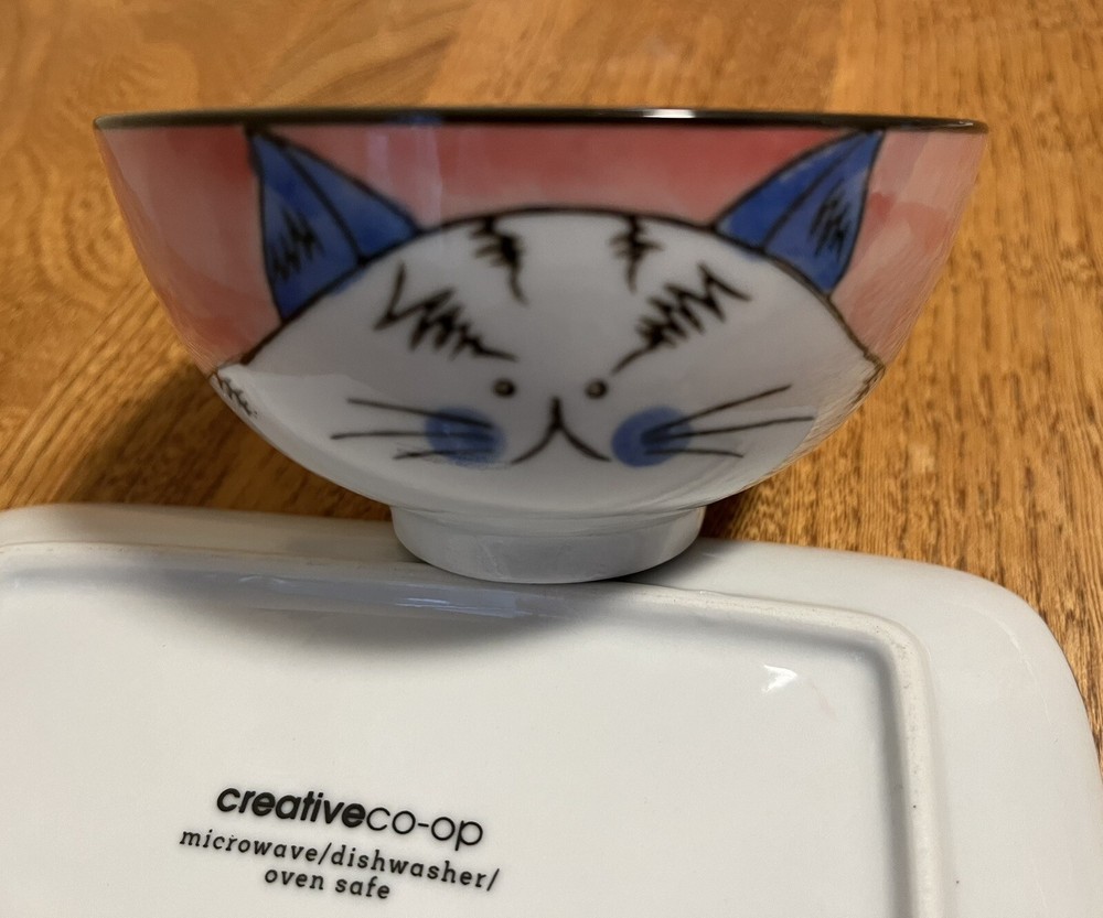 Add some whimsy to your dining routine with this charming Creative Co-Op cat bowl and sandwich plate set. The playful grumpy cat design is sure to delight. Perfect for cat lovers who want to add to their collection, this set is a must-have for any feline aficionado. This set has not been used, and is microwave, dishwasher , and oven safe!