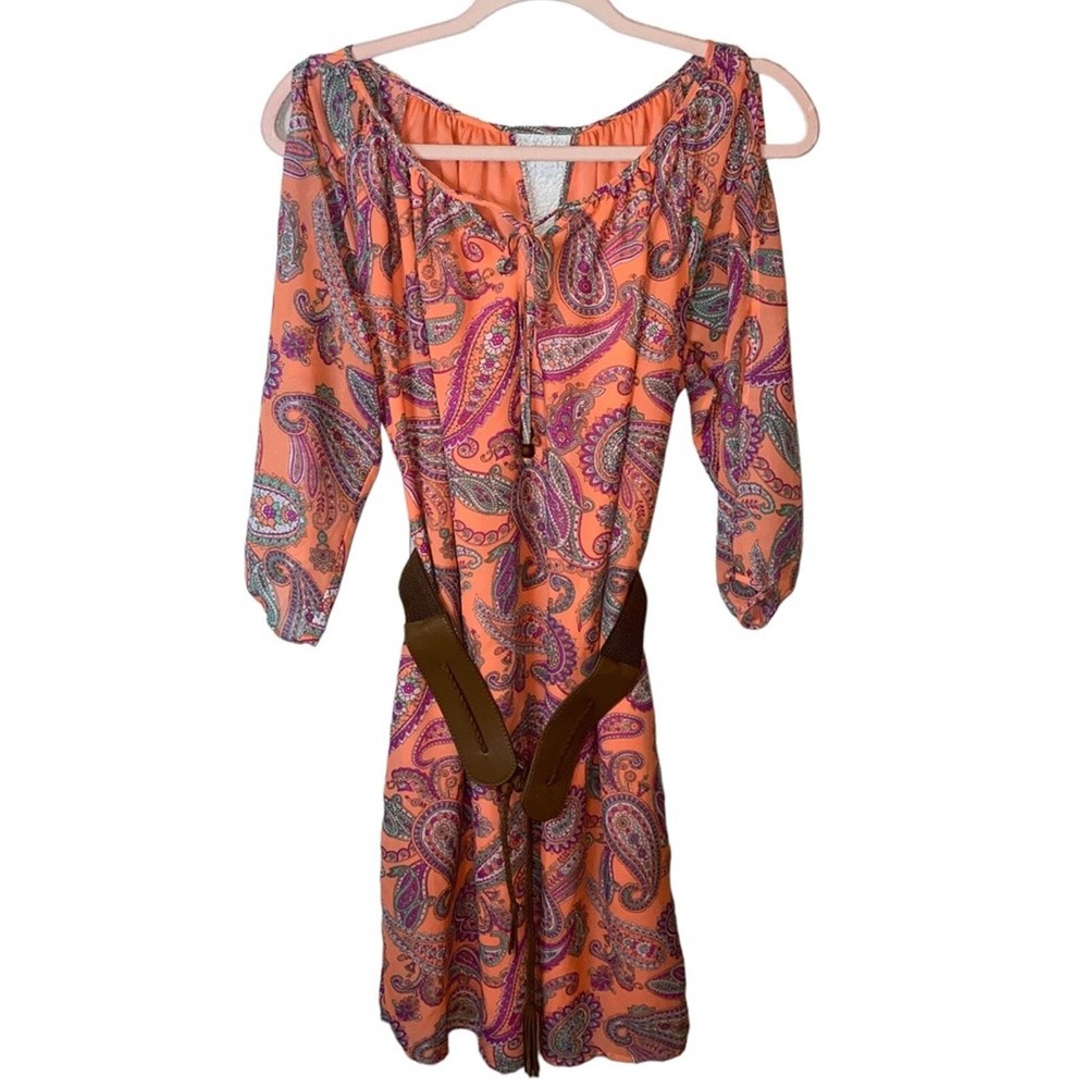 <![CDATA[<div>EUC Cato Peachy Orange Paisley Print Belted Waist Dress Keyhole in front and back Elastic cuffs on sleeves Polyester Lined Length: 37” Pit to pit lying flat: 18.5” Size: M JulAld...