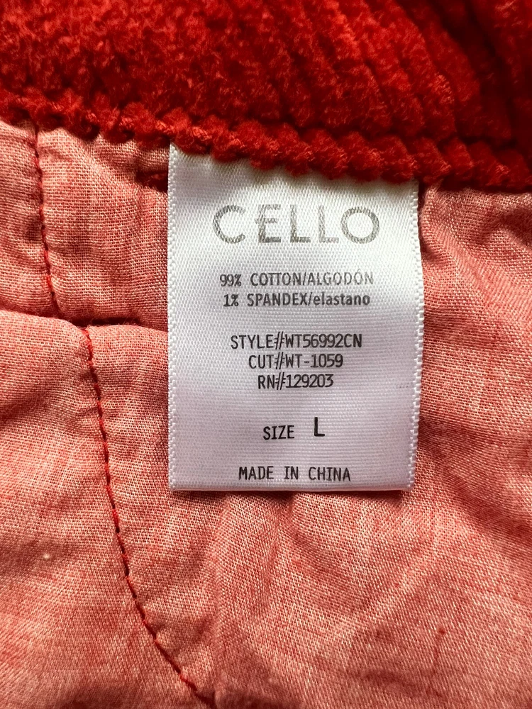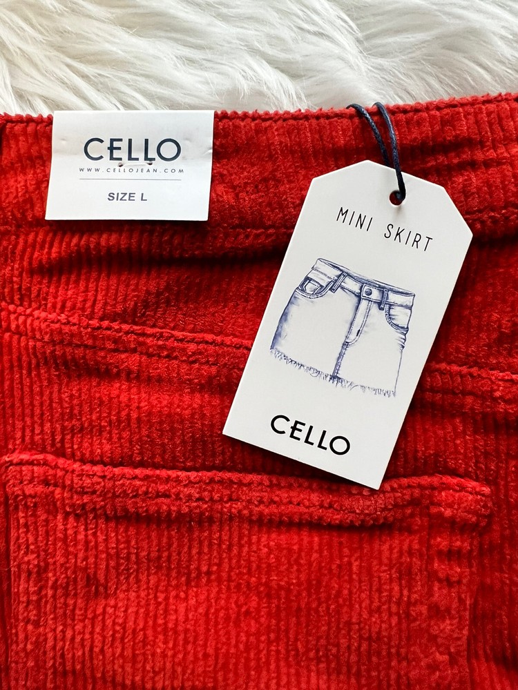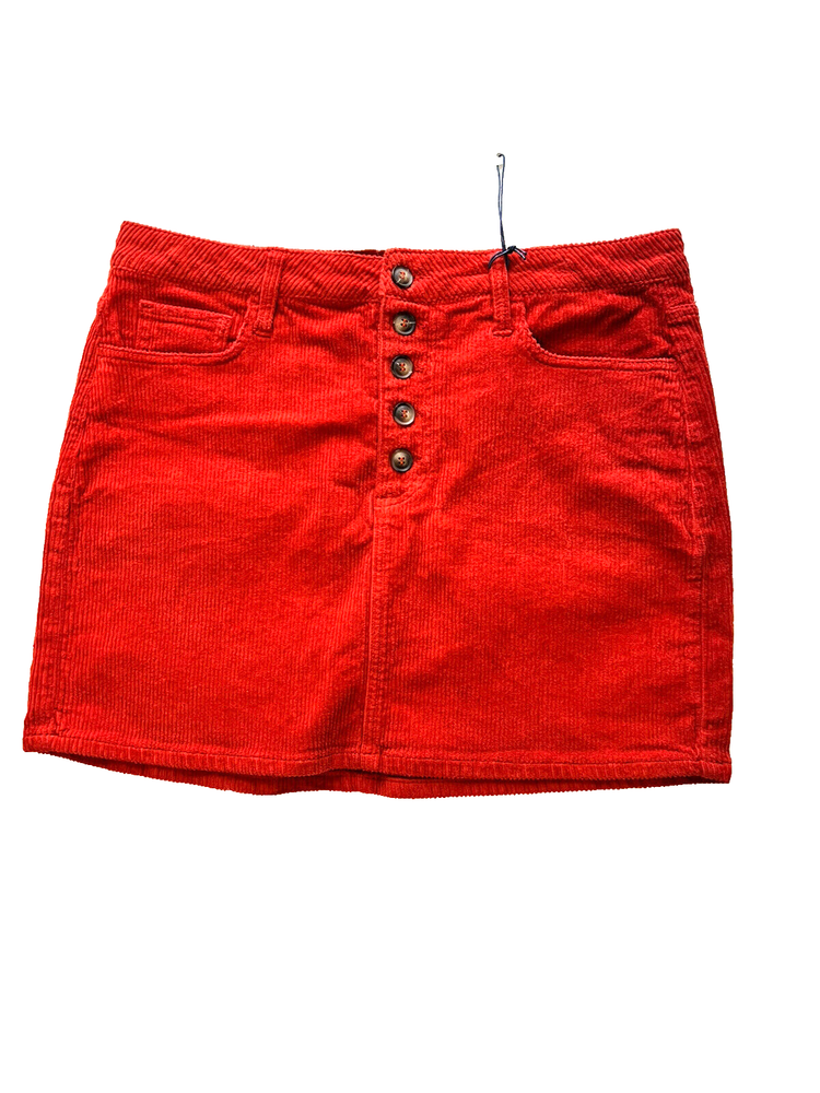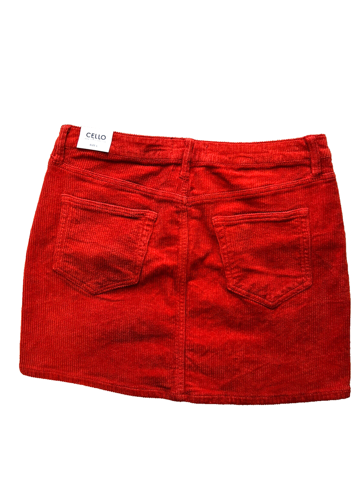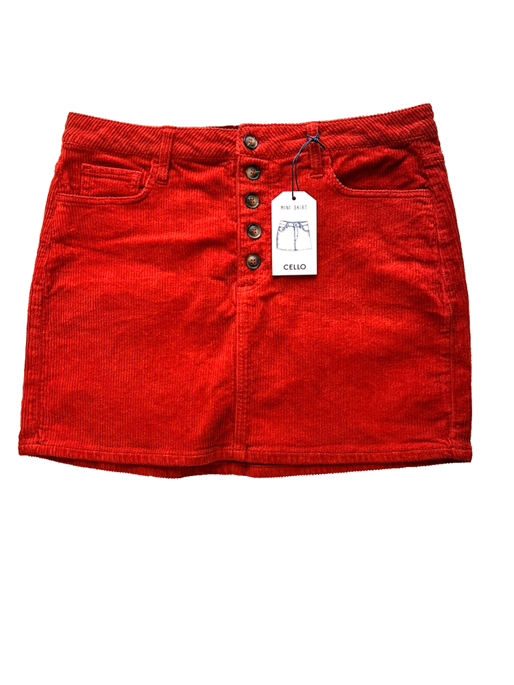 Cello Women's Mini Skirt Large 32 Corduroy Orange Rust Five-Button Front Five Pockets NWT (New with Tags). The approximate measurements are: Waist: 16 inches on flat lay and 32 inches all together Length: 15.25 inches Bottom Opening: 21.50 inches There is some stretch with this skirt and measurements were made as it lays flat unstretched. This is a new clean item with original tags. Ships from a smoke-free home via USPS Ground Advantage.
