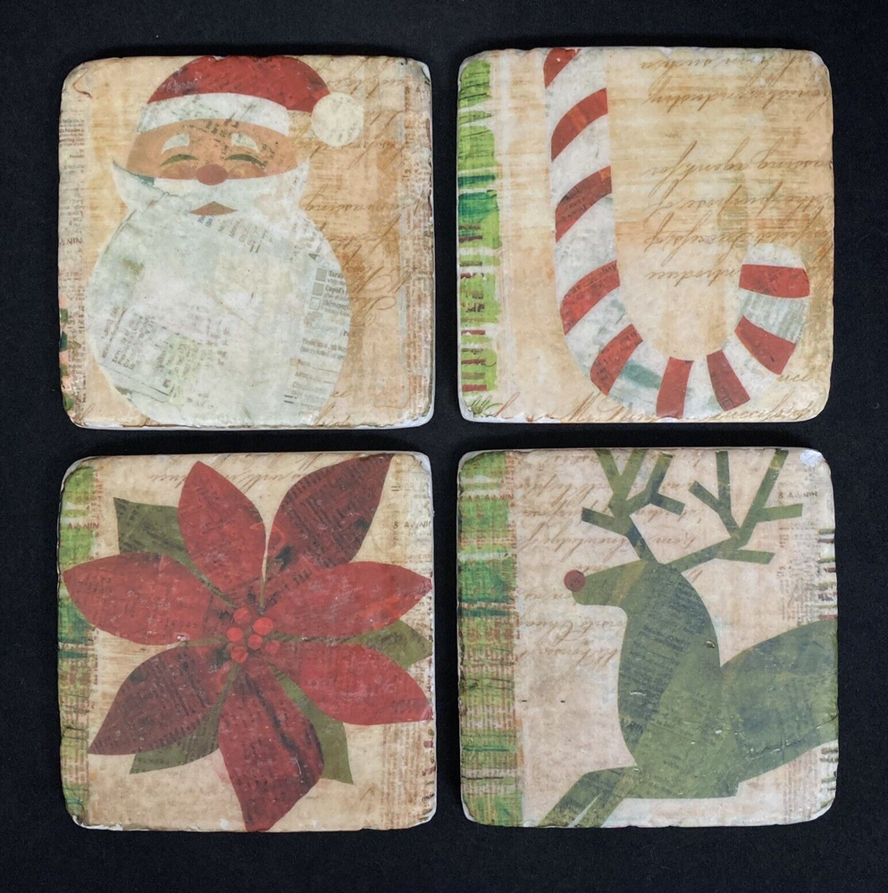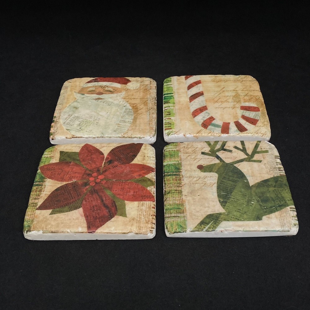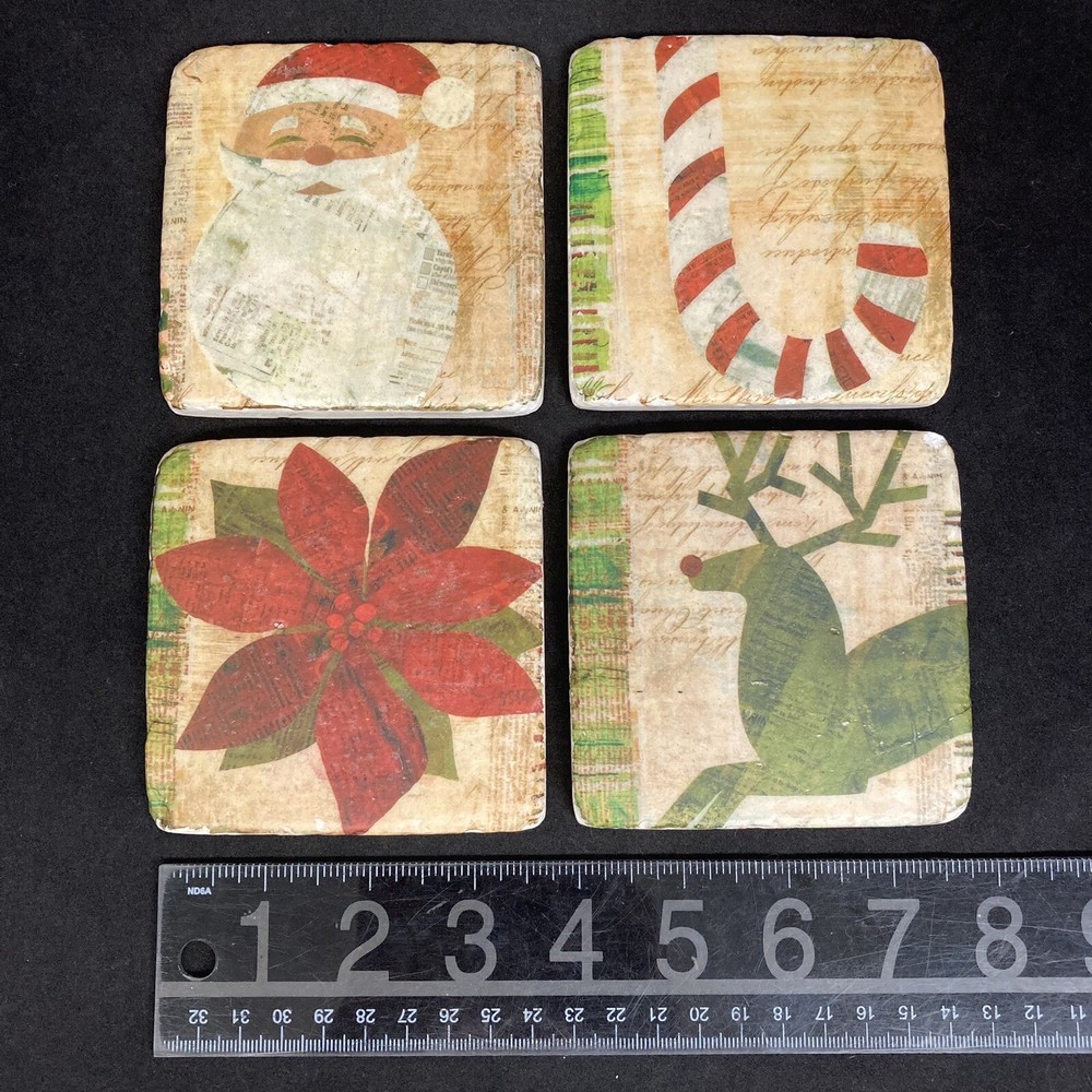 Ceramic Coasters Phoenix Creative Co Christmas Primitive Folk Art Style Set of 4 A few chips on corners but made to look like this Set of 4 includes: Rudolph the Red Nosed Reindeer Poinsettia Santa Claus Peppermint Striped Candy Cane Measures Approximately: 3.75“ X 3.75" Square .25“ Deep Please ask any questions you may have. Thanks for shopping with Crystal, Pat & Jules!