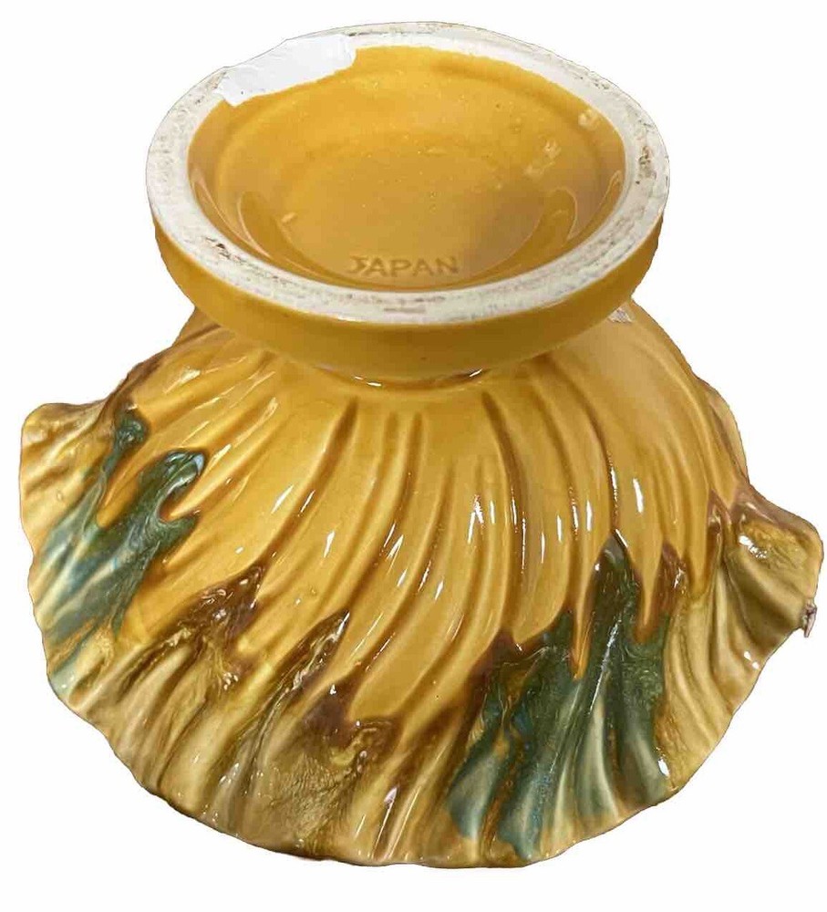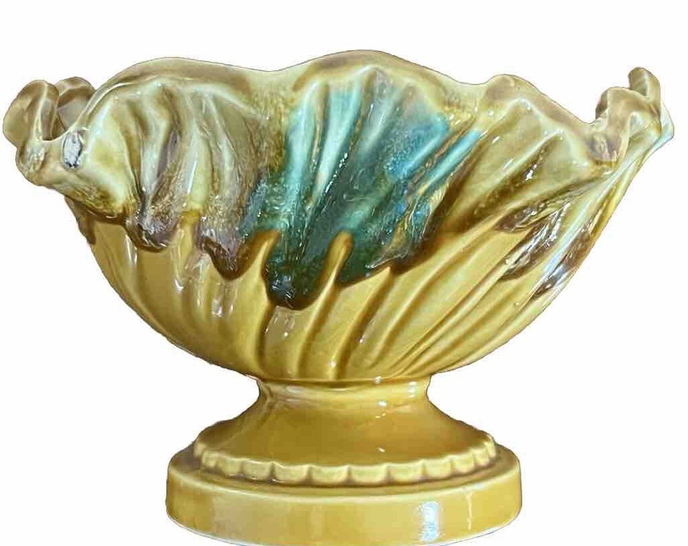This vintage mid-century ceramic planter from Japan features a stunning abstract design in orange, green, and yellow. The all-over pattern is hand-painted and finished with a glossy shine. The vase is made of high-quality ceramic material and is perfect for displaying your favorite flowers or plants. The unmarked brand vase has an impressed backstamp and belongs to the Century product line. The production style of this art pottery is of the mid-century modern style with a production technique of pottery. The vase adds a touch of elegance to any décor and would make a great addition to your collection.