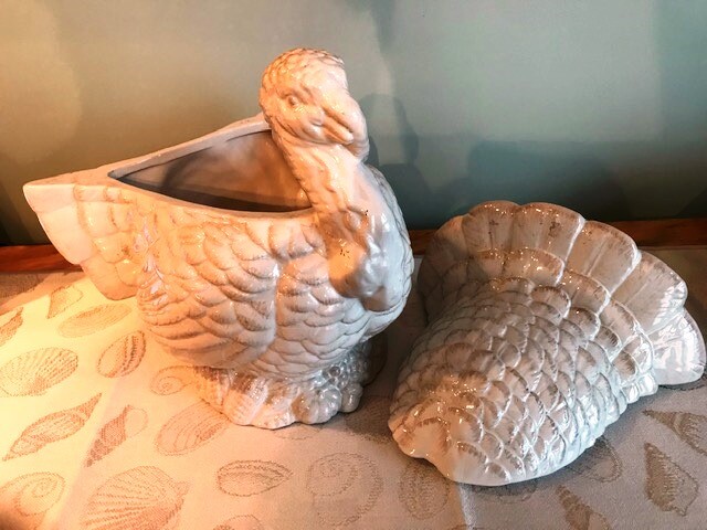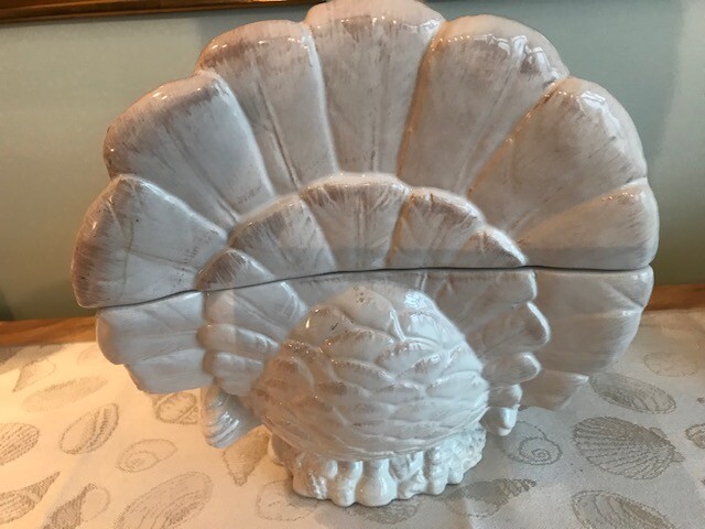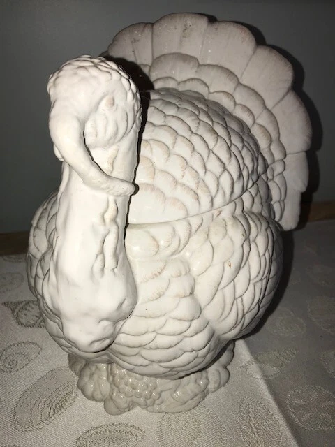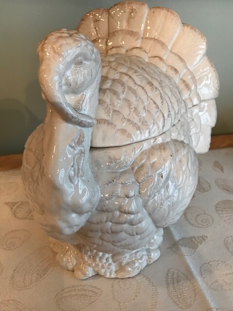 Ceramic Turkey Tureen or Cookie Jar - White Glaze CREATIVE CO-OP MICROWAVE & DISHWASHER SAFE LOVELY WHITE WITH ACCENT WASH IN TAUPE COLOR No hole for soup ladle, so could be a cookie jar perpect condition approximately 10" x 10" x 10 1/2"