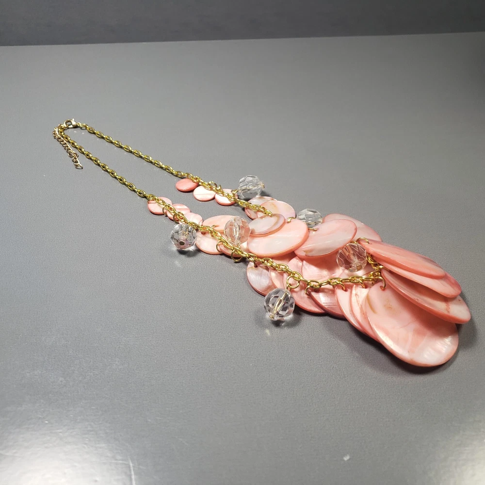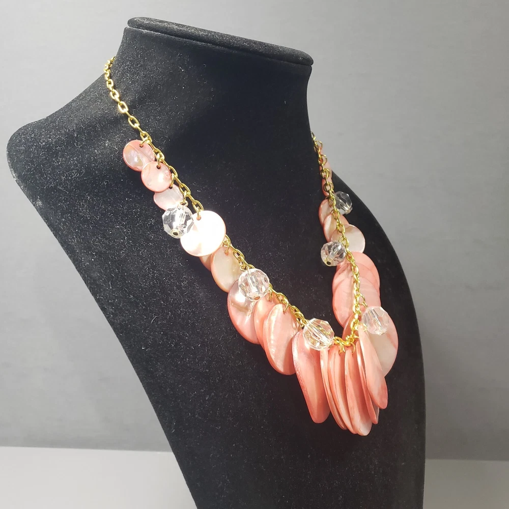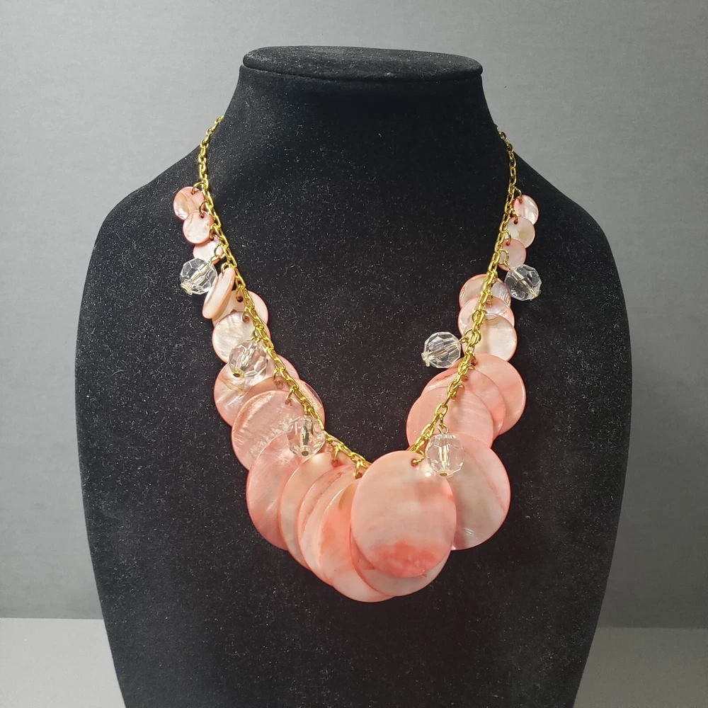 Up for sale is a shell neckla ce. It is gold tone and orange in color . It is in good pre owned condition Please view all posted pictures as they are part of the description. If you have any questions please ask. Please check out my store for more great deals that are listed every day!!