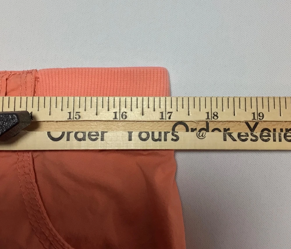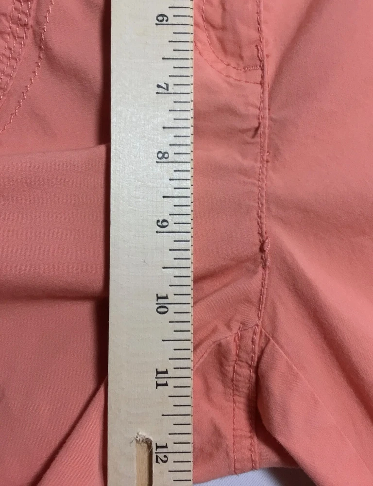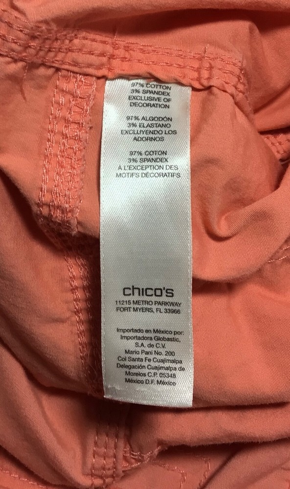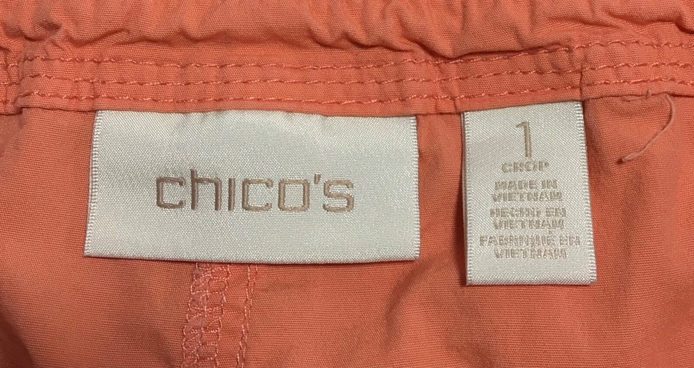 Chicos Pants Womens Size 1 Orange Crop Capri Stretch Mid Rise Tie Leg Pockets.! Size 1. Waist 34” by Rise 10.5” by Inseam 23.5”. In Great condition! No holes or stains.