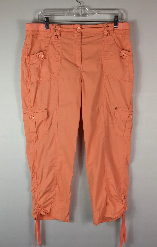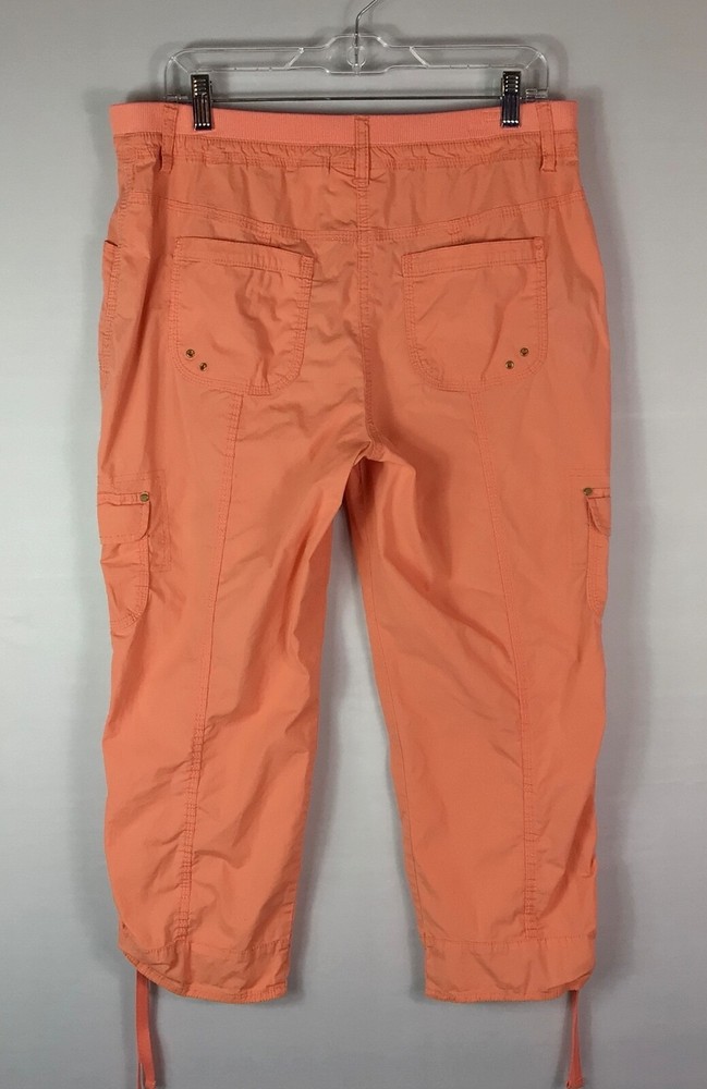 Chicos Pants Womens Size 1 Orange Crop Capri Stretch Mid Rise Tie Leg Pockets.! Size 1. Waist 34” by Rise 10.5” by Inseam 23.5”. In Great condition! No holes or stains....