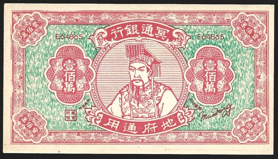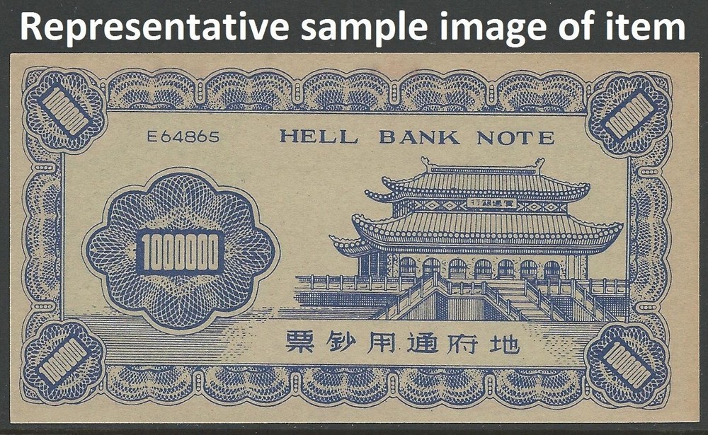 China 1965 Hell Bank 1000000 Yuan YU WONG ( the Jade Emperor, the ruler of heaven in Taoism) Original Note on Joss Paper. NOT A REPRINT. Slightly rounded corner. Minor toning along edges. Uncirculated or Close. Hell money, also known as ghost or spirit money is for burnt-offerings. Joss paper is traditionally made from coarse bamboo paper, which feel handmade with many imperfections and variances. Some have original flaws, small inclusions and misscuts derivating from production. This issue is recognized as Chinese, but is more likely to have been made in Singapore . Fake currency is used in funeral rituals for various Asian religions. Mourners burn the money in hopes of granting their deceased loved ones all the necessary resources in the afterlife. The burning of spirit money is also part of traditional Chinese deity or ancestor worship ceremonies during holidays. Although the offering is sometimes referred to as hell money , it has nothing to do with Western connotations of hell. The Asian understanding of hell is different than Western versions. Under the Chinese belief, for instance, all who die will initially end up in the same place: the underworld of Diyu. Then, they are sent to heaven, to be punished, or to be reincarnated. Hell then, is the neutral form for afterlife in general. Pursuant to the guidelines for all sales of tangible goods, taxes will be collected and remitted to the appropriate tax authorities. Possible Customs charges, depending on the rules in force in the country of destination. All lots are guaranteed. If you consider that the lot is not as described, you can send it back for full refund (except certification and registration cost) within 30 days of purchase. Member: The Royal Philatelic Society of Canada The Christmas Seal & Charity Stamp Society Haiti Philatelic Society The British North America Philatelic Society