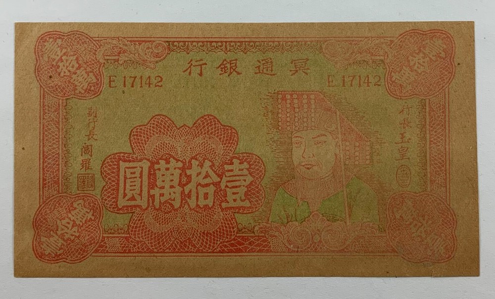 China / Chinese Hell Bank Note - 100000 yuan #E17142. Hell money is a form of joss paper resembling bank notes. Their intended purpose is to be offered as burnt offerings to the deceased on their journey in the afterlife. Measures approximately 5” x 2 1/4” in size. Has age toning otherwise in good uncirculated condition. Successful Canadian bidder to pay applicable taxes + $2.00US for shipping with no tracking number. Should shipping be less than quoted, we will refund back to your Paypal account (if difference is more than $1.00). Successful U.S. bidder to pay $2.50US for shipping with no tracking number. Should shipping be less than quoted, we will refund back to your Paypal account (if difference is more than $1.00). Overseas buyer (all countries other than Canada and the U.S.A.) to pay $3.00US or more for shipping with no tracking number, varies depending on the country the item is to be shipped. Should shipping be less than quoted we will refund back to your Paypal account (if difference is more than $1.00). WE WILL COMBINE SHIPPING FOR MULTIPLE ITEMS PURCHASED. If no tracking number is offered and you wish a tracking number, please let us know.