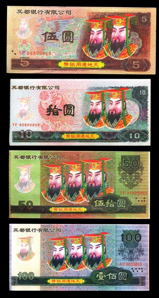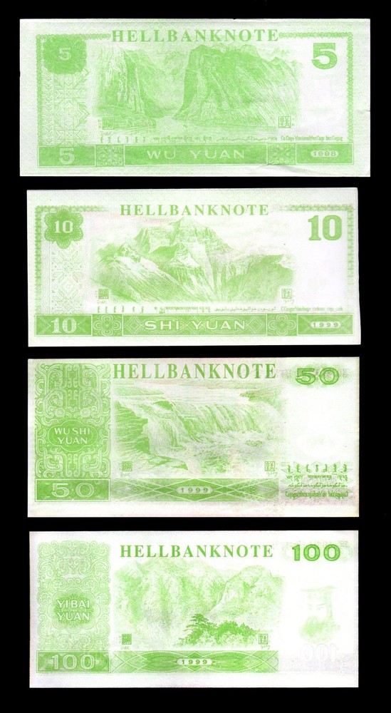 China SET 4PCS 5-100 Dollars Chinese Heaven Hell Notes Joss/Rice Paper Money *NOT LEGAL TENDER 5 Dollars 1998 10 Dollars 1999 50 Dollars 1999 100 Dollars 1999 Images are scans and for reference only, your banknotes may look slightly different . The actual note(s) you will receive may have a different serial number, prefix, signature, and may not be consecutive. Images are scans and for reference only, your banknotes may look slightly different . Shipping Information: I combine multiple winnings to save on shipping, request total before you pay. If you have any concerns or questions, please don't hesitate to contact me. Thank you for looking! Powered by SixBit's eCommerce Solution