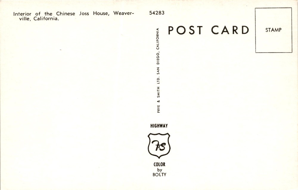 MAKE AN OFFER. THE MORE YOU BUY THE BETTER DEAL I WILL ACCEPT The postcard depicts the interior of the Chinese Joss House in Weaverville, California. Weaverville is a historic town in Trinity County, known for its Gold Rush era architecture and sites. The Chinese Joss House is a significant historical site, representing the Chinese immigrant community that settled in California during the Gold Rush.
