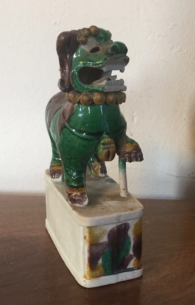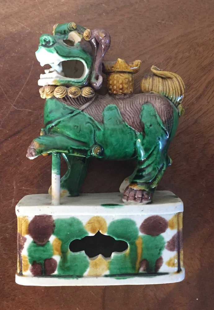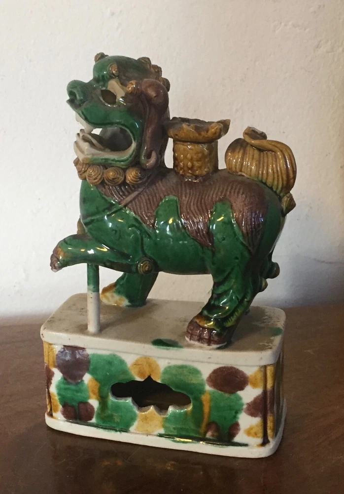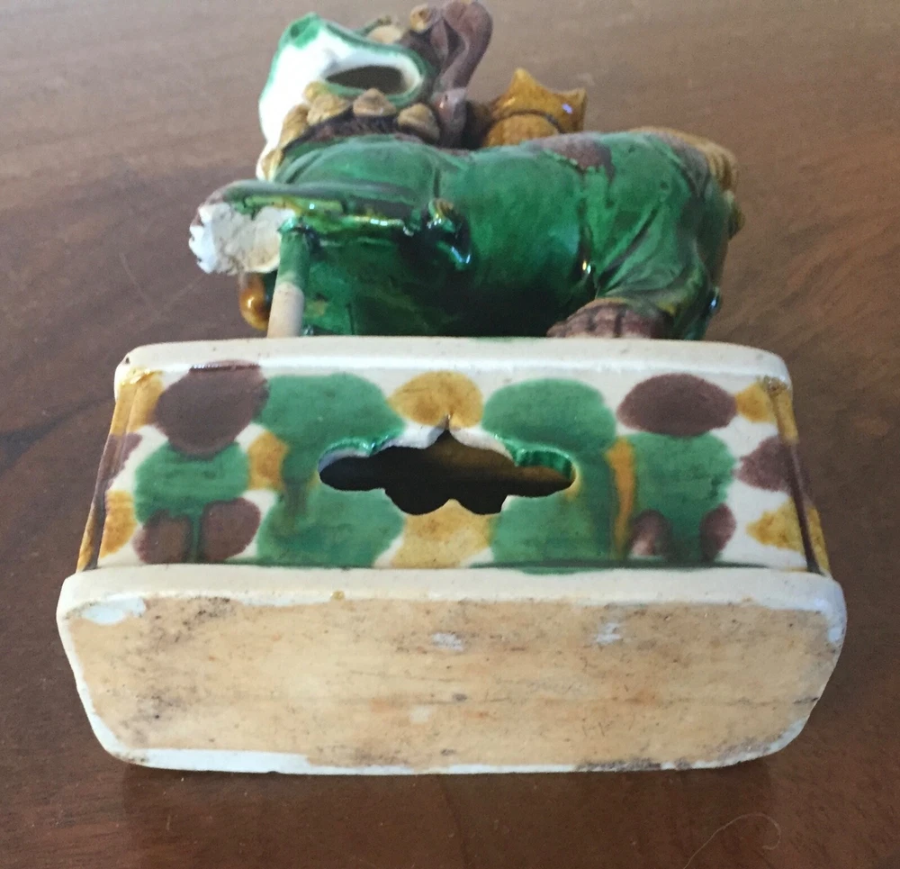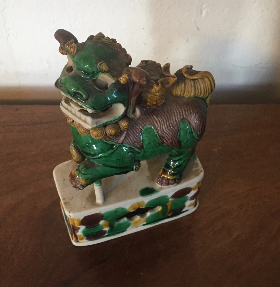 Antique 17th / 18th century Chinese Kangxi Period porcelain foo dog or mythical beast as an incense burner or joss stick holder. The figure stands atop a rectangular plinth decorated in spinach glaze. Measures 5 7/8" tall x 3 7/8" wide x 1 3/4" deep. Good condition - chip & loss to the holder on his back - does not detract. Eyes and ball missing. Very small chip to tail. Displays beautifully. Please note - international shipping with recorded delivery insured at full value.