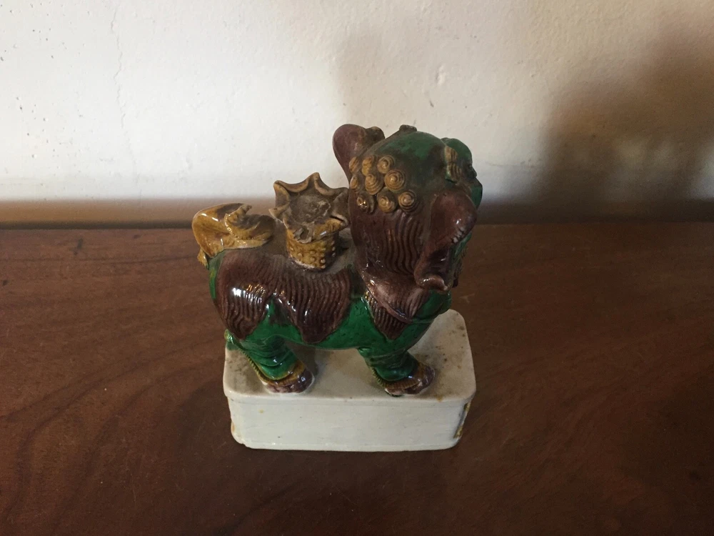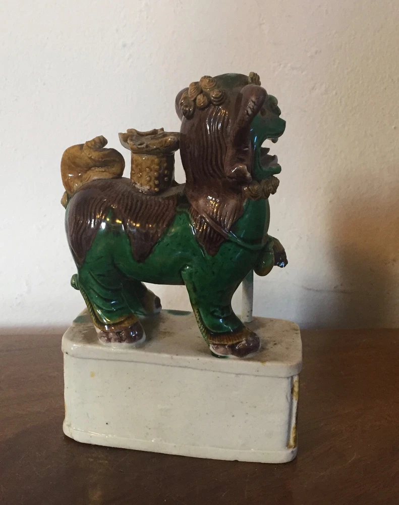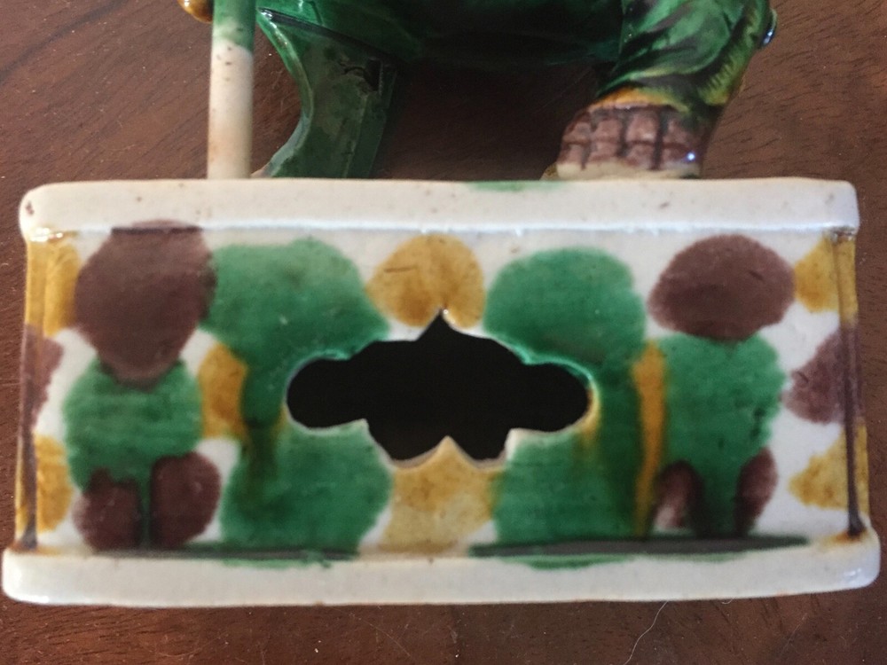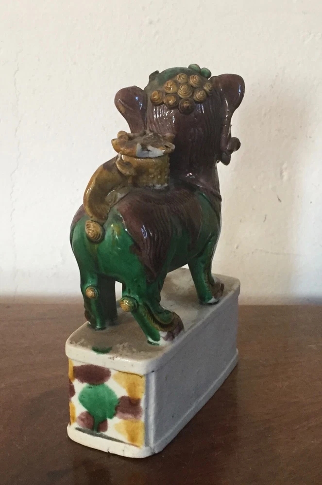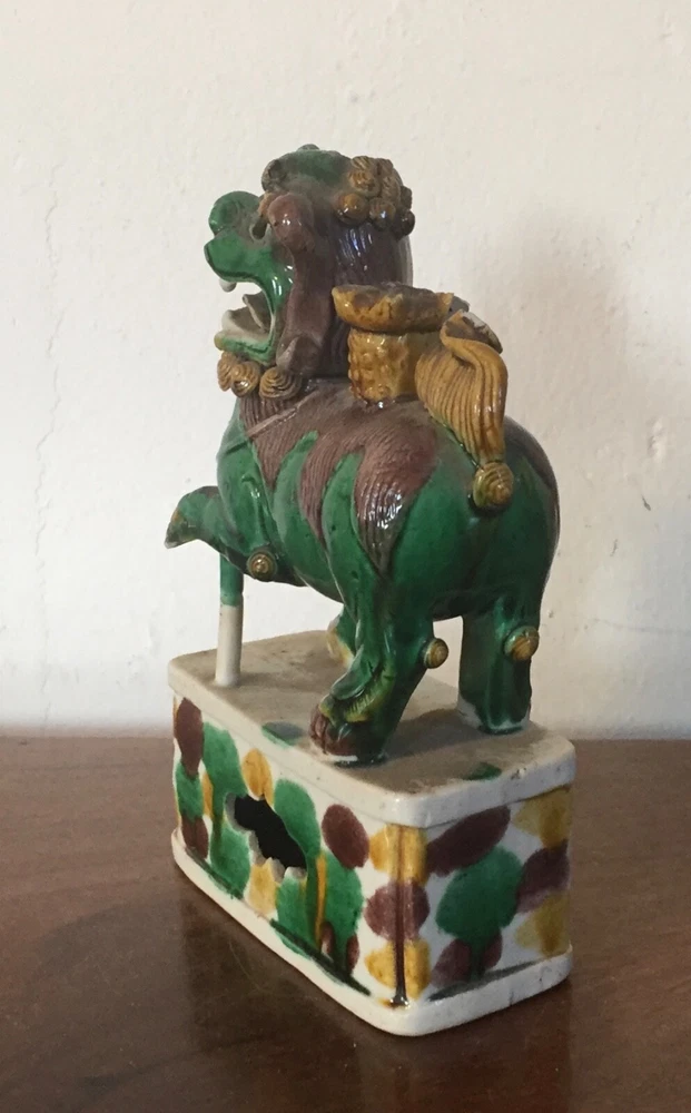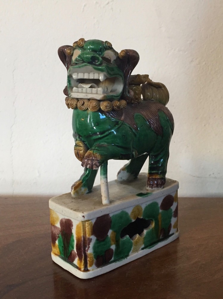 Antique 17th / 18th century Chinese Kangxi Period porcelain foo dog or mythical beast as an incense burner or joss stick holder. The figure stands atop a rectangular plinth decorated in spinach glaze. Measures 5 7/8" tall x 3 7/8" wide x 1 3/4" deep. Good condition - chip & loss to the holder on his back - does not detract. Eyes and ball missing. Very small chip to tail. Displays beautifully. Please note - international shipping with recorded delivery insured at full value.