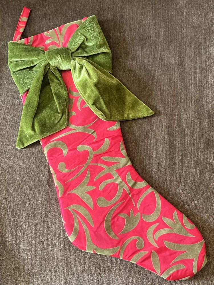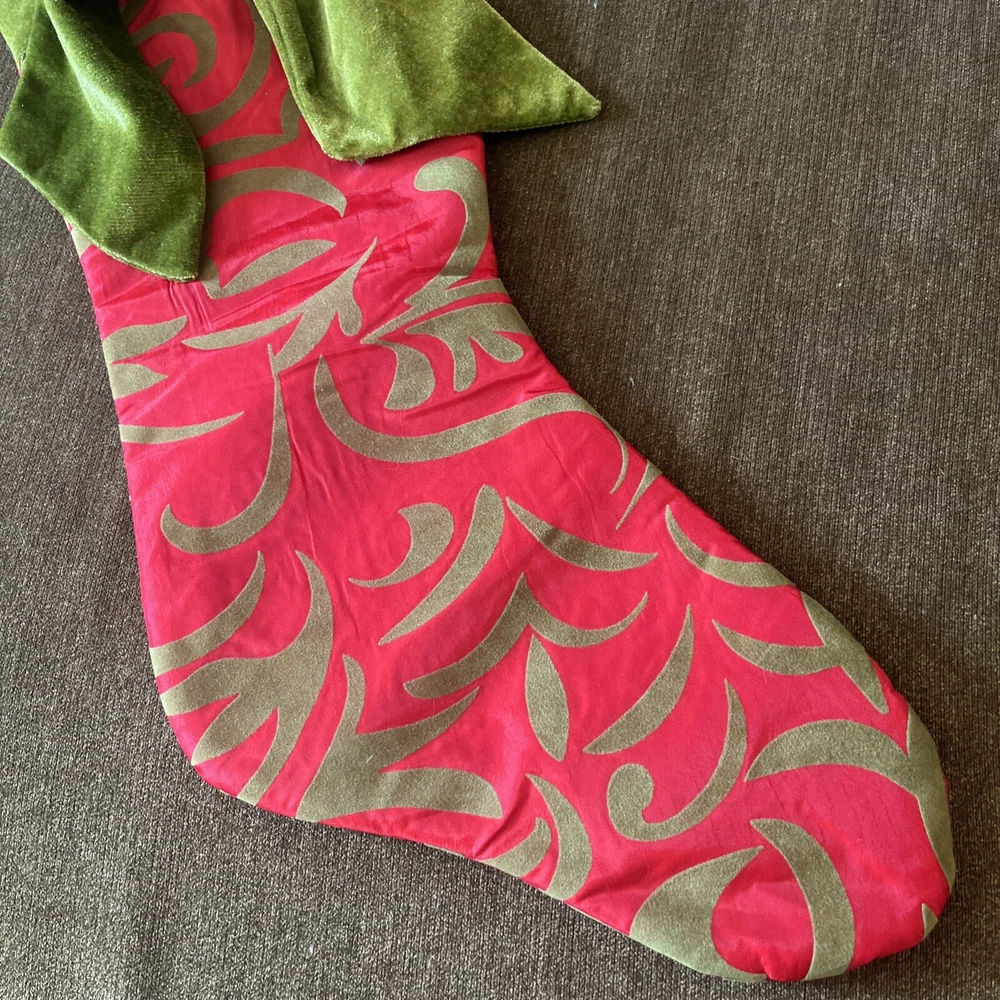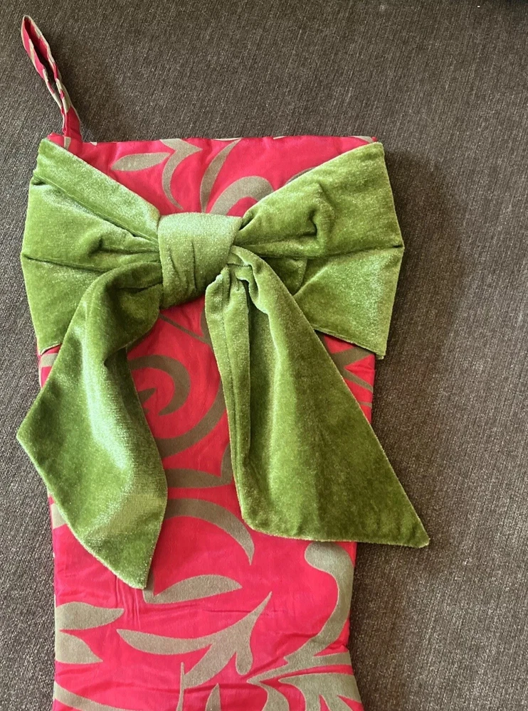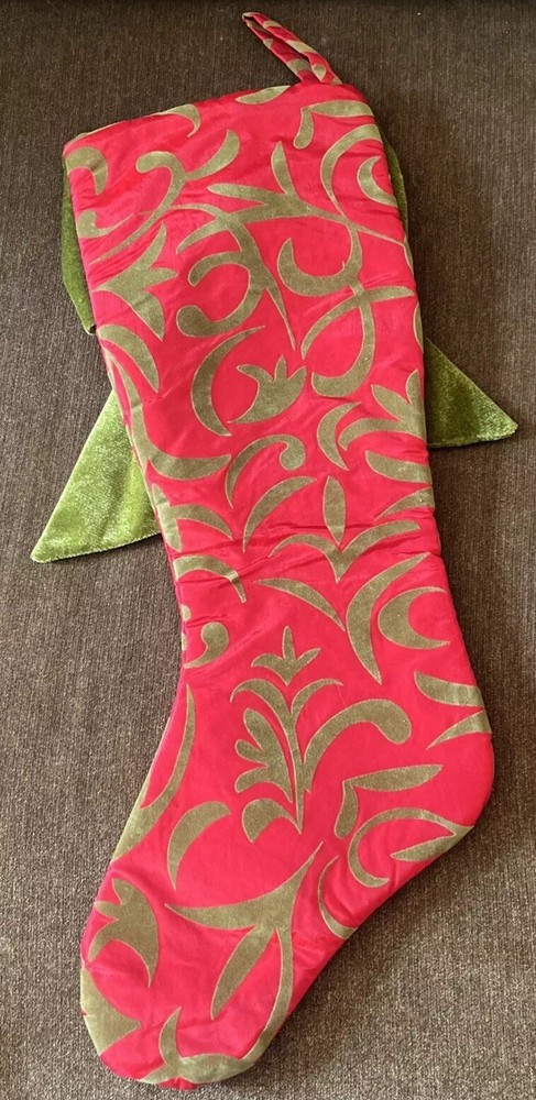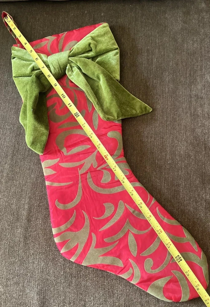 Christmas Stocking Creative Co-op Velvet Satin Look Red Green Bow Filigree Stockings are in excellent pre owned condition. No snags stains holes or tears. Please see pictures for details for this is the stocking you will receive. Dimensions: Length - 26.5” 100% Authentic 30 Day Returns accepted Please contact us with any questions Thank you for visiting our store.