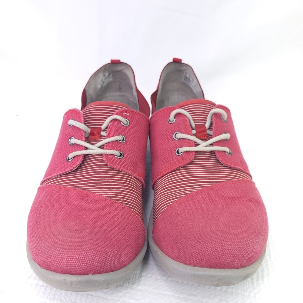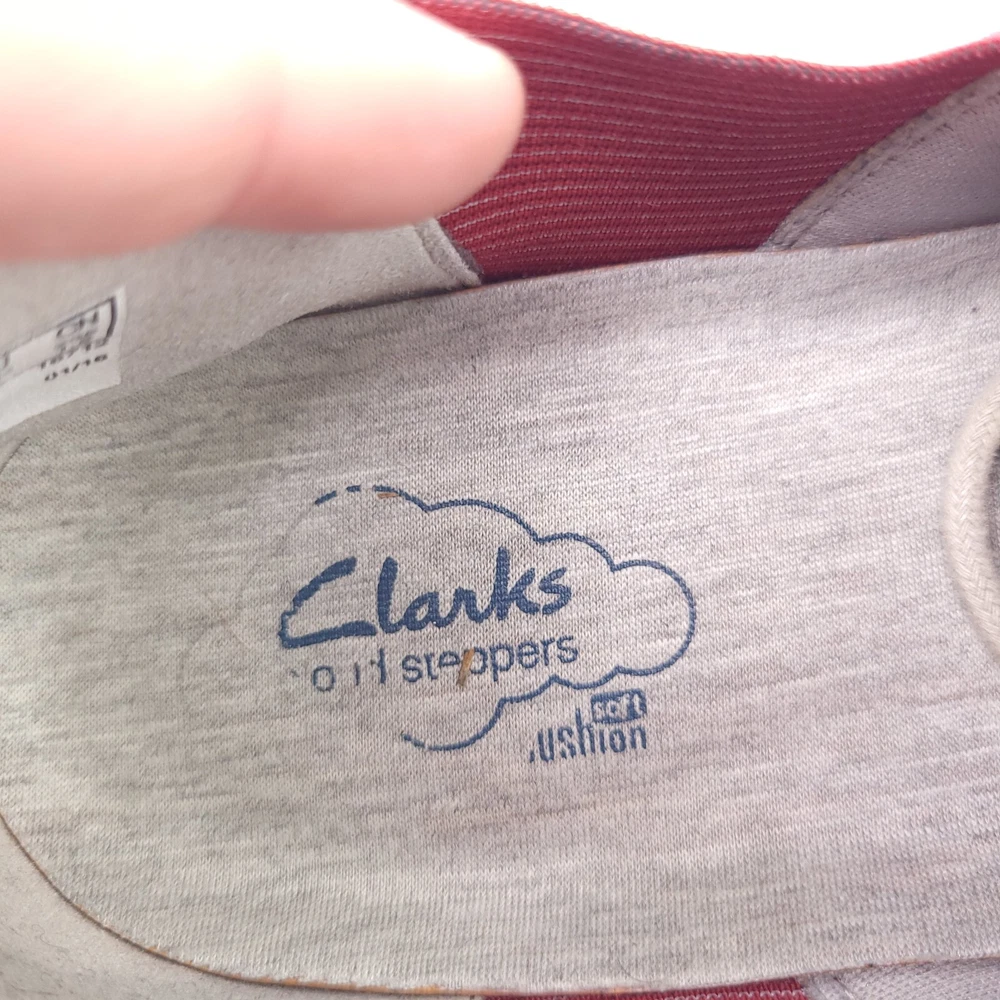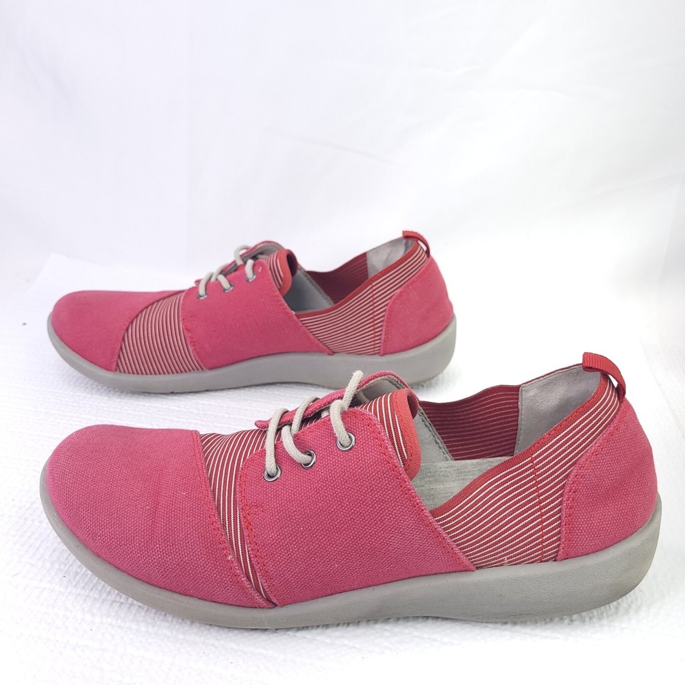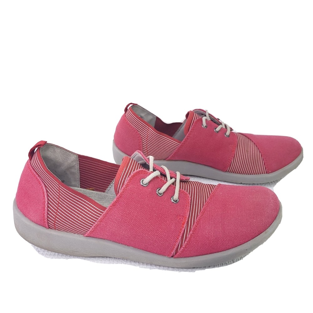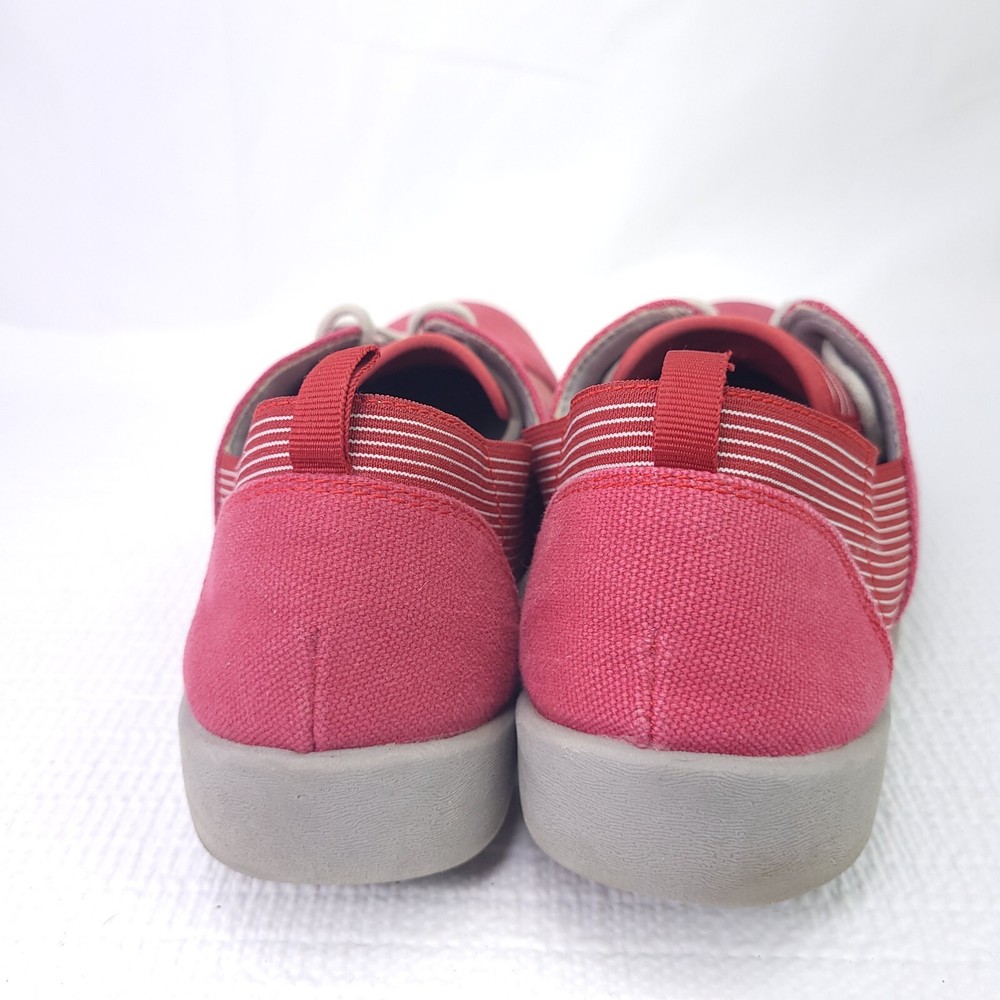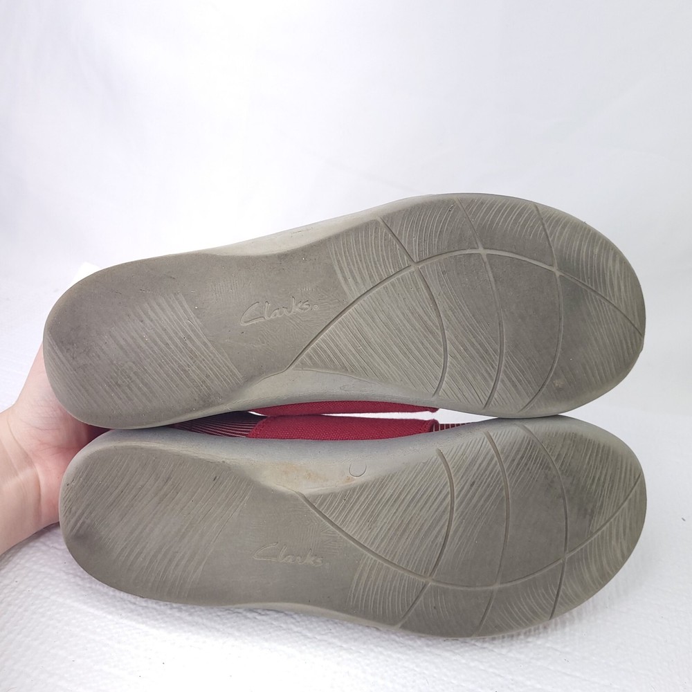 Clark Cloudsteppers Sillian Joss Shoes Red Striped Wrap Sneakers Size 10. Condition is pre-owned and shows normal signs of wear. Will need light cleaning. Please see pictures for details and consideration. Check out our feedback and buy with confidence. Fast shipping!