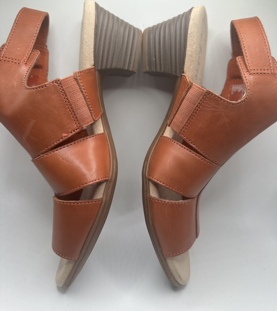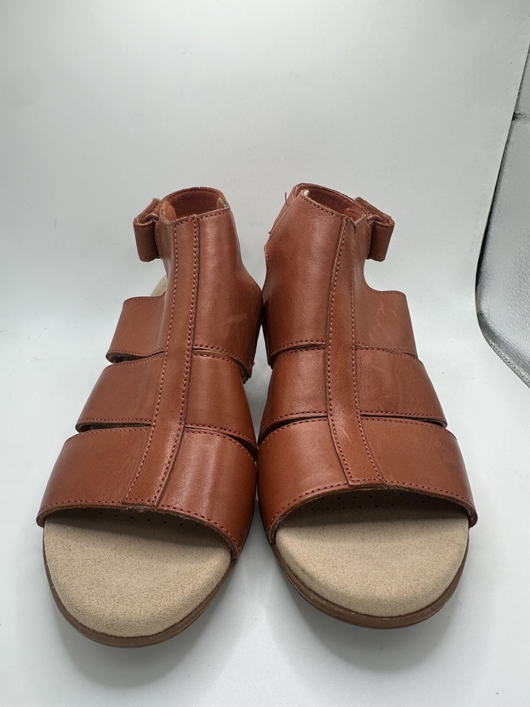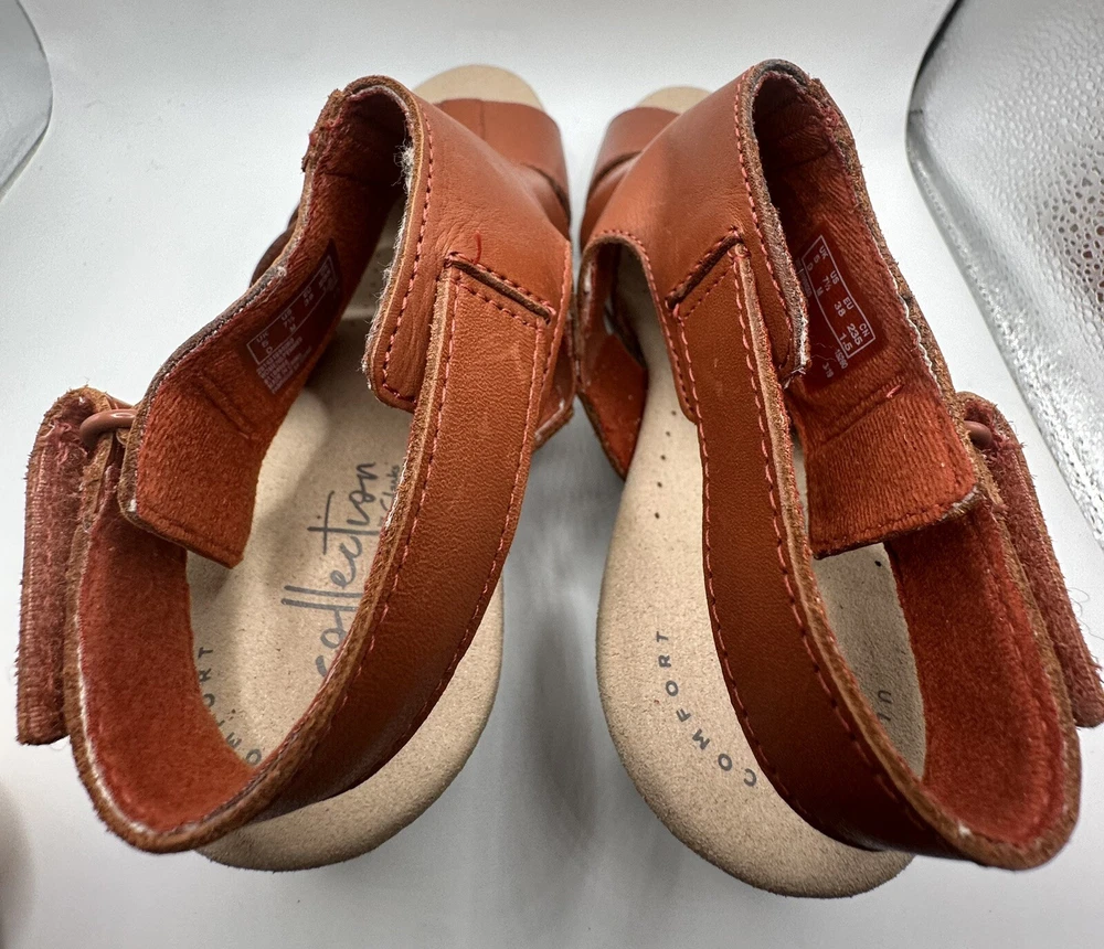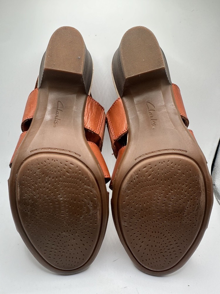 Size 7.5 Good condition - see photos Fast shipping !! Elevate your shoe collection with these Clarks Valarie Dalia sandals in a stunning rust orange color. These dressy sandals feature an open toe design and a hook & loop closure for a secure fit. The mid-height wedge heel is perfect for any occasion, whether it be casual, workwear, or travel. Crafted with high-quality leather and an ortholite footbed, these sandals are both stylish and comfortable. The solid pattern and metal theme make them a versatile addition to any outfit. Available in UK size 5 and US size 7.5, these Clarks sandals are a must-have for any woman's shoe collection.