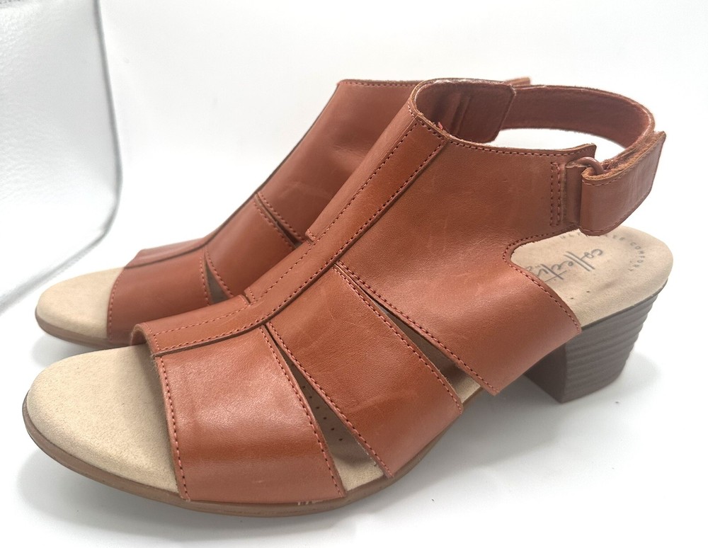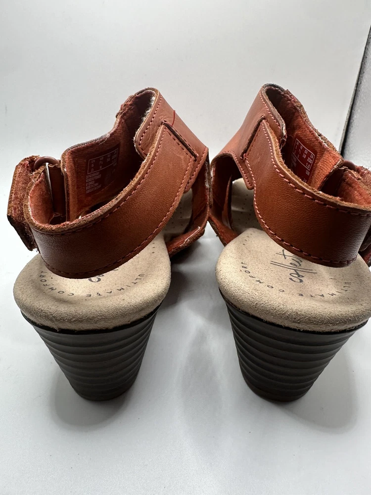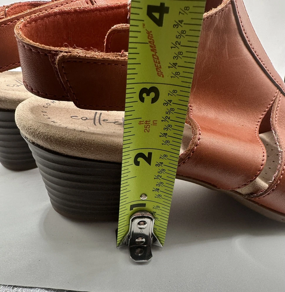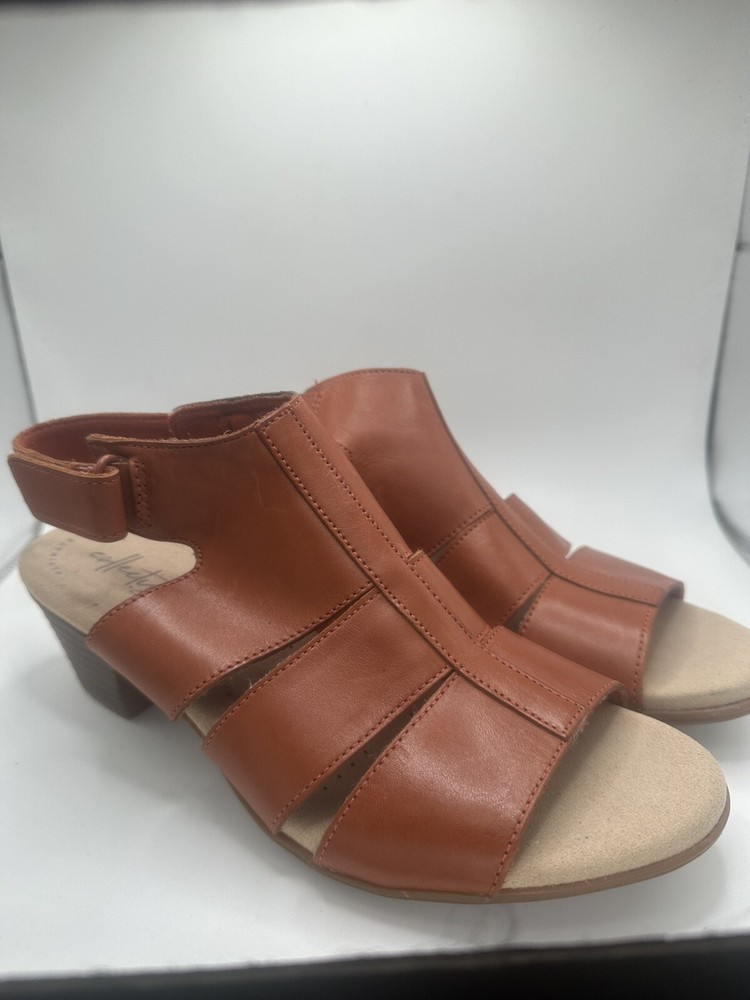 Size 7.5 Good condition - see photos Fast shipping !! Elevate your shoe collection with these Clarks Valarie Dalia sandals in a stunning rust orange color. These dressy sandals feature an open toe design and a hook & loop closure for a secure fit. The mid-height wedge heel is perfect for any occasion, whether it be casual, workwear, or travel. Crafted with high-quality leather and an ortholite footbed, these sandals are both stylish and comfortable. The solid pattern and metal theme make them a versatile addition to any outfit. Available in UK size 5 and US size 7.5, these Clarks sandals are a must-have for any woman's shoe collection.