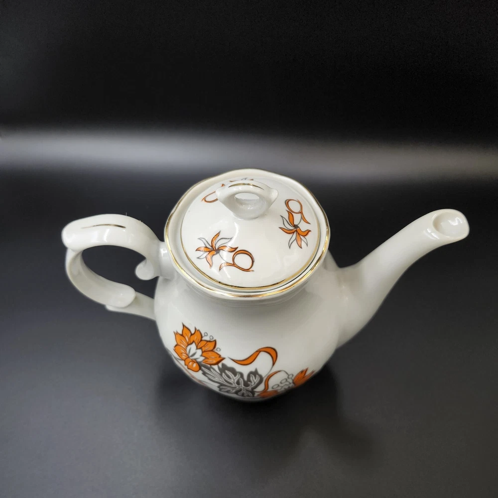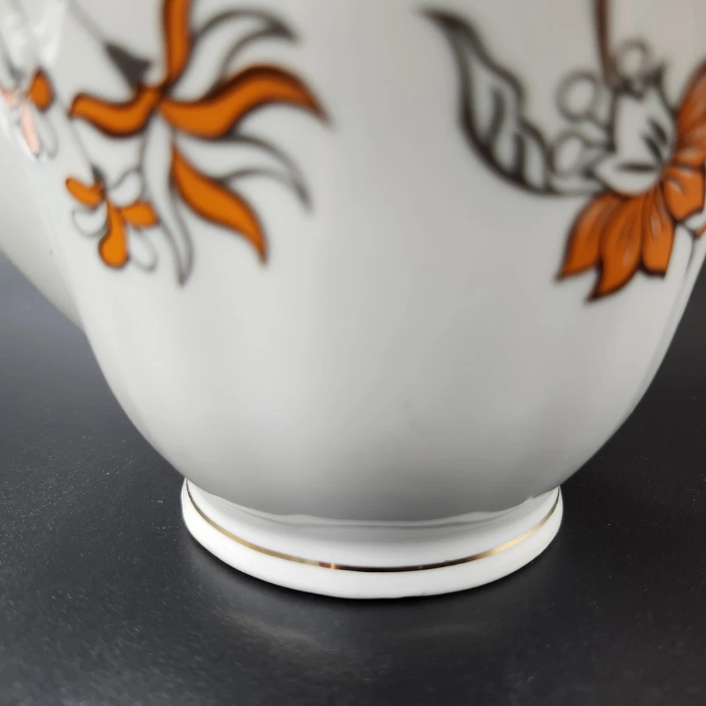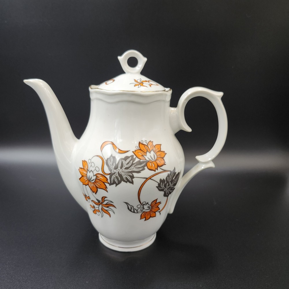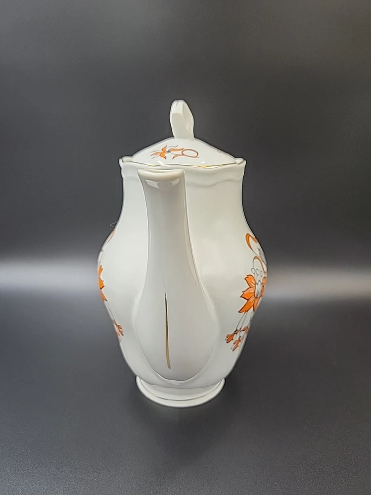 This Cmielo Poland Porcelain Pottery Coffee Pot is a true Mid Century gem. With its elegant shape and glossy finish, it is adorned orange flowers and gray leaves that give it a touch of sophistication. The pot is 21cm in height and 12 cm in width with a capacity of 700mL, making it the perfect size for serving coffee or tea. The pot comes with a lid and handles and is decorated with gold trim that adds to its charm. It is an original piece and is in excellent condition. The coffee pot has a printed C Cmielo backstamp. Hand wash only.