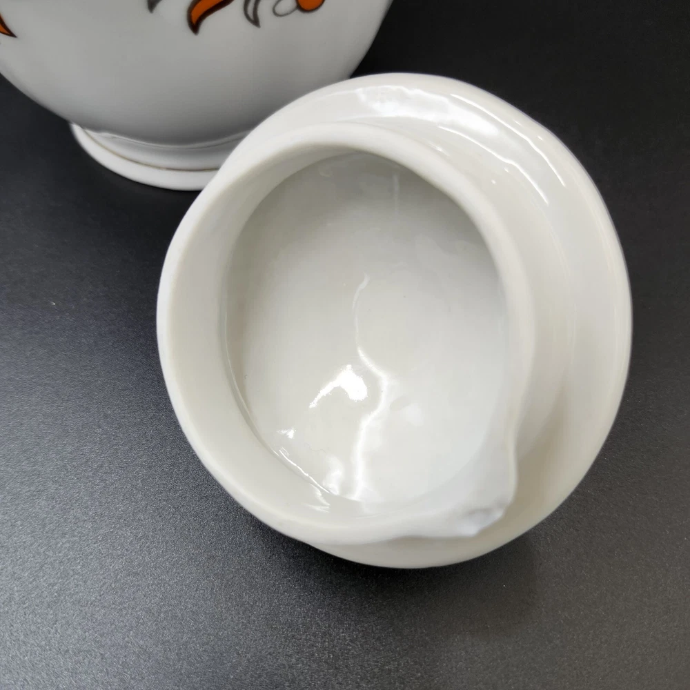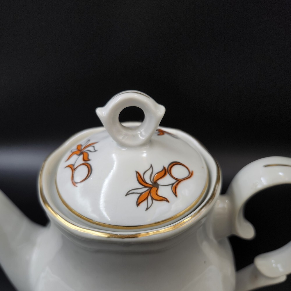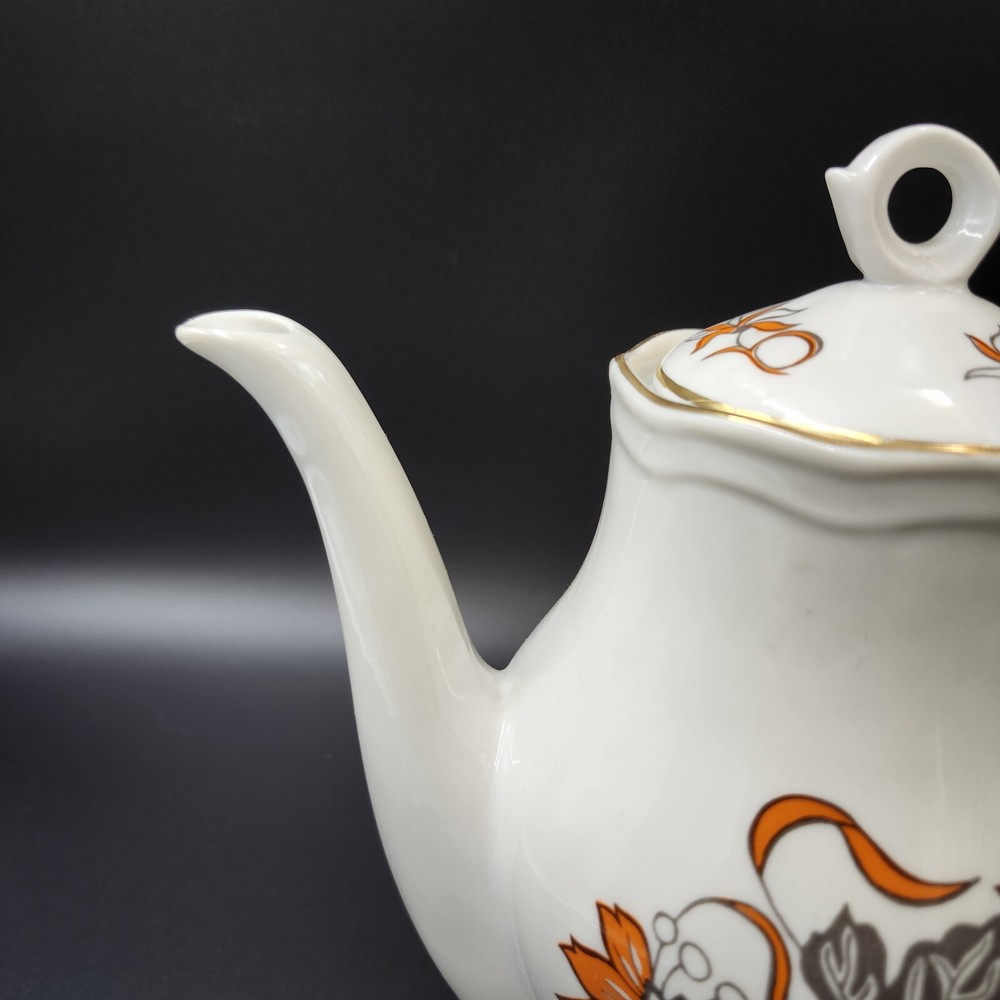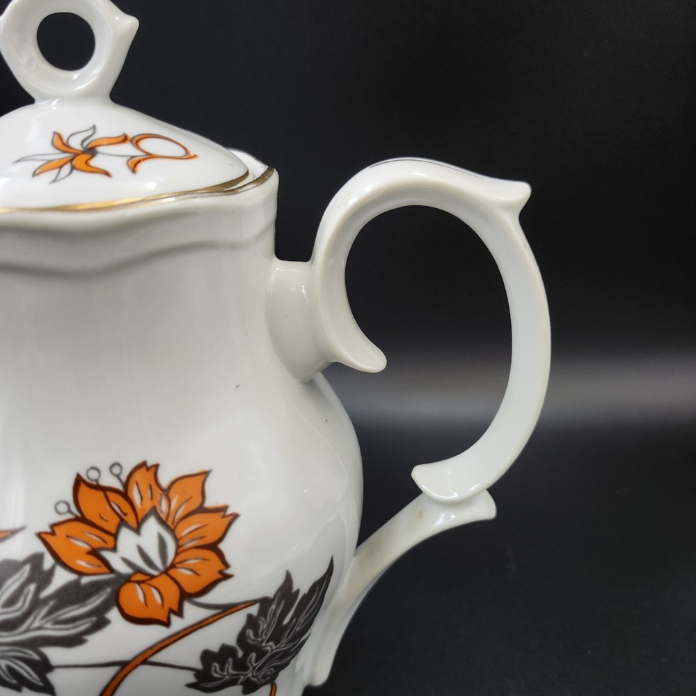This Cmielo Poland Porcelain Pottery Coffee Pot is a true Mid Century gem. With its elegant shape and glossy finish, it is adorned orange flowers and gray leaves that give it a touch of sophistication. The pot is 21cm in height and 12 cm in width with a capacity of 700mL, making it the perfect size for serving coffee or tea. The pot comes with a lid and handles and is decorated with gold trim that adds to its charm. It is an original piece and is in excellent condition. The coffee pot has a printed C Cmielo backstamp. Hand wash only.
