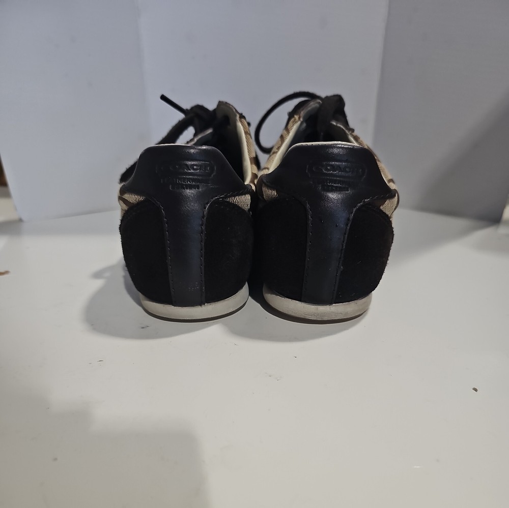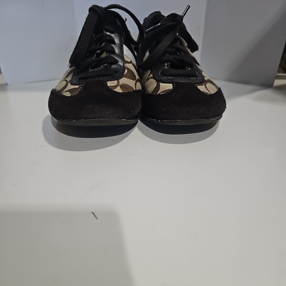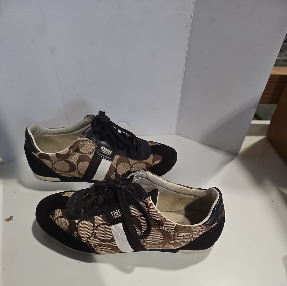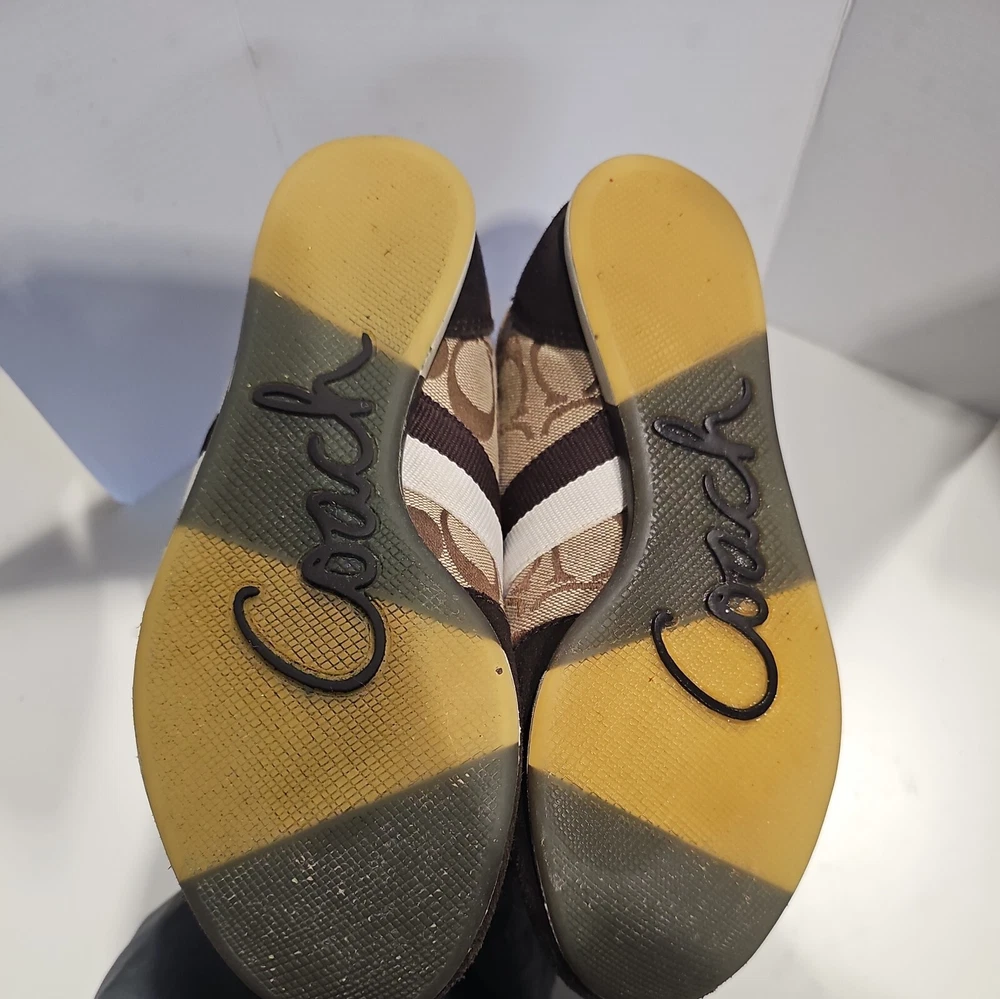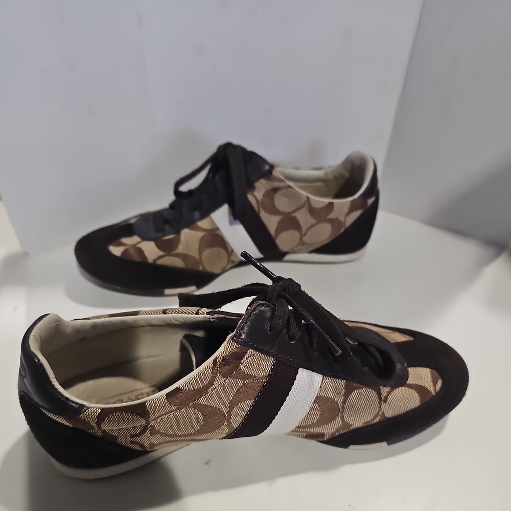 Crafted for the modern woman, these Coach Joss Signature Sneakers in a rich brown hue offer a blend of elegance and comfort. A true representation of the Coach Signature product line, these sneakers are designed to complement an active lifestyle while providing a stylish touch to casual ensembles. The sneakers feature a durable construction with a sleek athletic design, perfect for both daily wear and special occasions. The US size 6.5 ensures a comfortable fit for those with discerning taste and a penchant for quality footwear. Elevate your sneaker game with these chic, versatile, and timeless Coach athletic shoes.