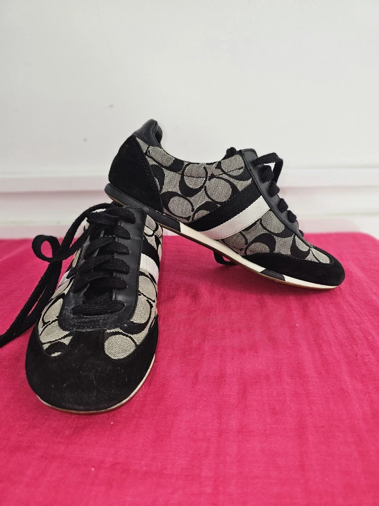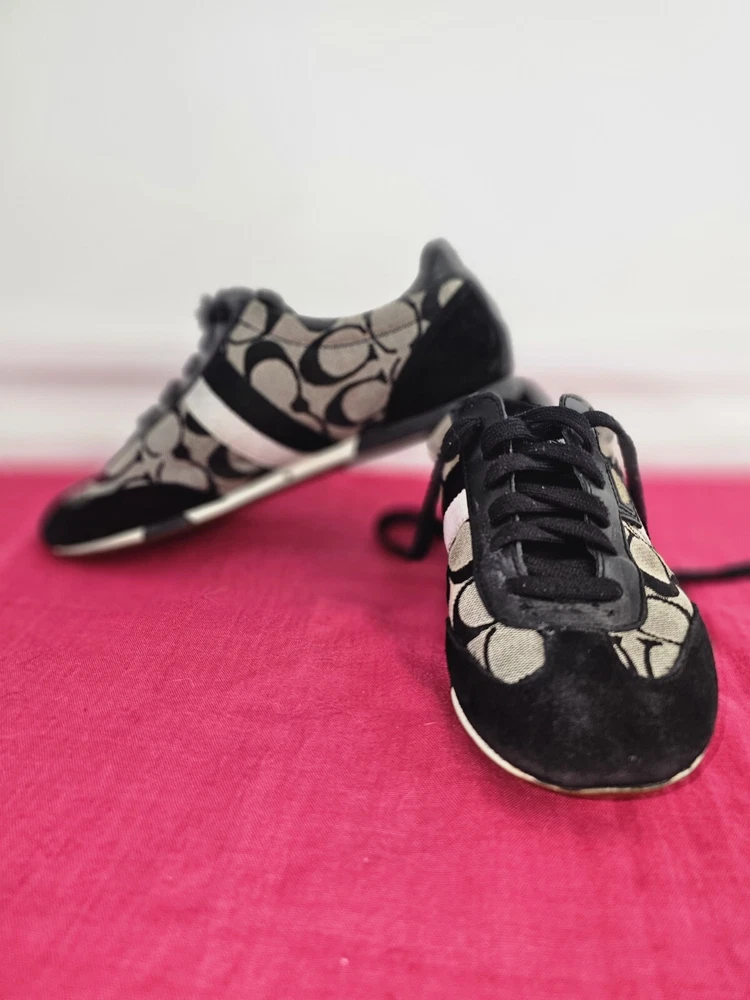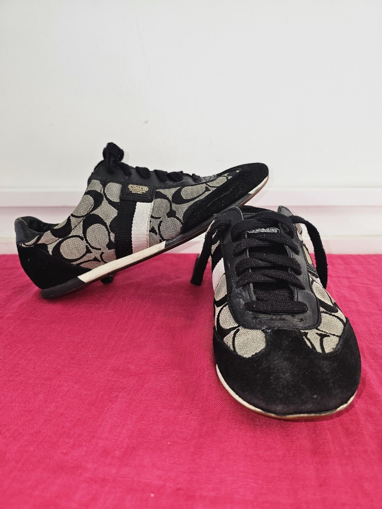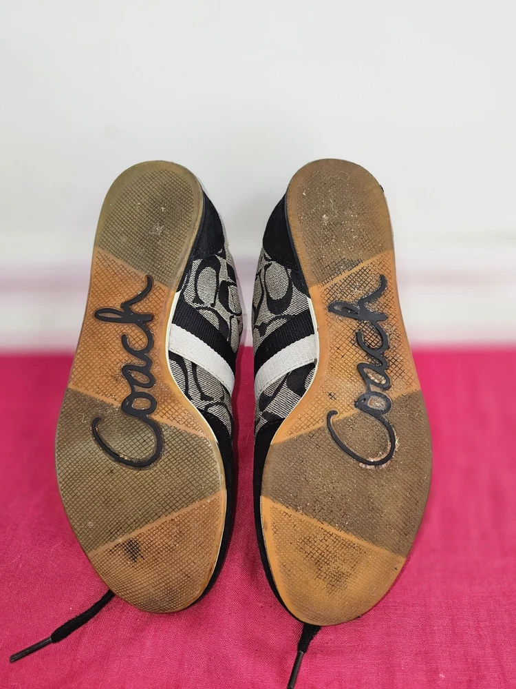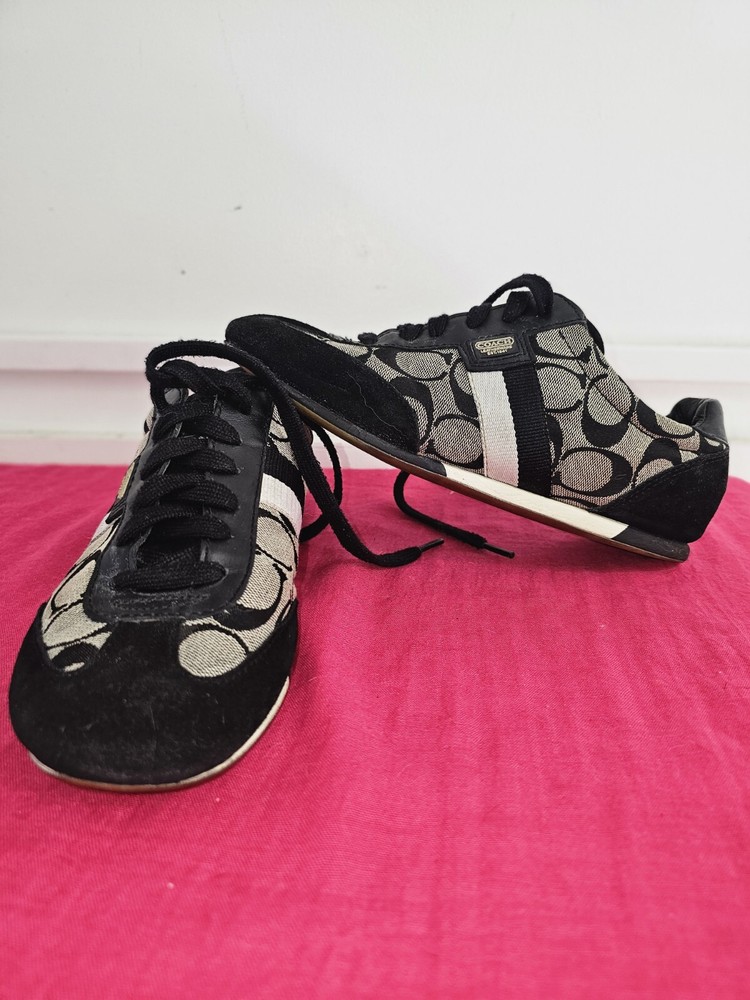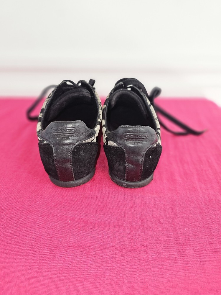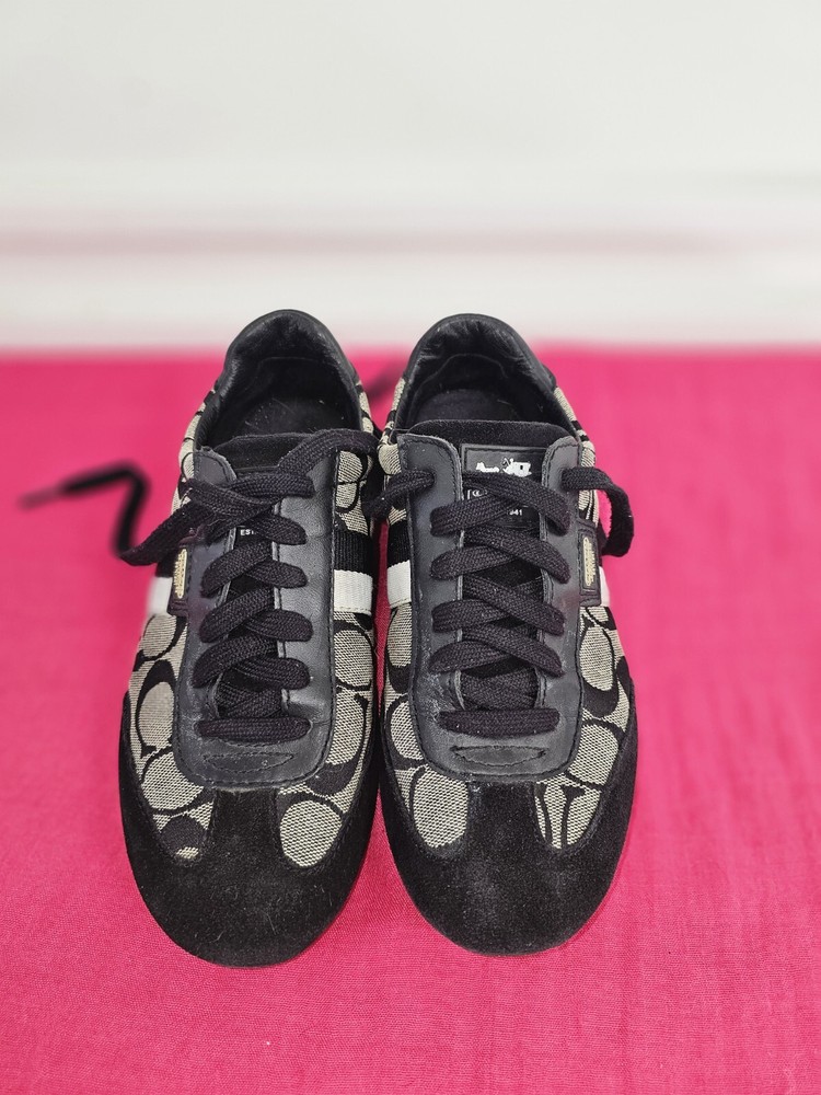 Elevate your sneaker game with these Coach Joss sneakers. Featuring a black canvas upper with the iconic Coach signature logo pattern, these shoes are perfect for a variety of occasions such as activewear, casual outings, and workwear. The suede outsole provides durability and the lace-up closure ensures a secure fit. These women's sneakers also offer comfort with a foam insole and a low-top shoe shaft style. The Coach Joss sneakers come in size 5.5M and have a medium shoe width. Add a touch of designer flair to your shoe collection with this classic and versatile pair of Coach sneakers.