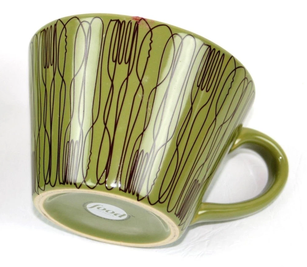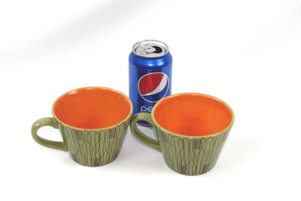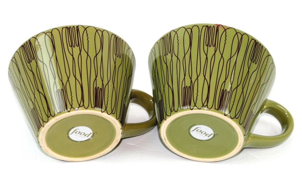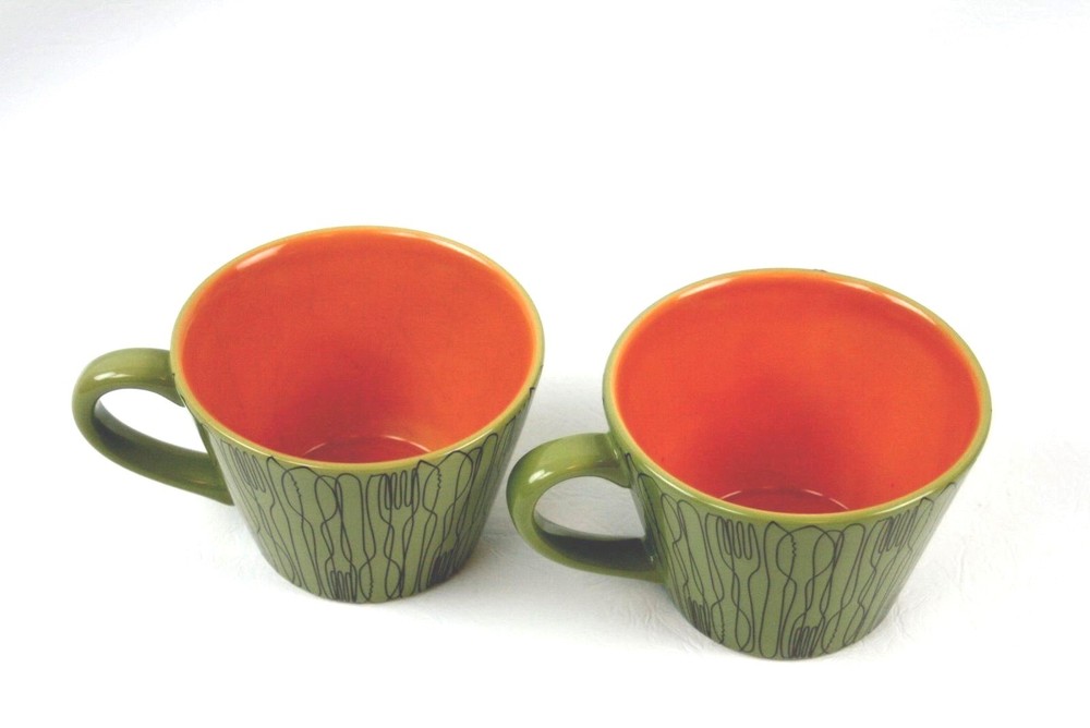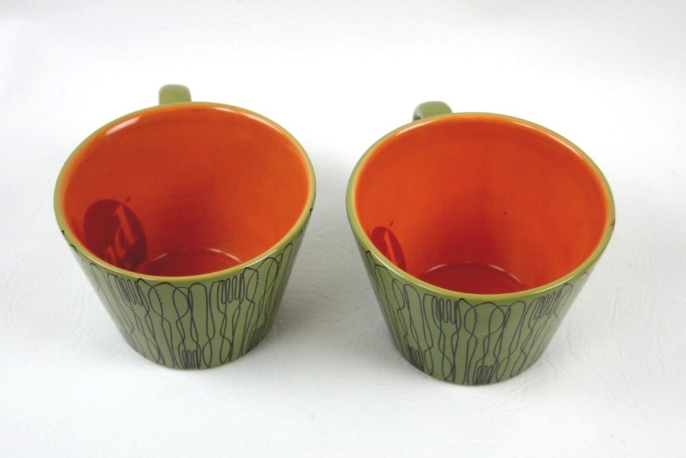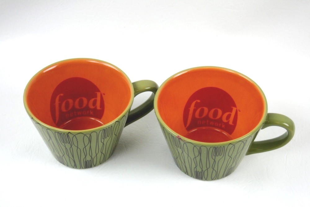 Here we have a set of coffee mugs from The Food Network. The are a avocado green on the outside with a knife/fork/spoon design and the inside is a bright orange with "The Food Network" printed on one side. The are in good pre owned condition with no chips. One of the mugs does have a little bit of crazing on the inside that can be seen in the photos. They measure 4.5" diameter at the top, 3.75" tall, 2.75" diameter at the bottom. They hold approximately 12 ounces of fluid. Froo www.froo.com | Froo Cross Sell, Free Cross Sell, Cross promote, eBay Marketing, eBay listing Apps, eBay Apps, eBay Application