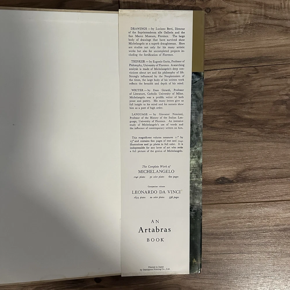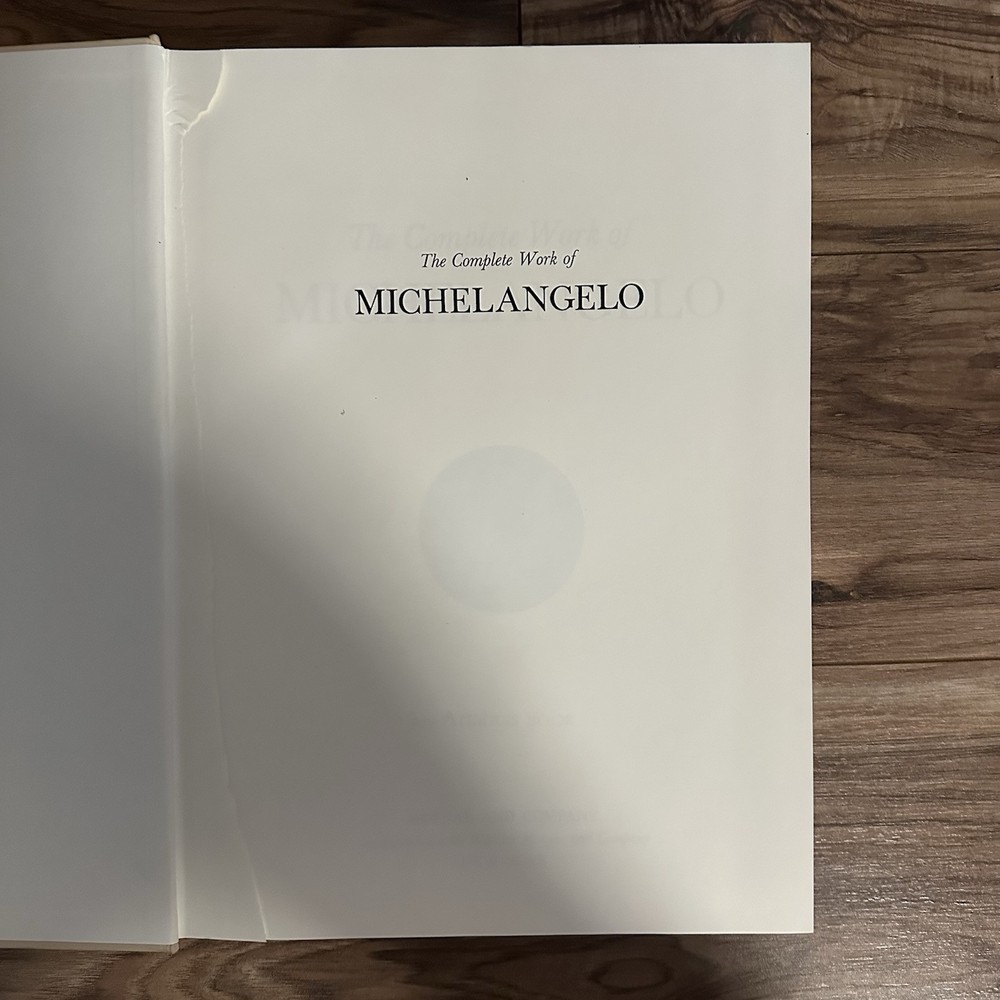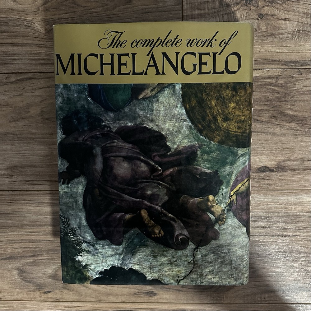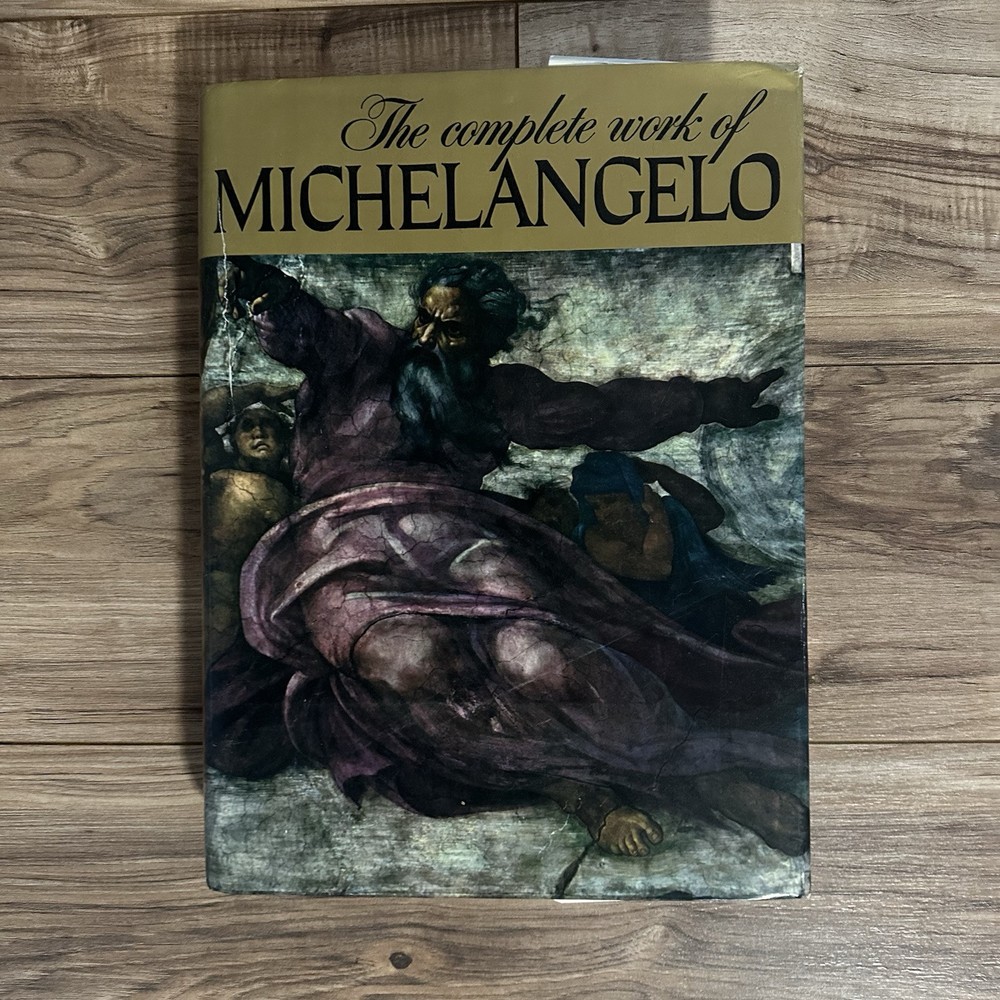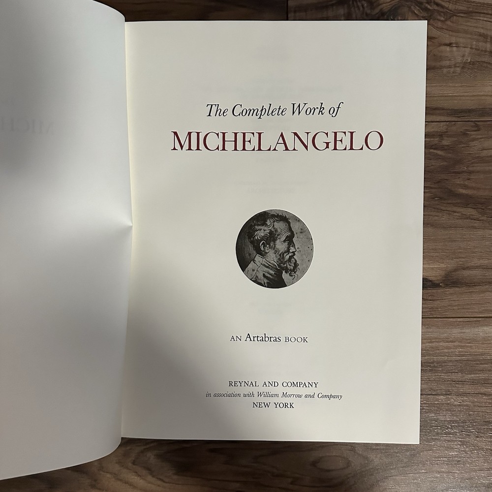 The product is an illustrated hardcover book titled "Complete Work of Michelangelo" by Mario Salmi, published by Reynal and Company. The book focuses on the art of Michelangelo and is written in English. It is a nonfiction narrative that showcases the complete works of the renowned artist, making it a valuable resource for those interested in art and culture. This large book provides a comprehensive overview of Michelangelo's artistic contributions and is likely to appeal to art enthusiasts and scholars alike.