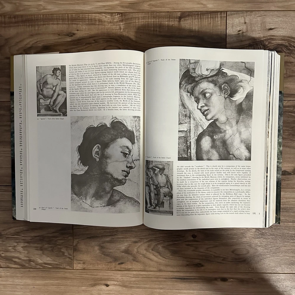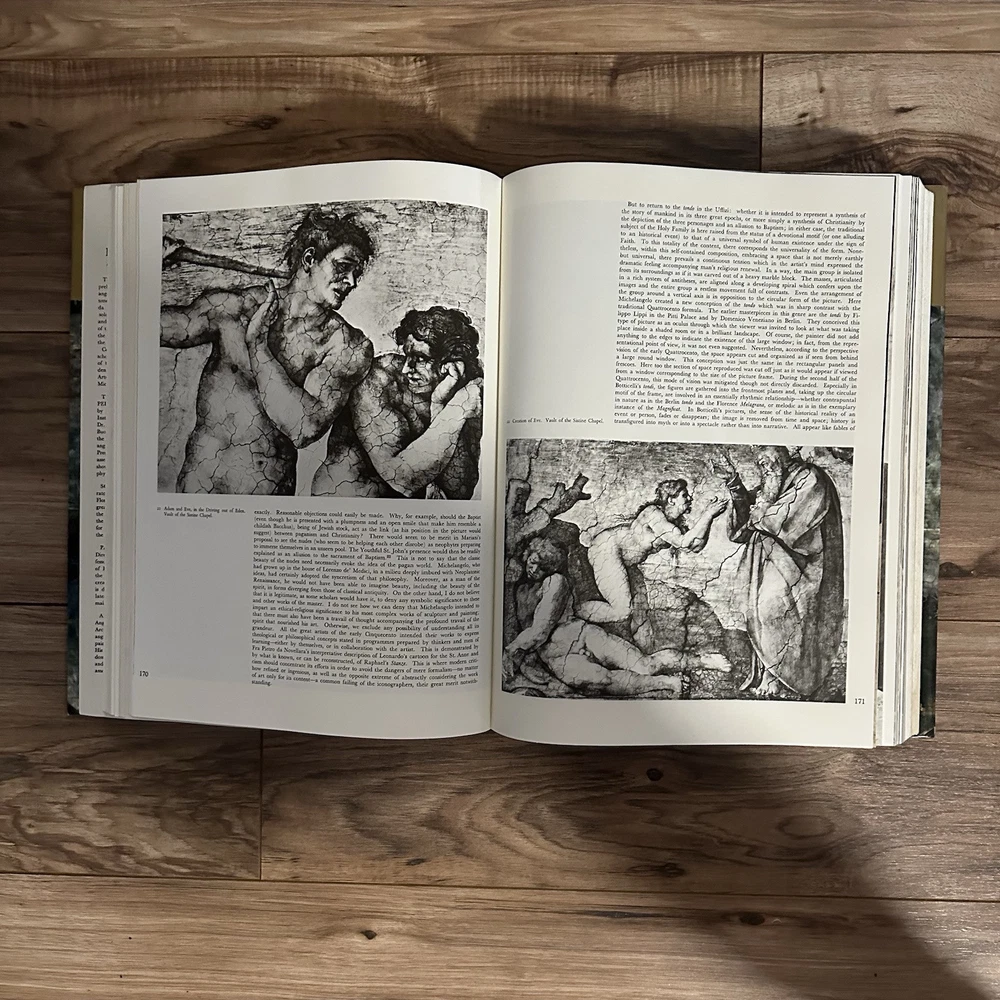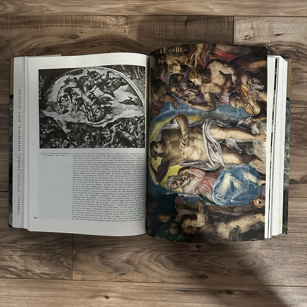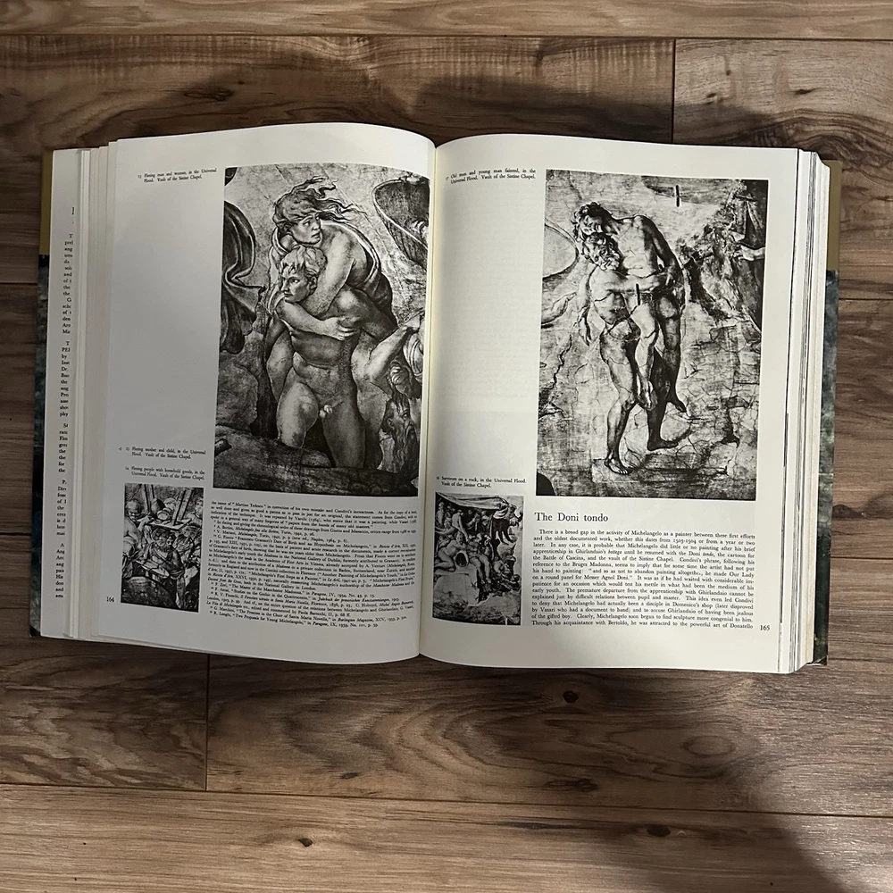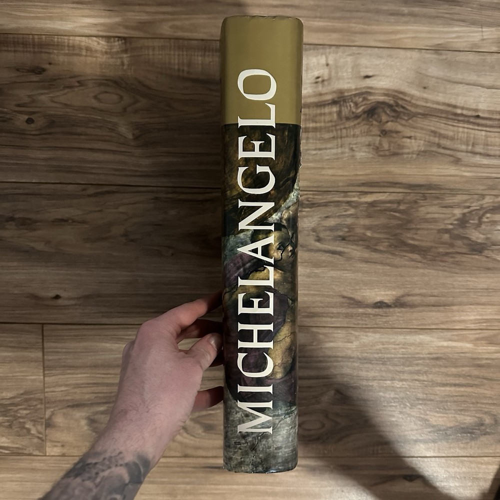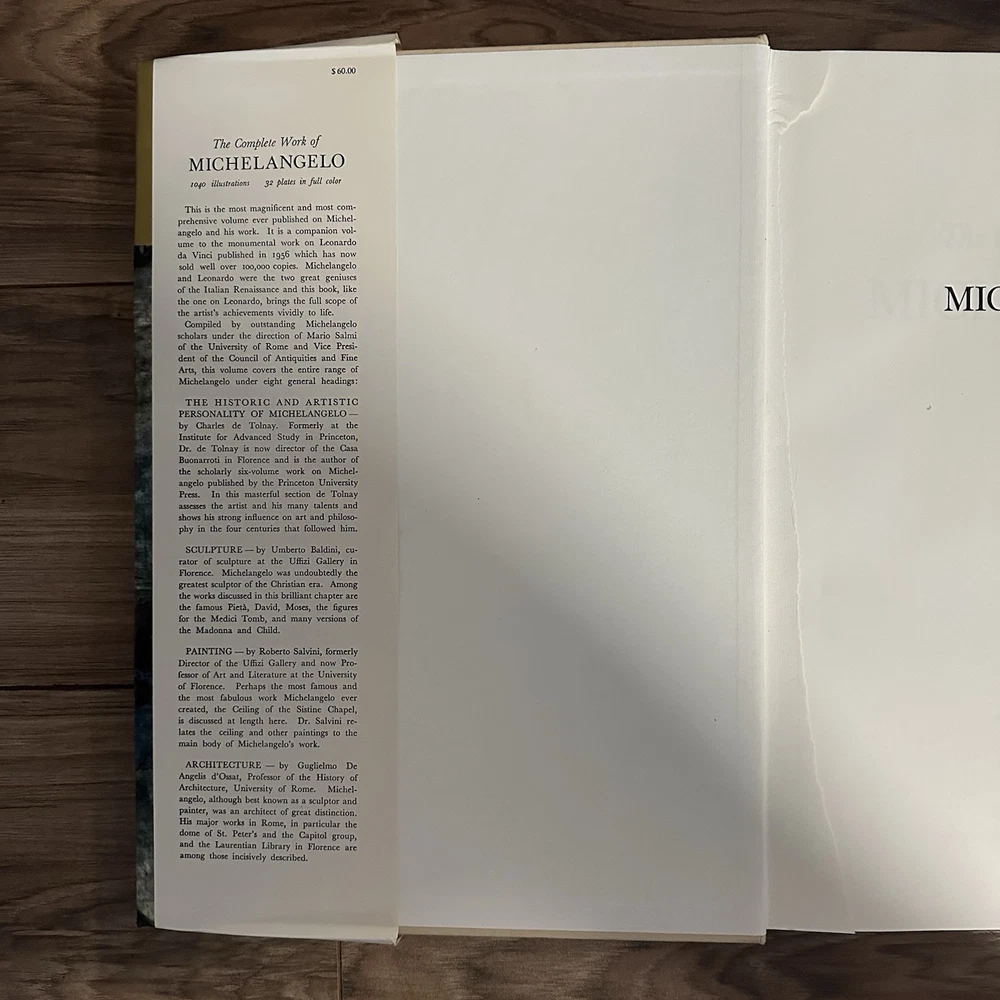 The product is an illustrated hardcover book titled "Complete Work of Michelangelo" by Mario Salmi, published by Reynal and Company. The book focuses on the art of Michelangelo and is written in English. It is a nonfiction narrative that showcases the complete works of the renowned artist, making it a valuable resource for those interested in art and culture. This large book provides a comprehensive overview of Michelangelo's artistic contributions and is likely to appeal to art enthusiasts and scholars alike.