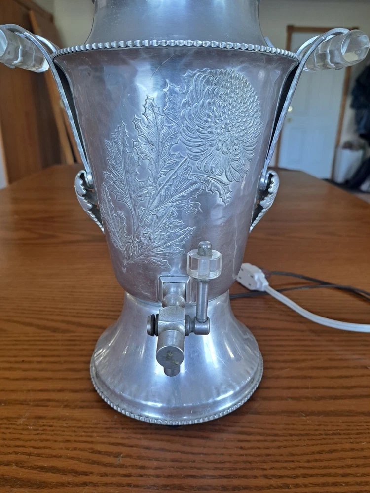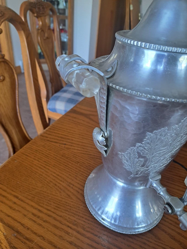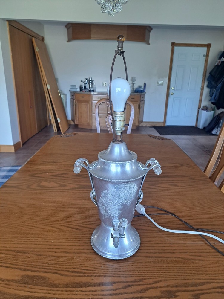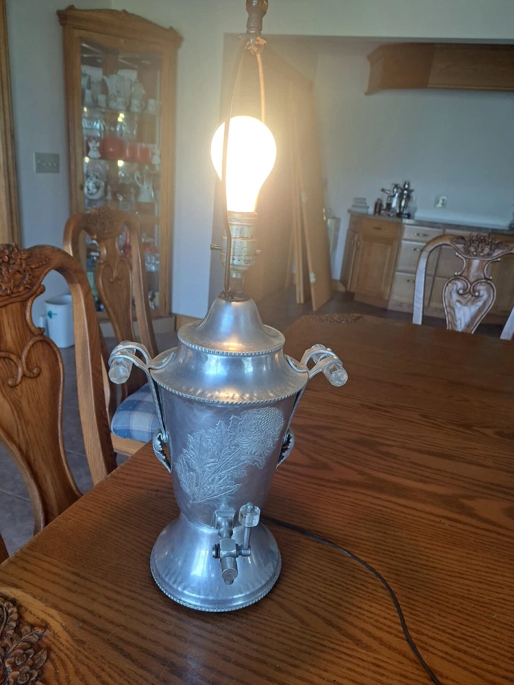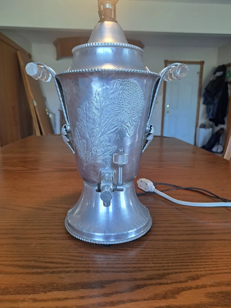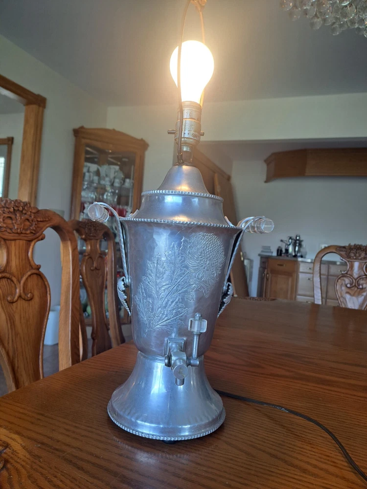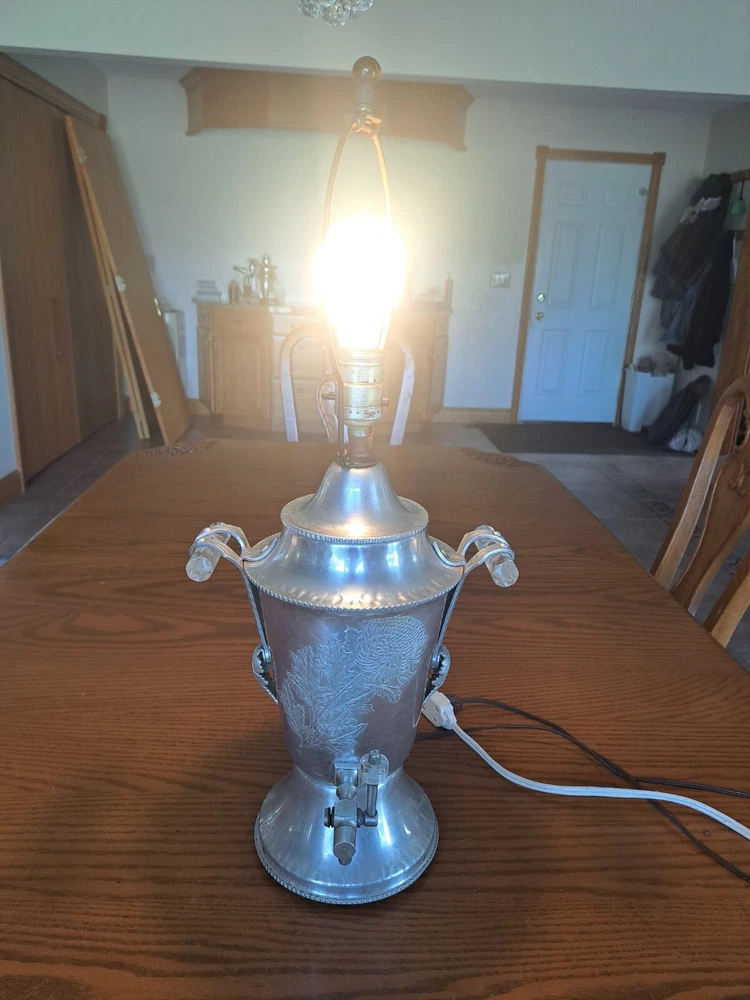 Up for your consideration is this Continental Silver Company creative designed handmade vintage coffee urn table lamp. The lamp is of aluminum & acrylic plastic material with a Chrysanthenmum style floral pattern. It is homemade and very nicely done. It measures 24" tall x about 10" wide.... This a great accent piece for any room.....Great conversation piece. As with any vintage electrical lamps it is suggested to up grade the wiring.