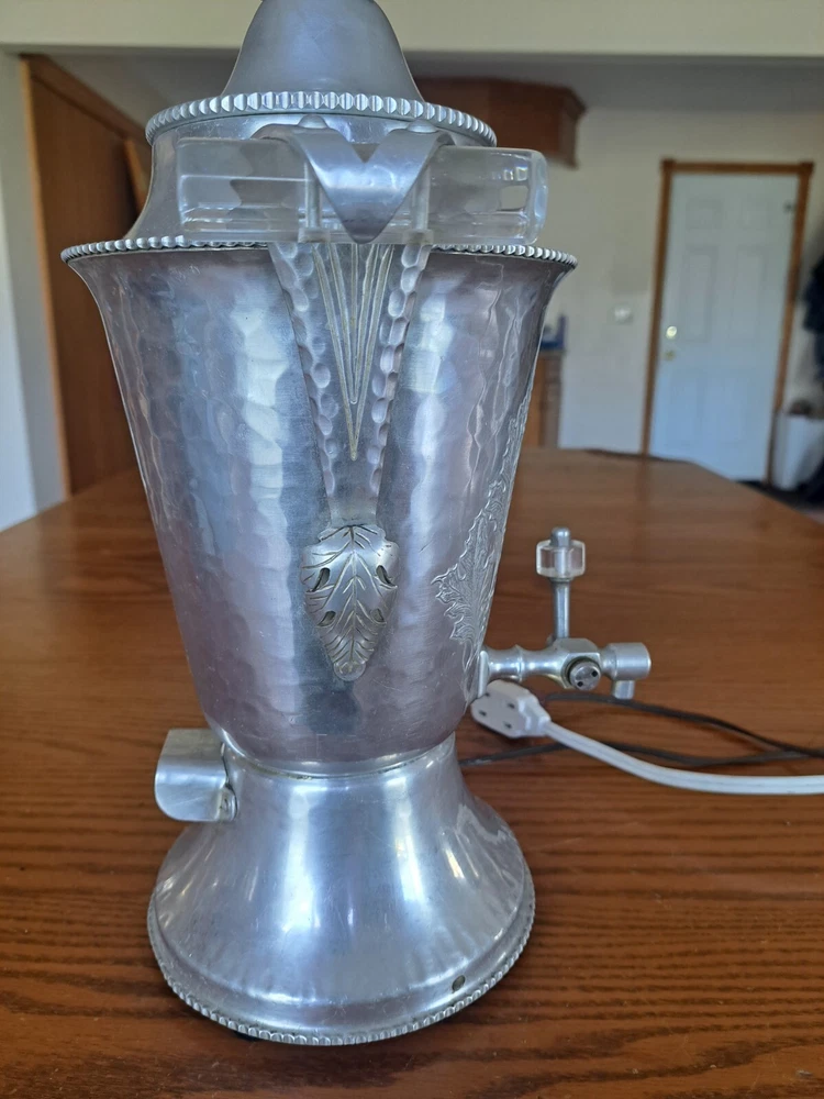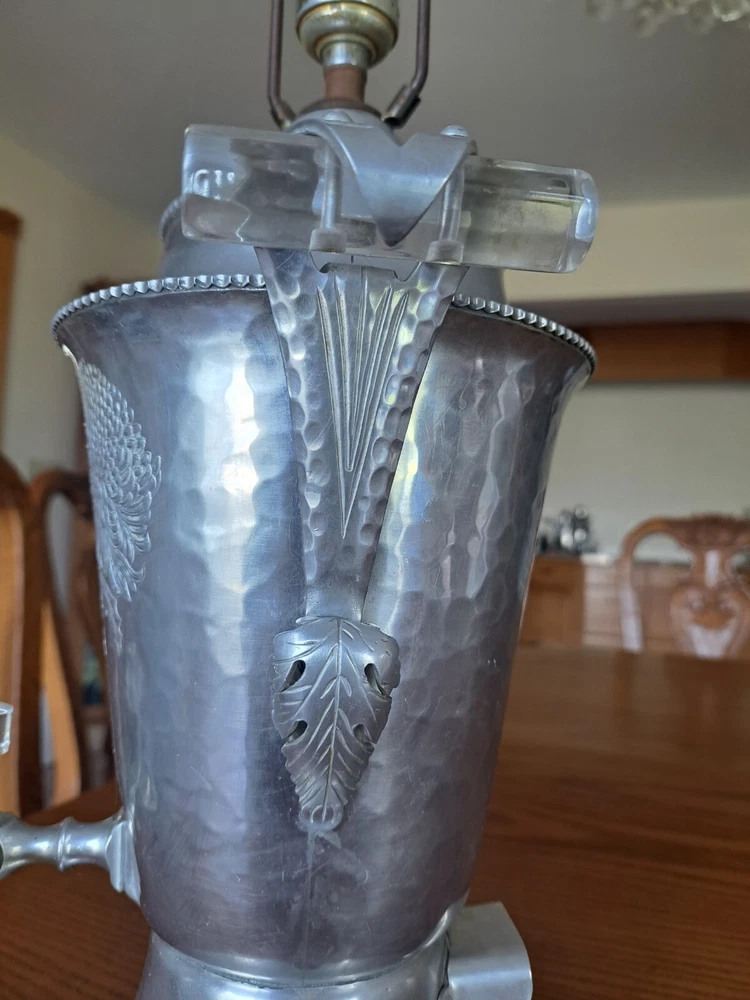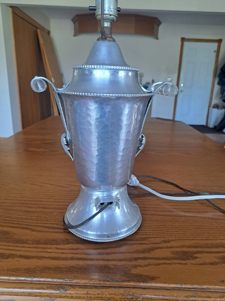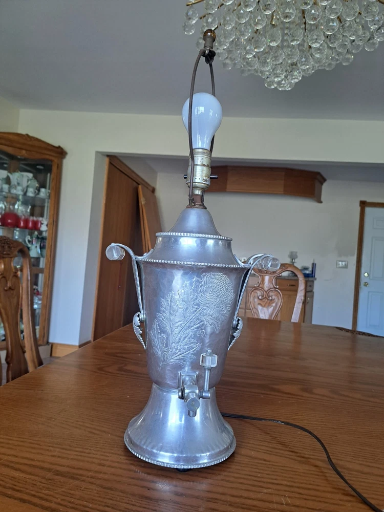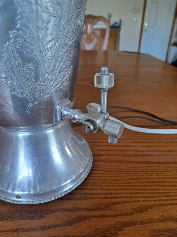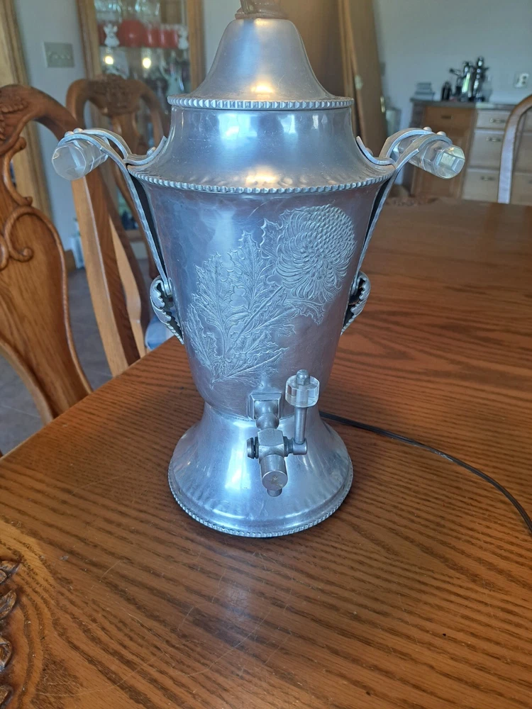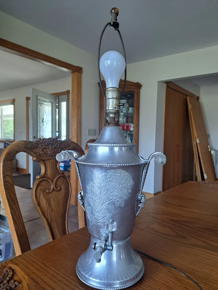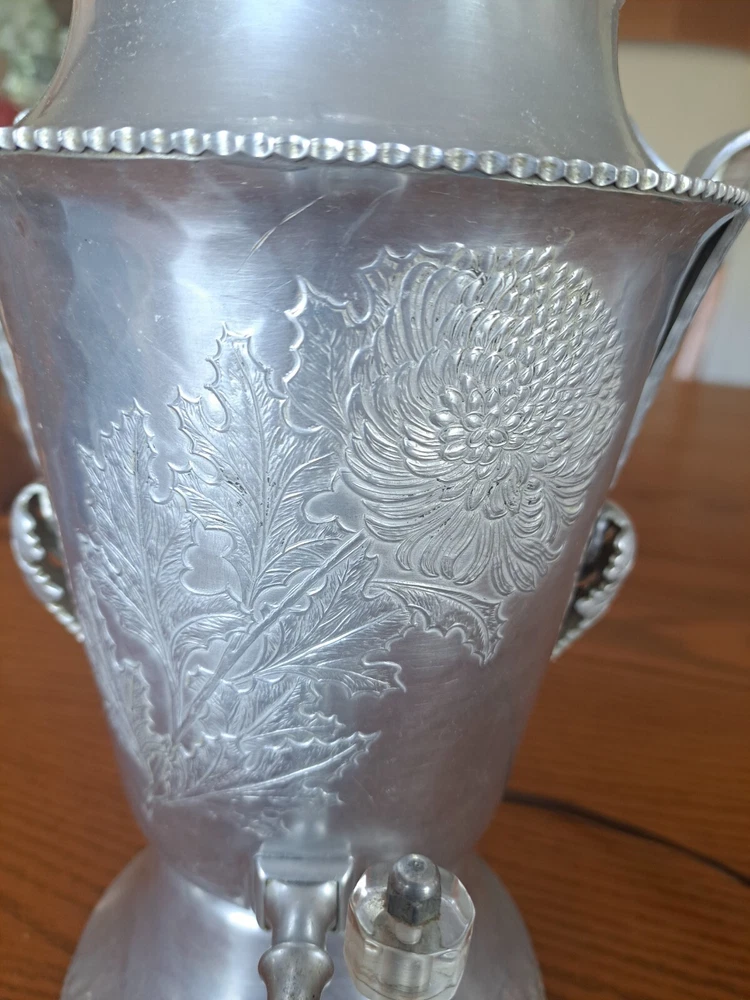 Up for your consideration is this Continental Silver Company creative designed handmade vintage coffee urn table lamp. The lamp is of aluminum & acrylic plastic material with a Chrysanthenmum style floral pattern. It is homemade and very nicely done. It measures 24" tall x about 10" wide.... This a great accent piece for any room.....Great conversation piece. As with any vintage electrical lamps it is suggested to up grade the wiring.