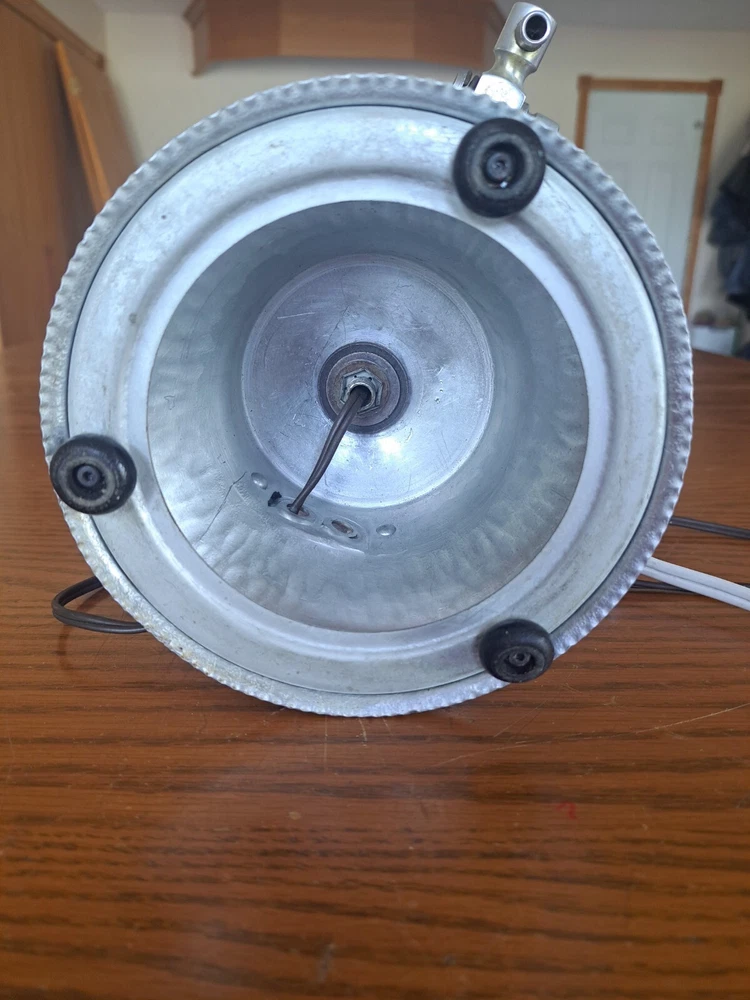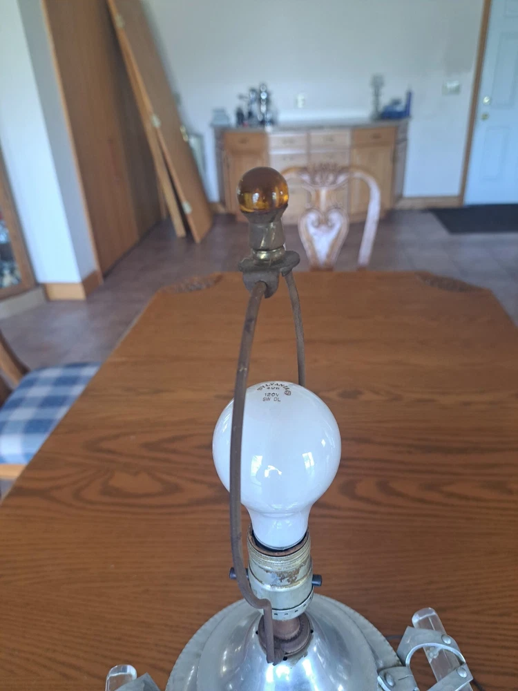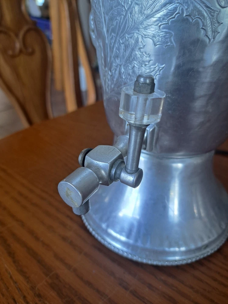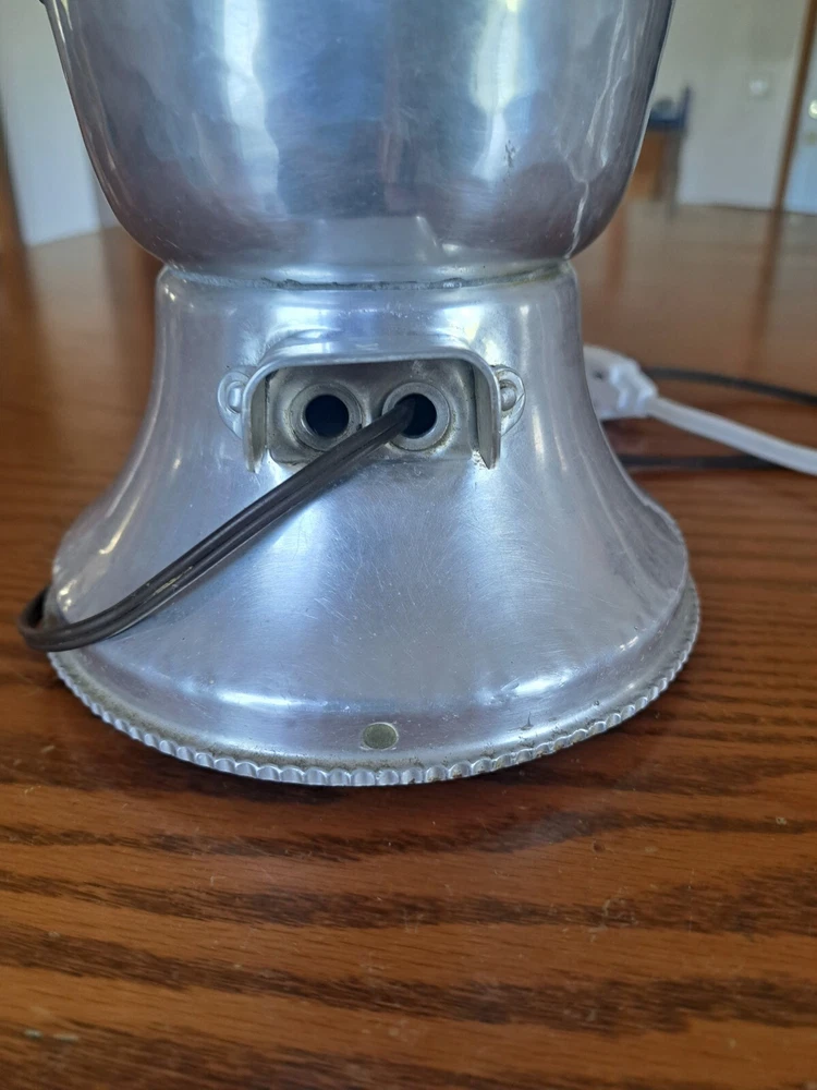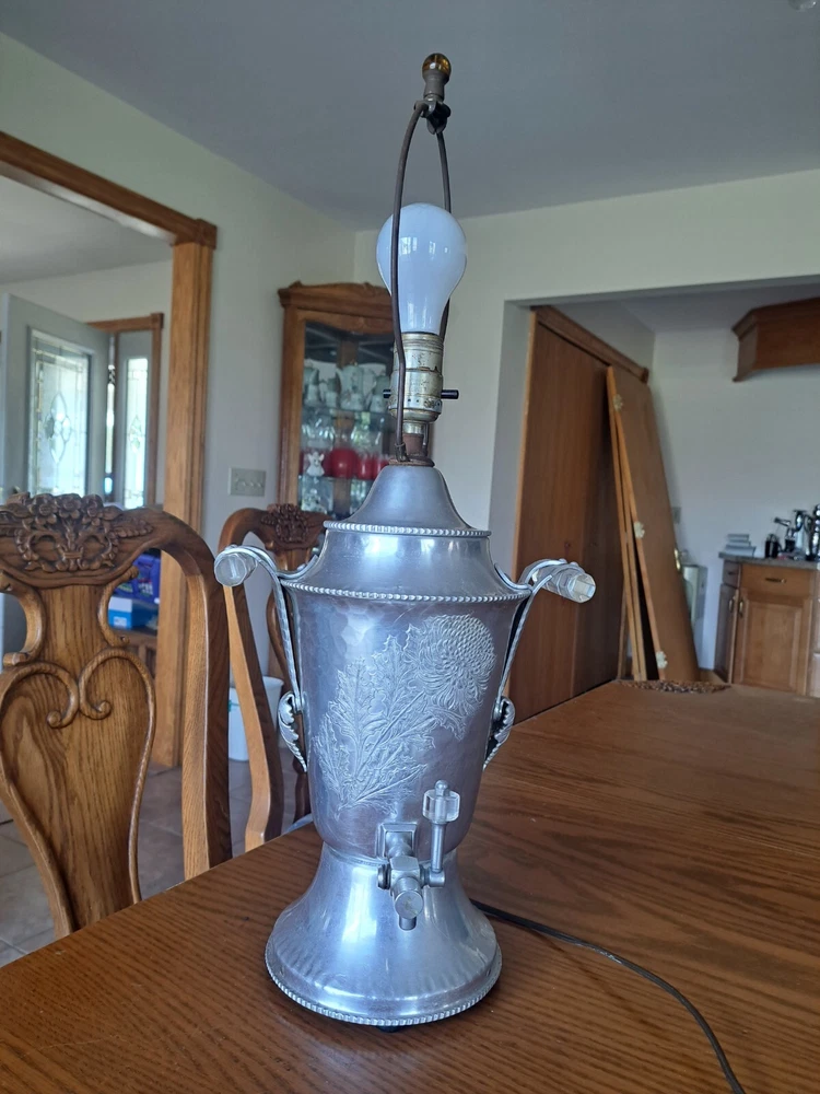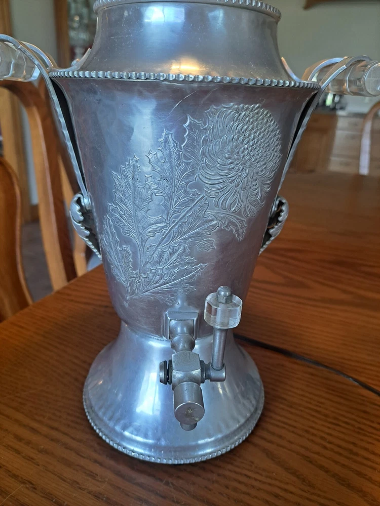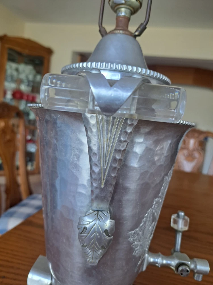 Up for your consideration is this Continental Silver Company creative designed handmade vintage coffee urn table lamp. The lamp is of aluminum & acrylic plastic material with a Chrysanthenmum style floral pattern. It is homemade and very nicely done. It measures 24" tall x about 10" wide.... This a great accent piece for any room.....Great conversation piece. As with any vintage electrical lamps it is suggested to up grade the wiring.