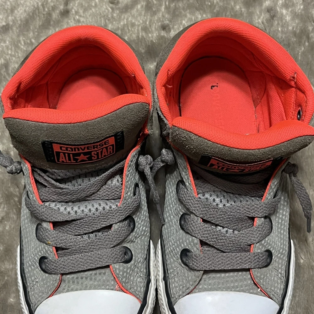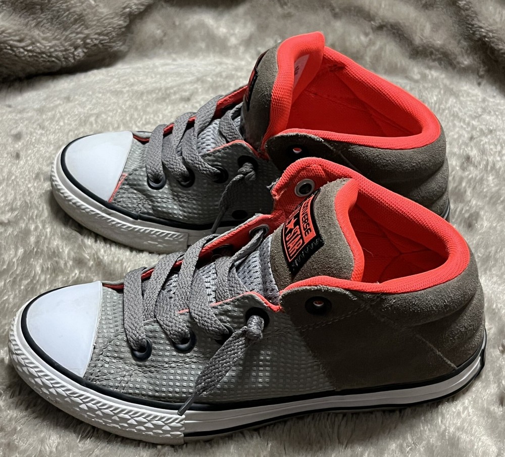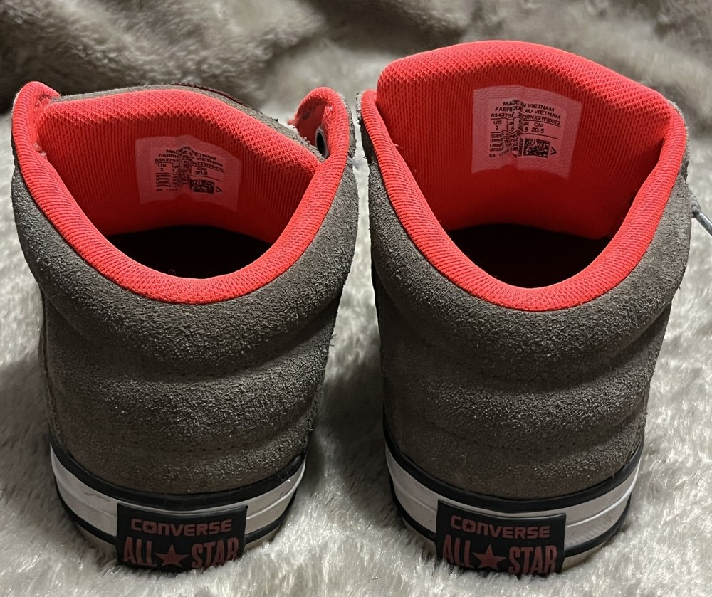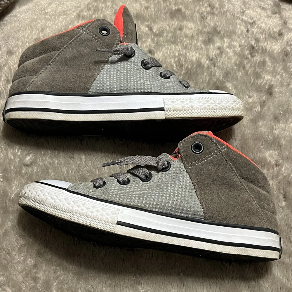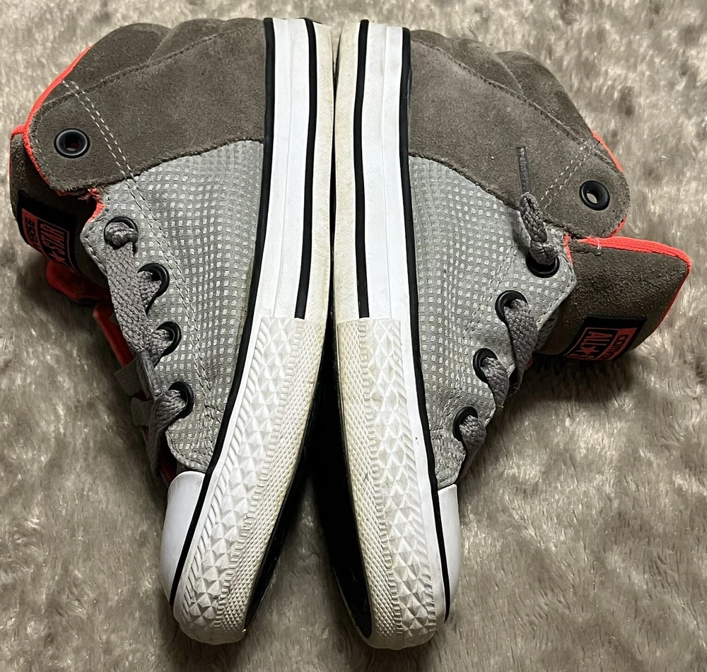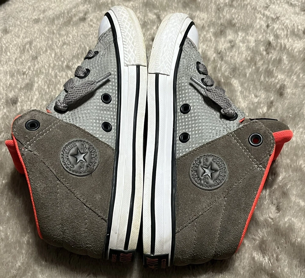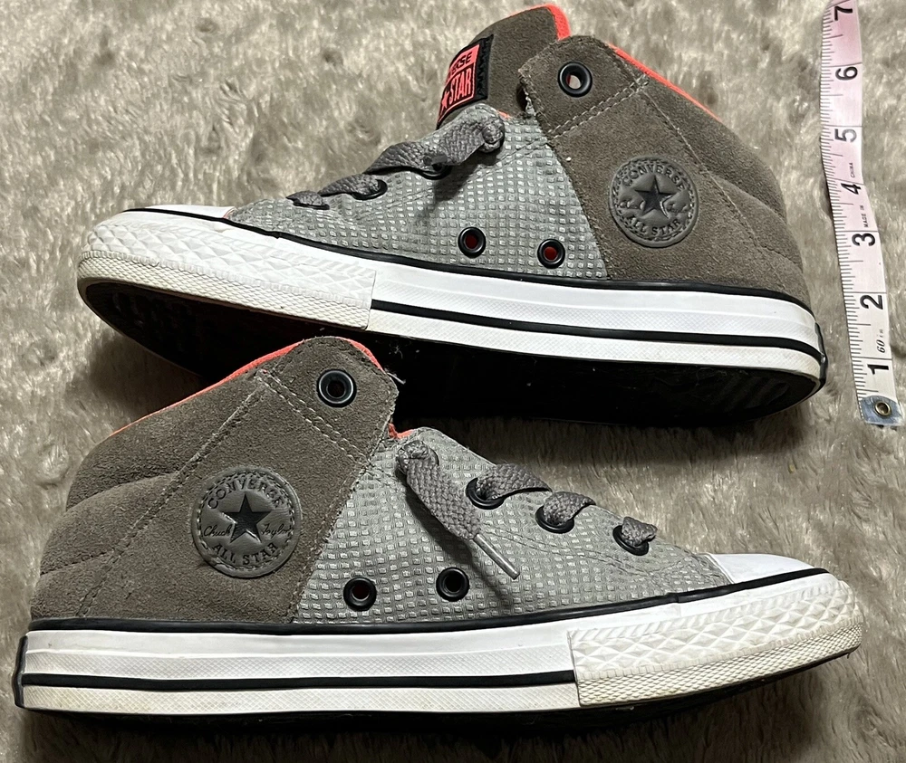 Converse Chuck Taylor All Star Axel Mid Sneakers Gray Orange Unisex Junior Sz 2 EUC Shoes are pre owned in excellent condition Please see listing photos to evidence item condition Elevate your little one's style with these Converse Chuck Taylor All Star Axel Mid Sneakers. The sneakers come in a unique gray and orange color combination that is perfect for any casual or athletic outfit. They feature a round toe shape and a mid-top shoe shaft style, with a flat heel height that makes them comfortable for walking, school, basketball, and sports. These sneakers are perfect for unisex kids who love colorful and trendy footwear. They are made of high-quality textile material and have a standard shoe width that fits most children's feet. Get your hands on these stylish sneakers and let your child make a fashion statement.