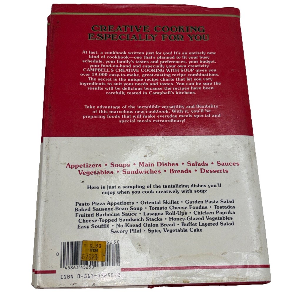The "Campbell's Creative Cooking With Soup" cookbook, published in 1985, is a vintage collectible featuring a variety of recipes focused on using Campbell's soups as a base for creative and delicious dishes. Written by Campbells and published by the Campbell Soup Company, this hardcover cookbook is a part of the Campbell Cookbook series and is a valuable addition to any cookbook collection. With its nostalgic charm and timeless cooking tips, this cookbook is sure to inspire home cooks to explore new culinary creations with a classic twist.